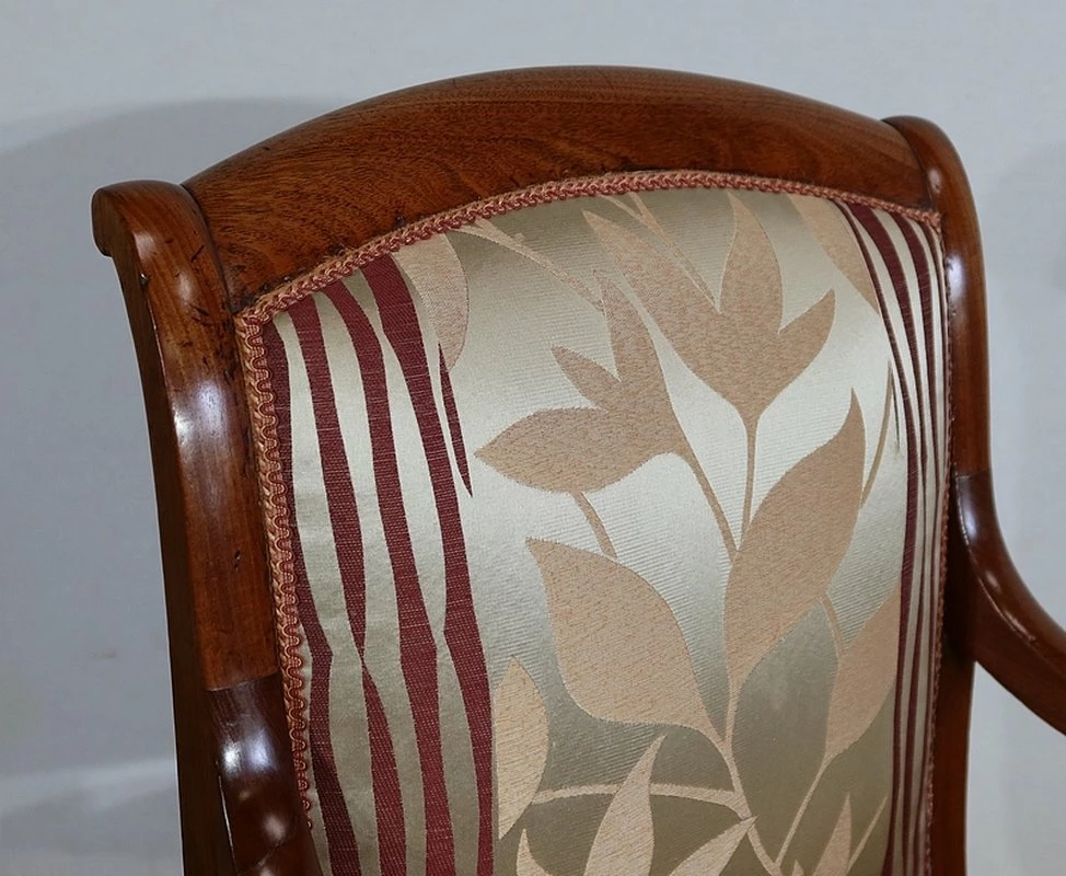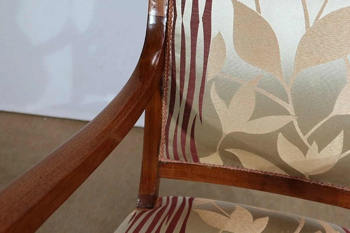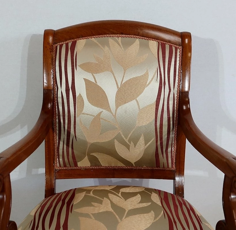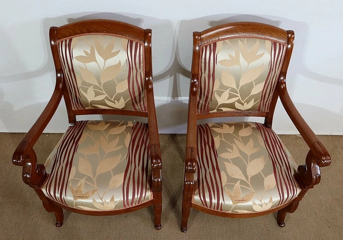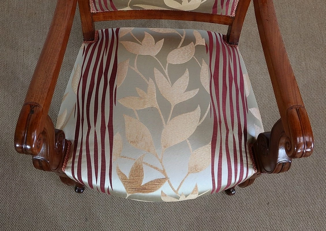 The seats in excellent condition have been redone with the old with straps, springs and horsehair. They are covered with a slightly silver-bottomed fabric with foliage and stylized patterns, surrounded by edging and stripes.