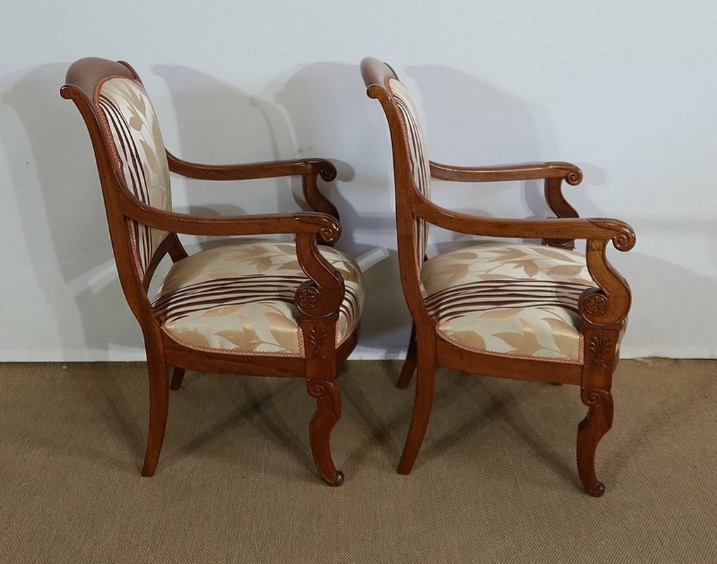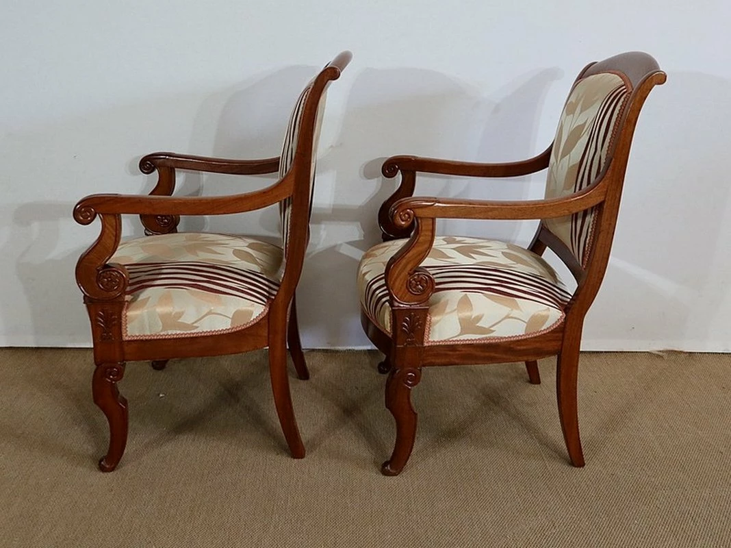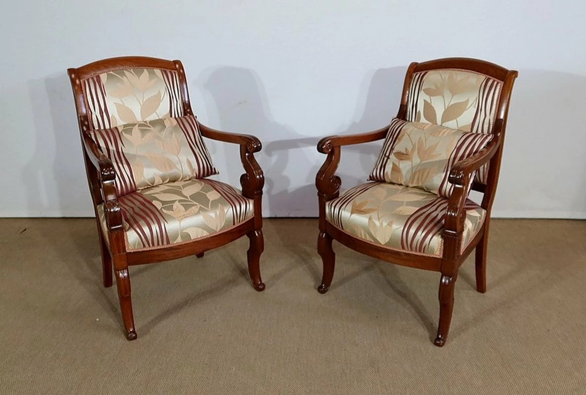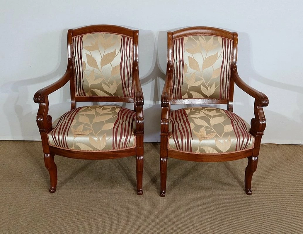 The seats in excellent condition have been redone with the old with straps, springs and horsehair. They are covered with a slightly silver-bottomed fabric with foliage and stylized patterns, surrounded by edging and stripes.