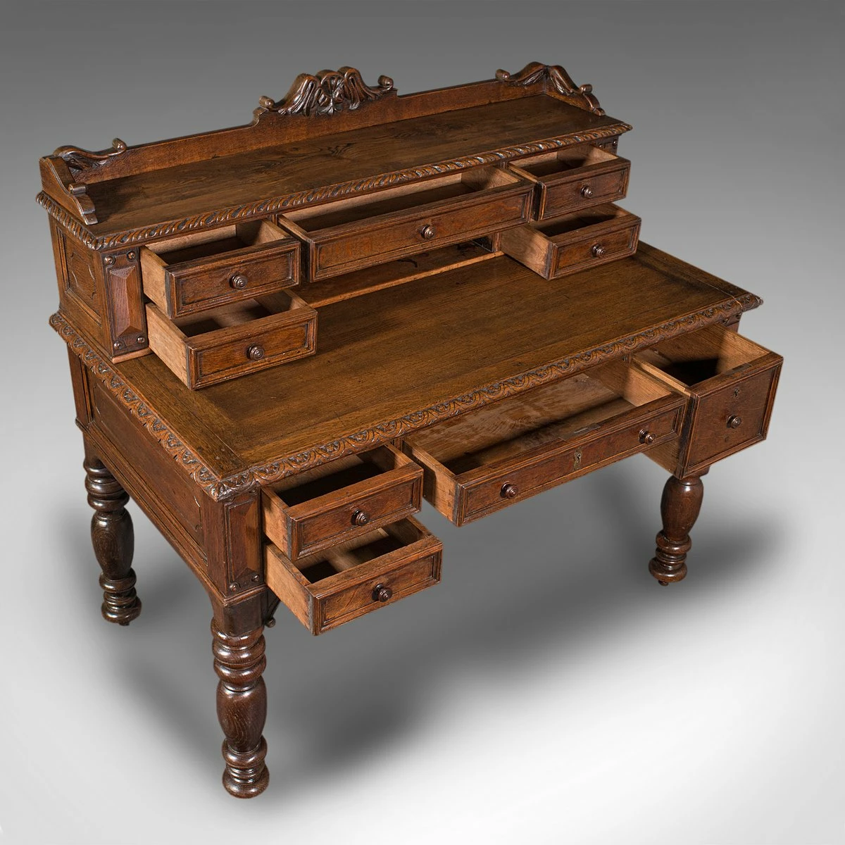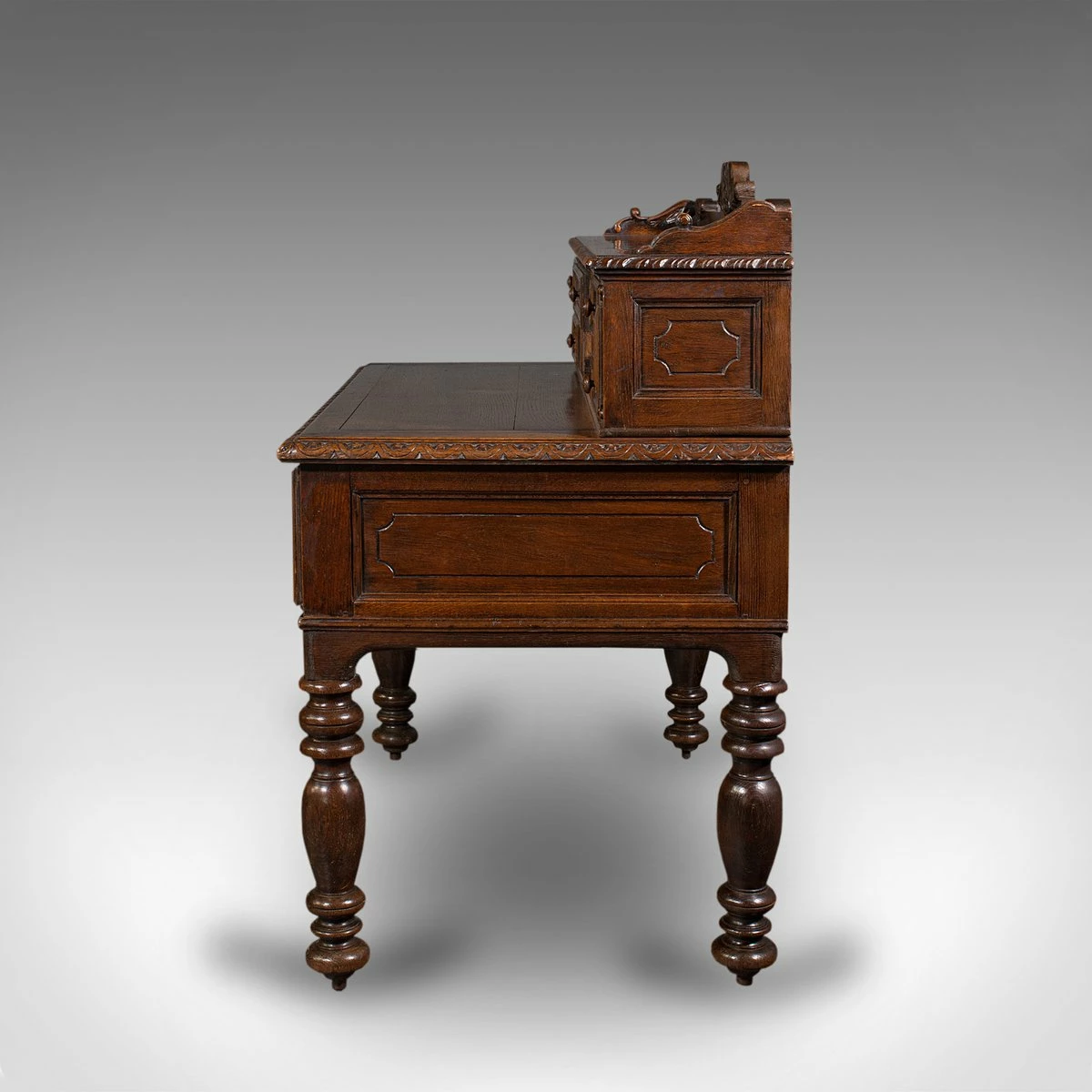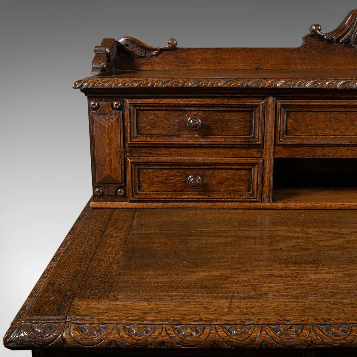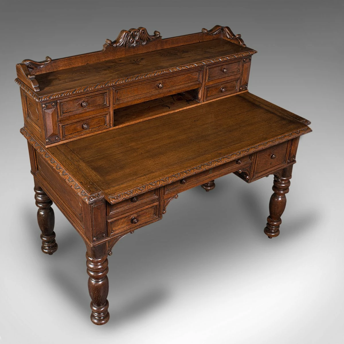 This is a dashing antique carved correspondence desk, offering the delight of a hidden compartment and fascinating extending writing surface. Solid joints and construction, delivered waxed, polished and ready for the home.