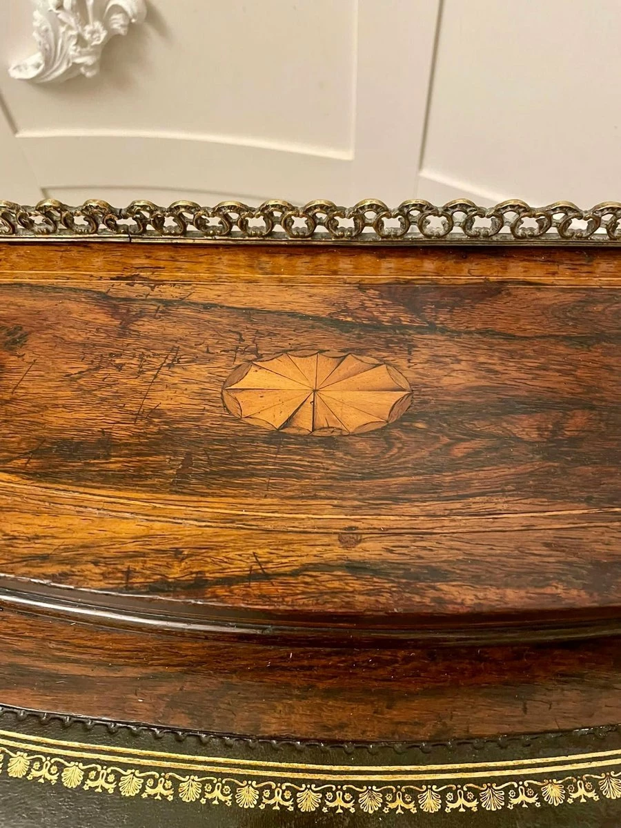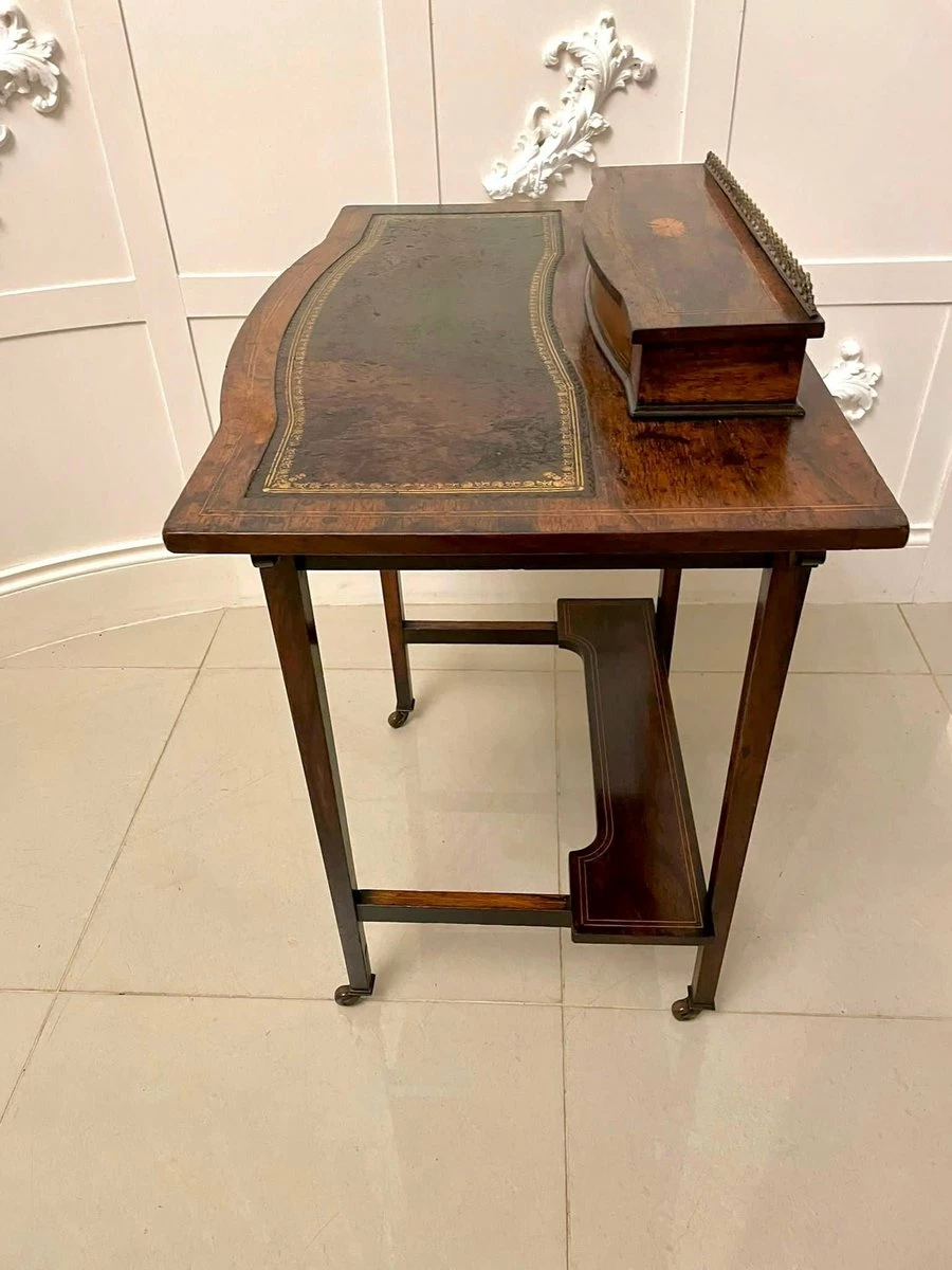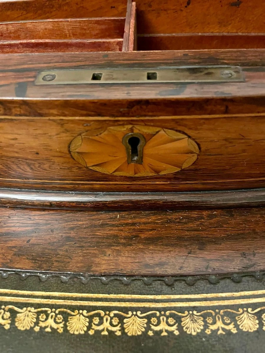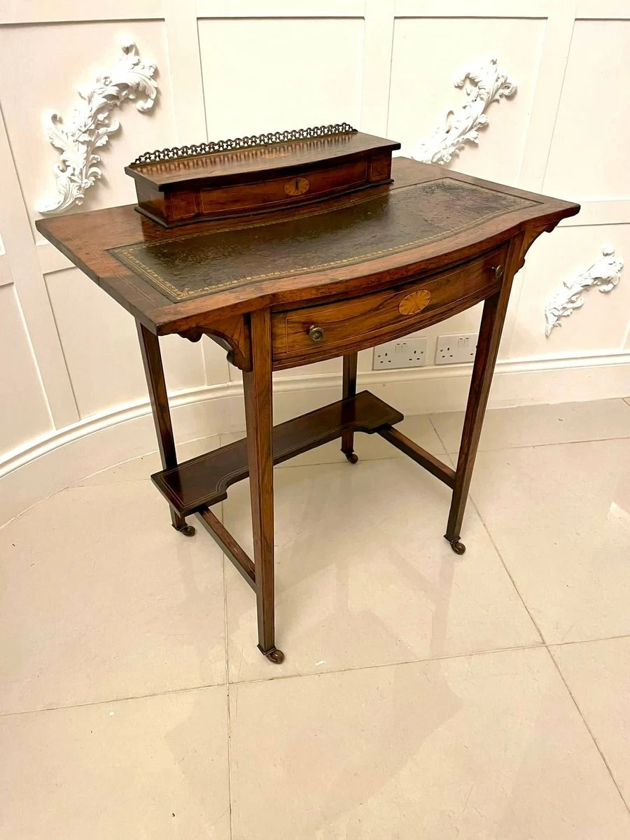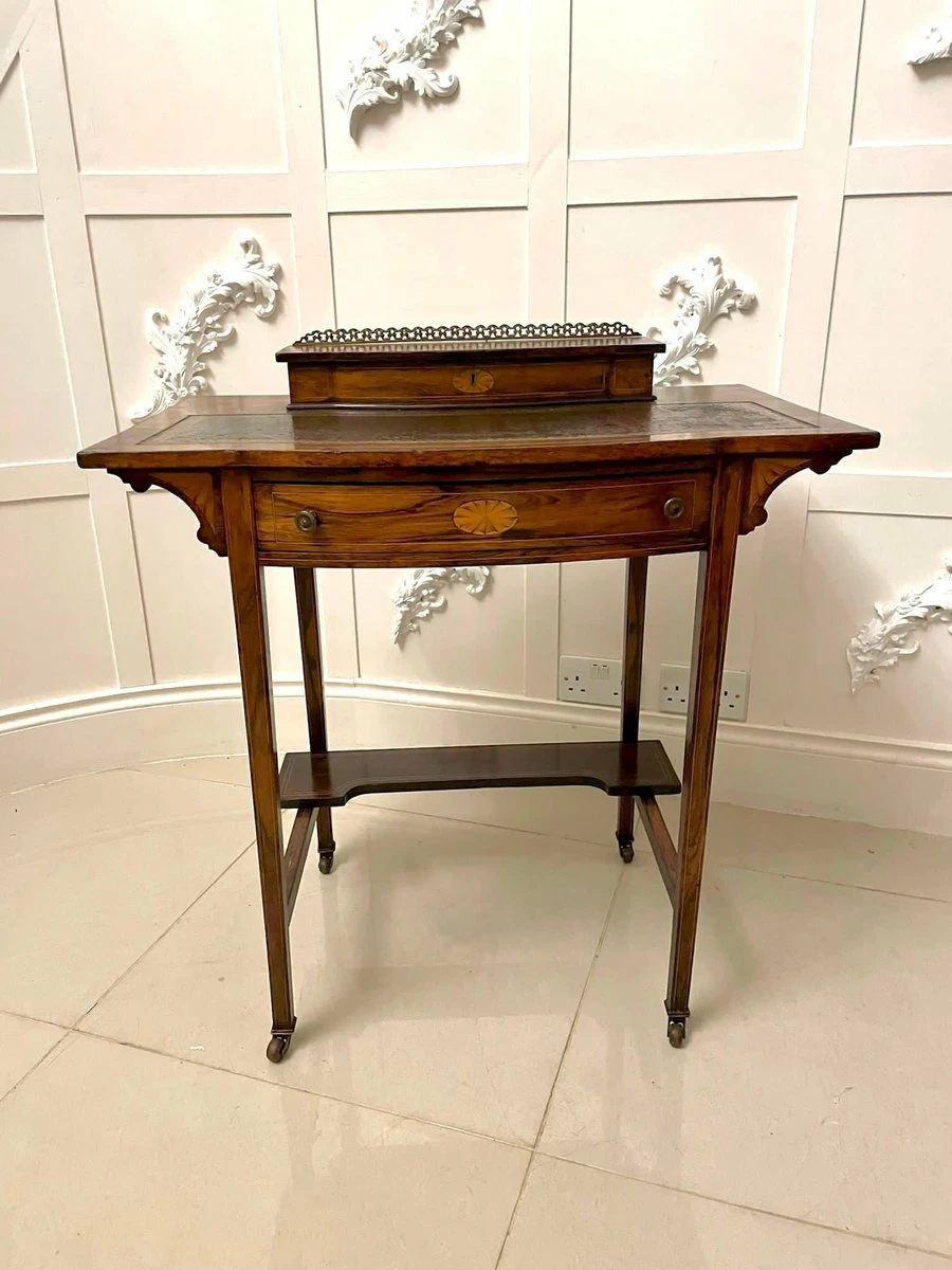 Antique Edwardian quality rosewood inlaid bow fronted writing table having the original brass gallery above a lift up lid opening to reveal a fitted interior, original leather writing surface crossbanded in rosewood, bow fronted rosewood inlaid shaped drawer with original brass knobs and shaped brackets standing on square tapering inlaid rosewood legs with original castors, united by square stretchers with a rosewood undertier. Measures: H 82.5 x W 75.5 x D 46cm 73.5cm to the fall Date 1900.