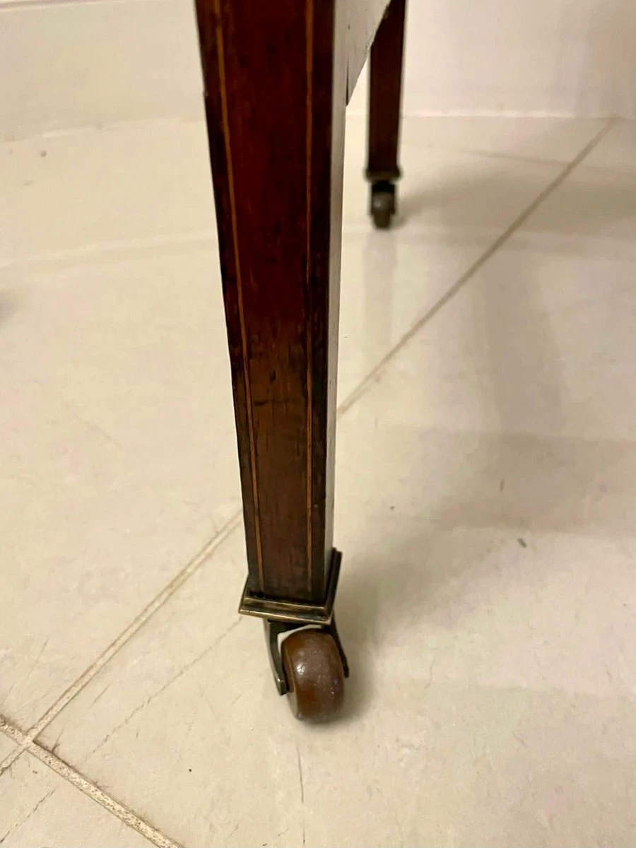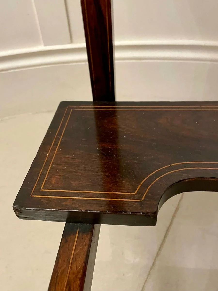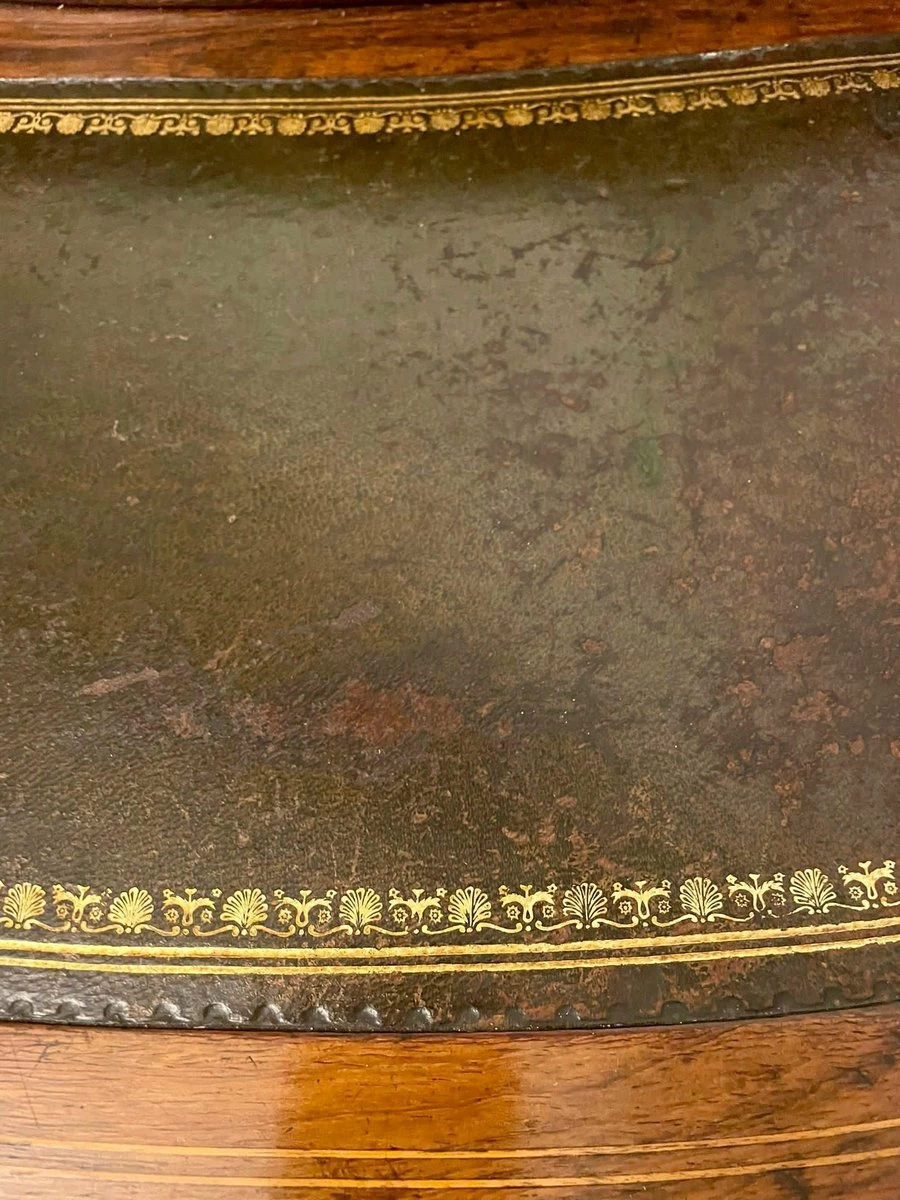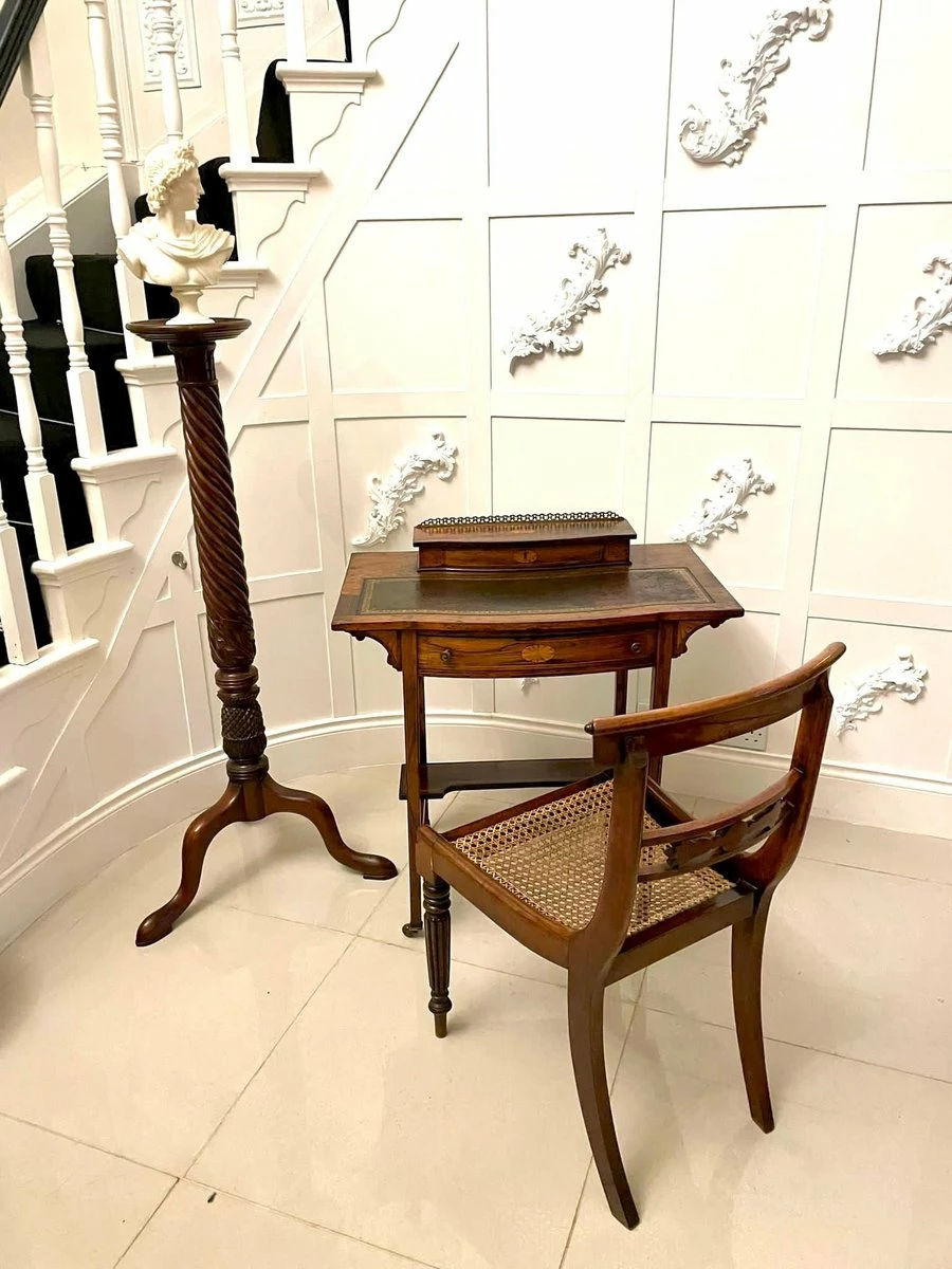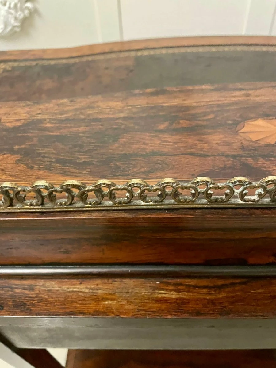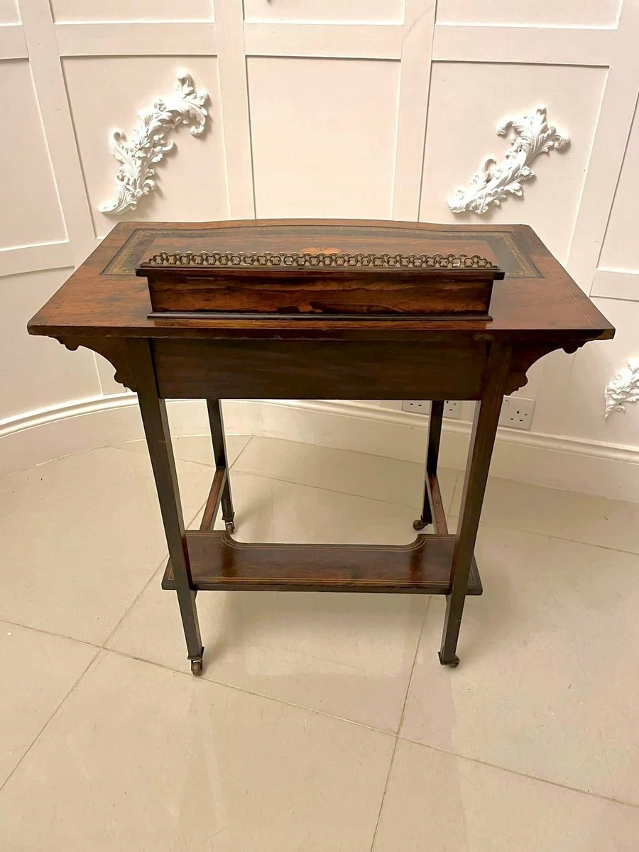 Antique Edwardian quality rosewood inlaid bow fronted writing table having the original brass gallery above a lift up lid opening to reveal a fitted interior, original leather writing surface crossbanded in rosewood, bow fronted rosewood inlaid shaped drawer with original brass knobs and shaped brackets standing on square tapering inlaid rosewood legs with original castors, united by square stretchers with a rosewood undertier. Measures: H 82.5 x W 75.5 x D 46cm 73.5cm to the fall Date 1900.