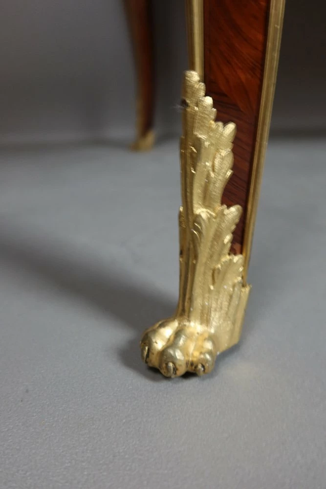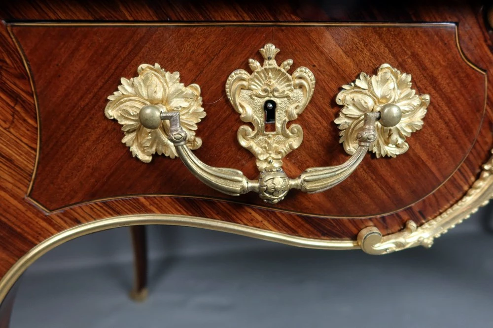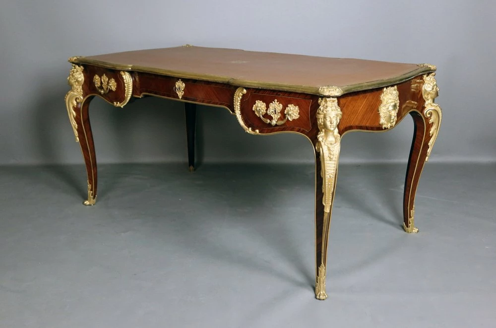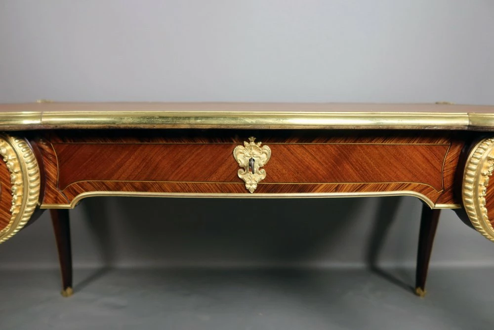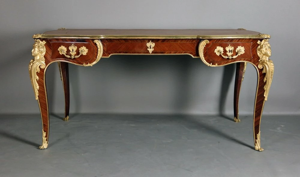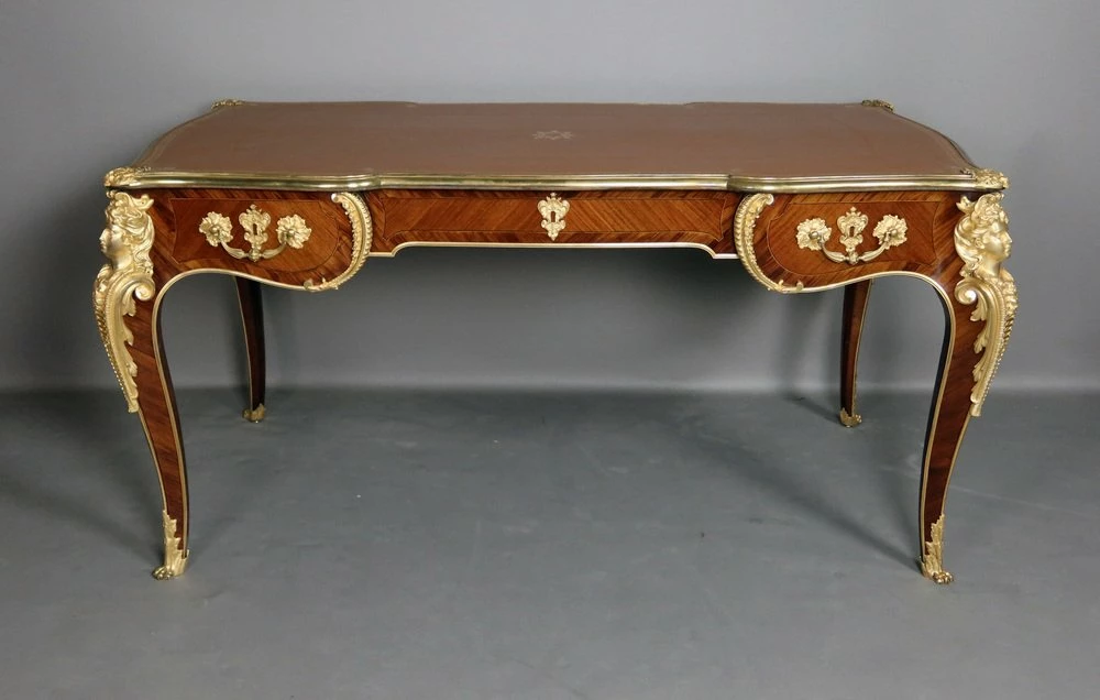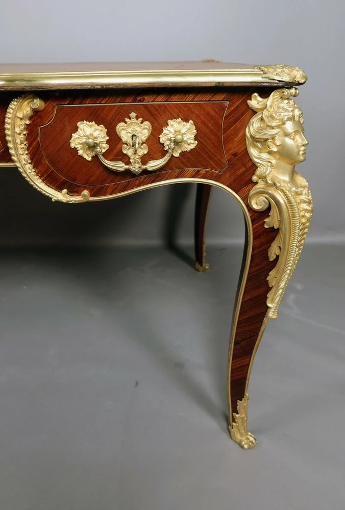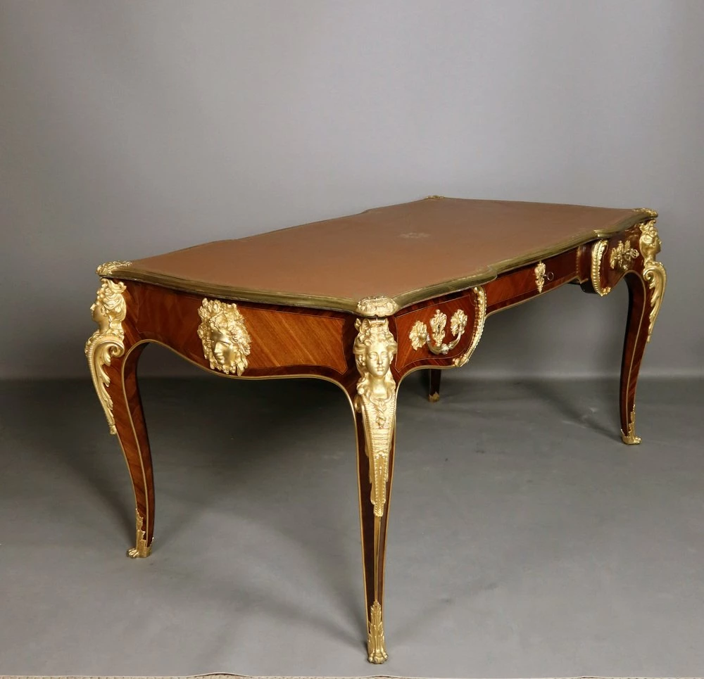 Very beautiful Louis XV style office of the 19th century, according to a model of Charles cresse made of placing wood. He opens at the front by three drawers. This office is decorated with four Spanish in gilded bronze. Each of the feet is slightly arched ending with gilded bronze hooves. The tray, is surrounded by a lean also made of gilded bronze, has been sheathed with a Havana -colored leather engraved with an old -fashioned wheel. This office is double face, the visitor side also presents a rich decor.