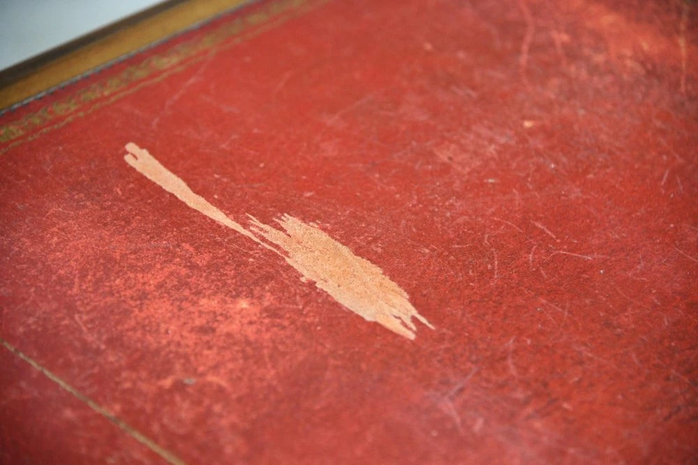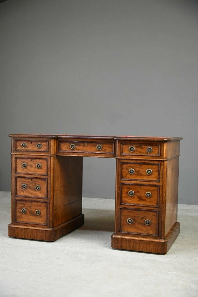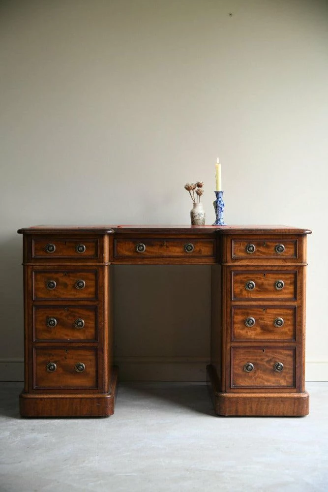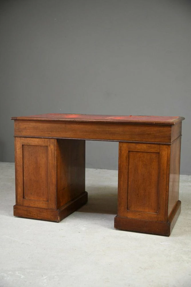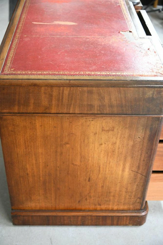 Antique Mahogany Twin Pedestal Desk. Late 19th Century mahogany small desk, central kneehole with single drawer above, each pedestal with four short drawers with ring handles on plinth base, tooled red leather skiver. Dimensions: 122 x 65cm x 79cm high, the kneehole measures 42cm x 63.5cm Condition: Solid condition, age and wear to the skiver with patches of damage.