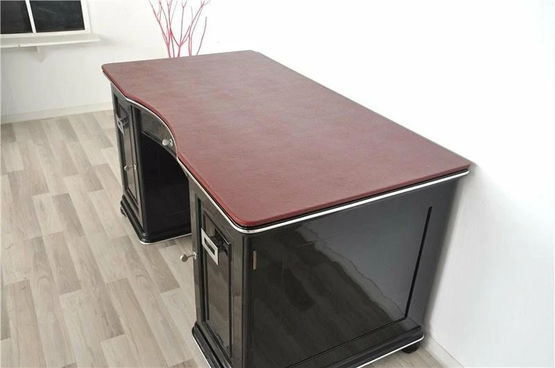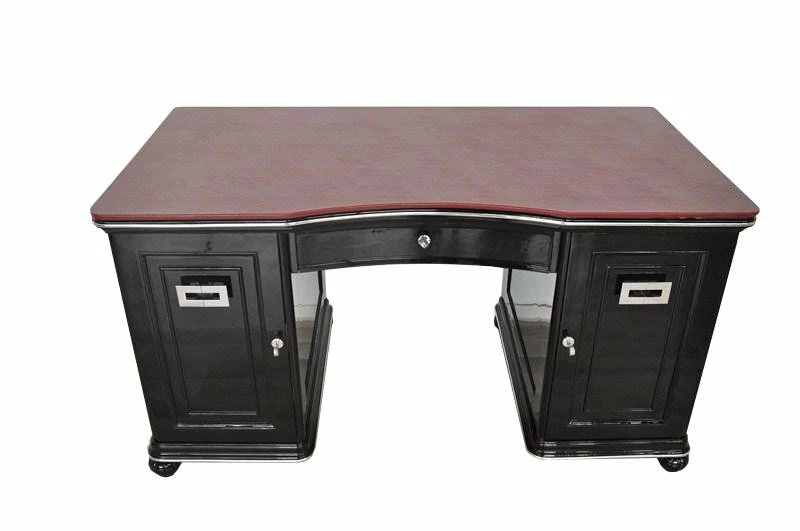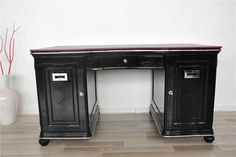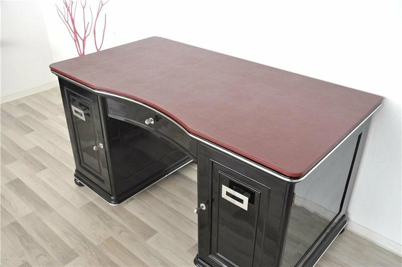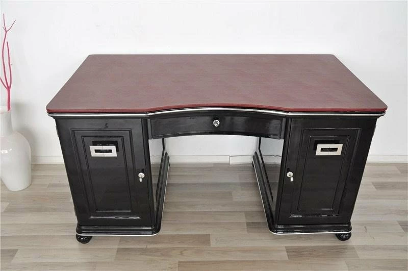 Wonderful Art Deco desk with an eye-catching Bordeaux red leather plate on top. with a cut out for optimal seating position. The doors offer beautifully carved ornamentations and unique chrome handles. wonderful leather plate in Bordeaux red lockable doors and drawer restored with only high-quality materials – made in Germany Dimensions 70 × 150 × 77 cm