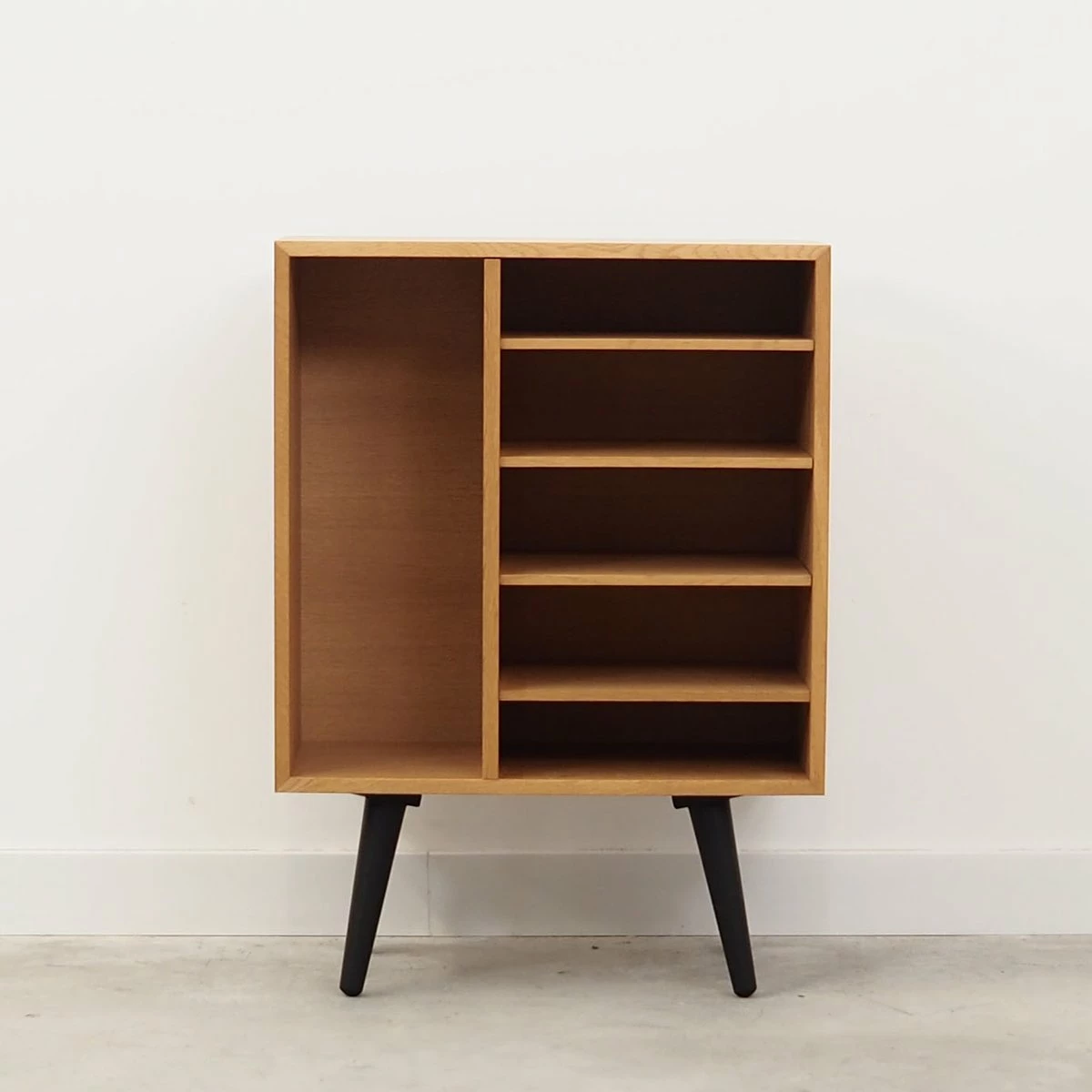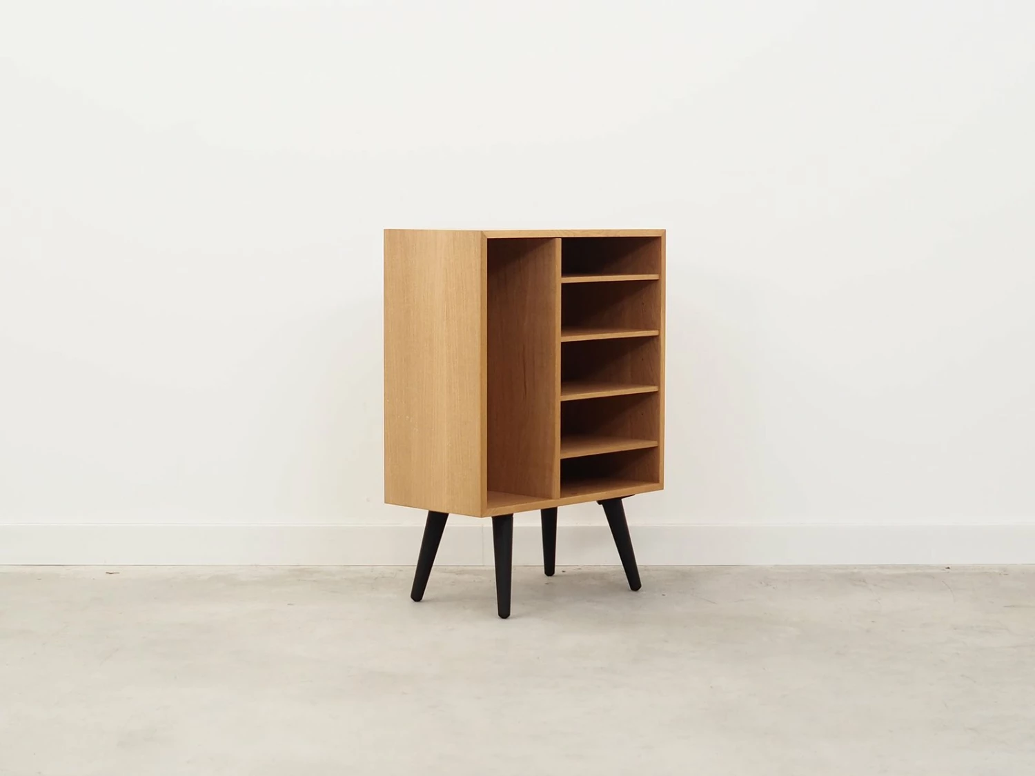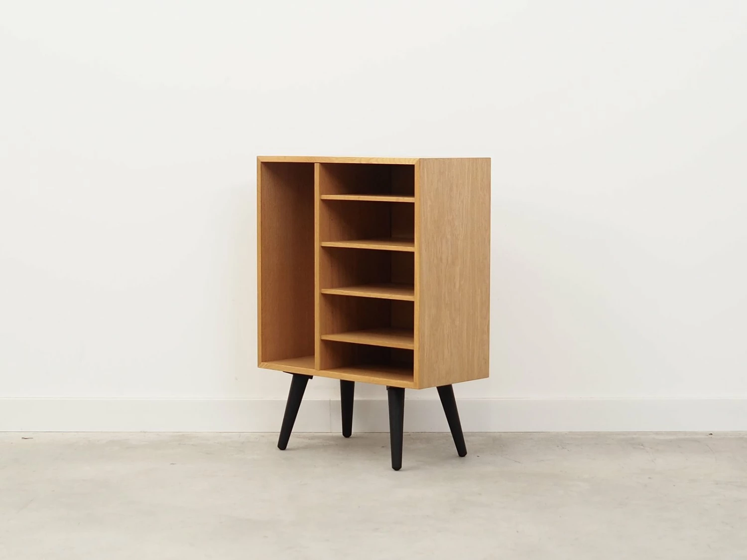 The structure is covered with ash veneer. Legs made of solid wood, stained black. The surface after refreshing. Inside the space was filled with four practical shelves with adjustable height. The bookcase is a perfect solution for storing a collection of books in a small living space. Additionally it will be perfect as a bookcase for collector’s items.