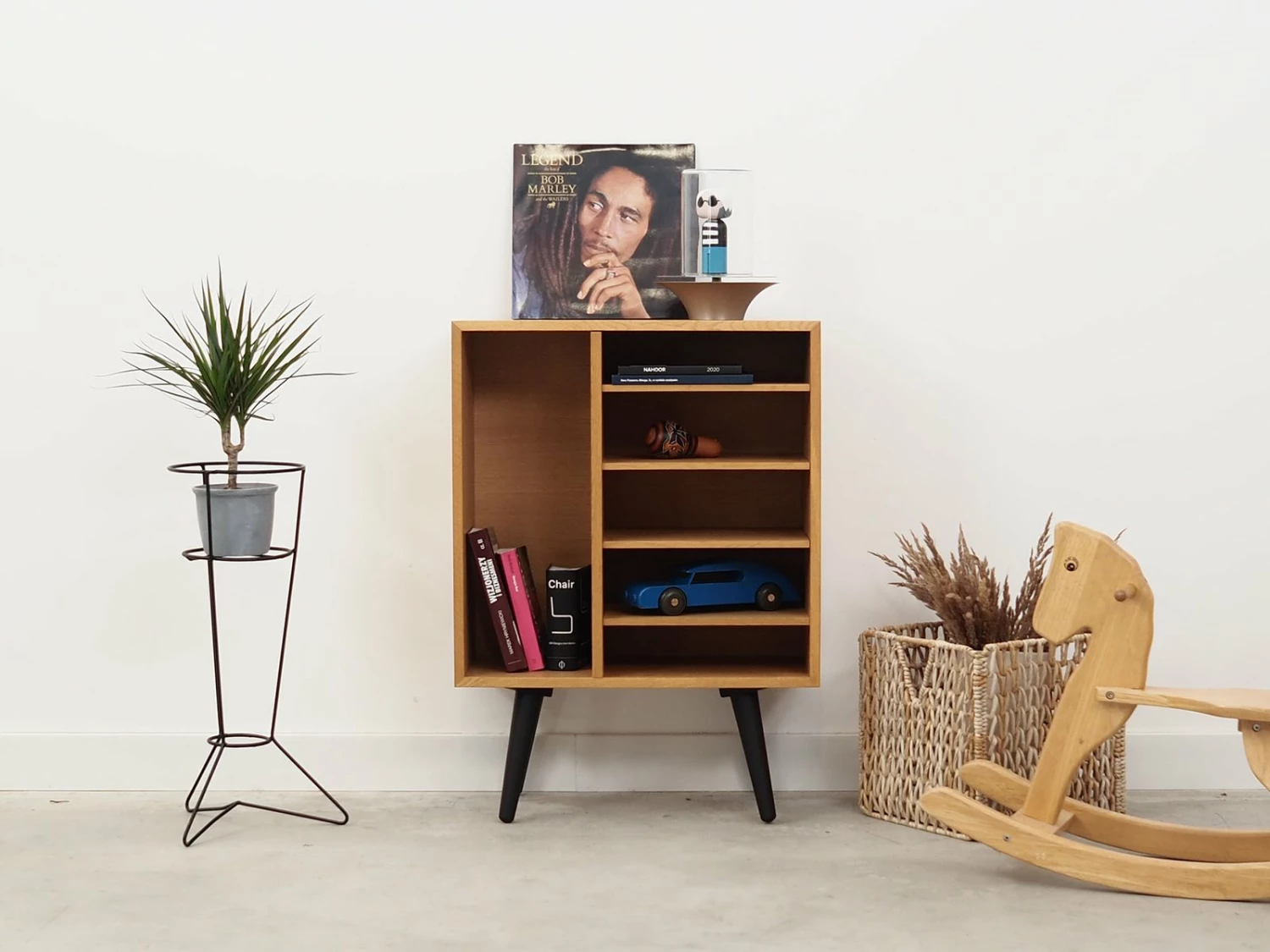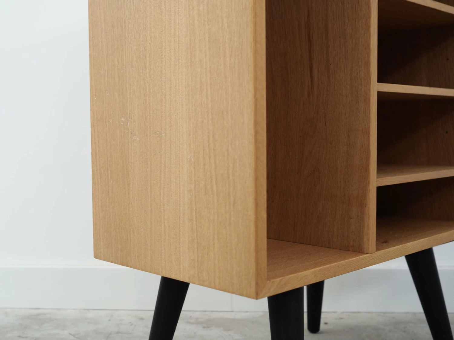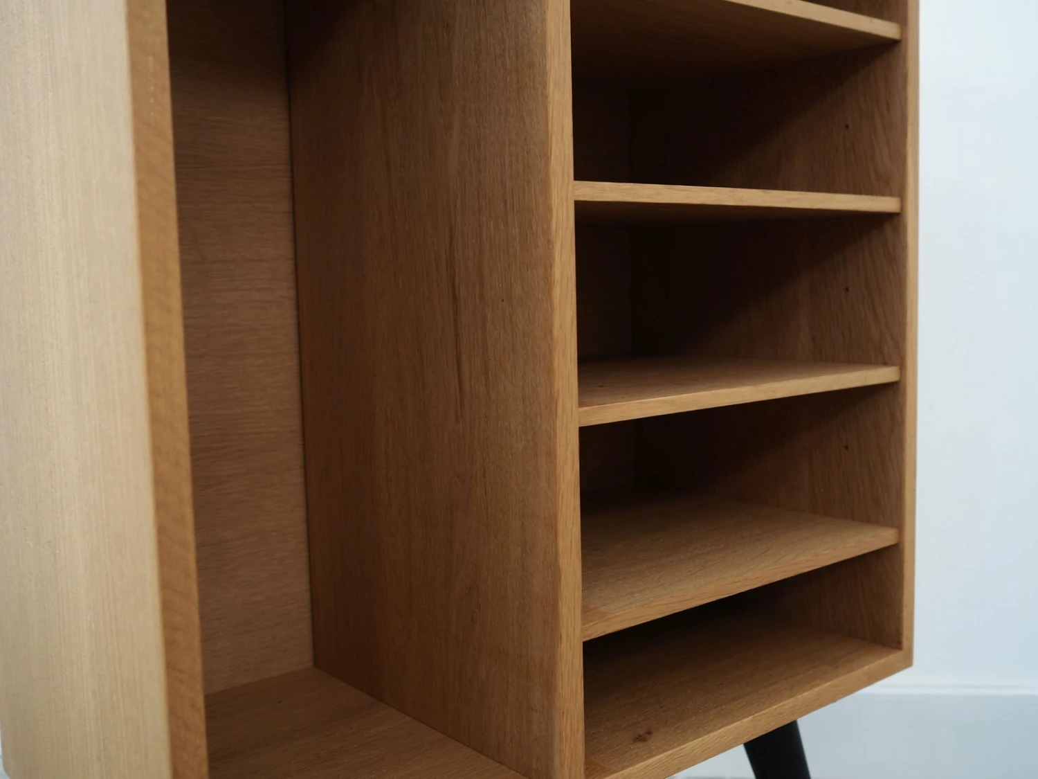 The structure is covered with ash veneer. Legs made of solid wood, stained black. The surface after refreshing. Inside the space was filled with four practical shelves with adjustable height. The bookcase is a perfect solution for storing a collection of books in a small living space. Additionally it will be perfect as a bookcase for collector’s items.