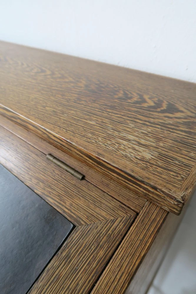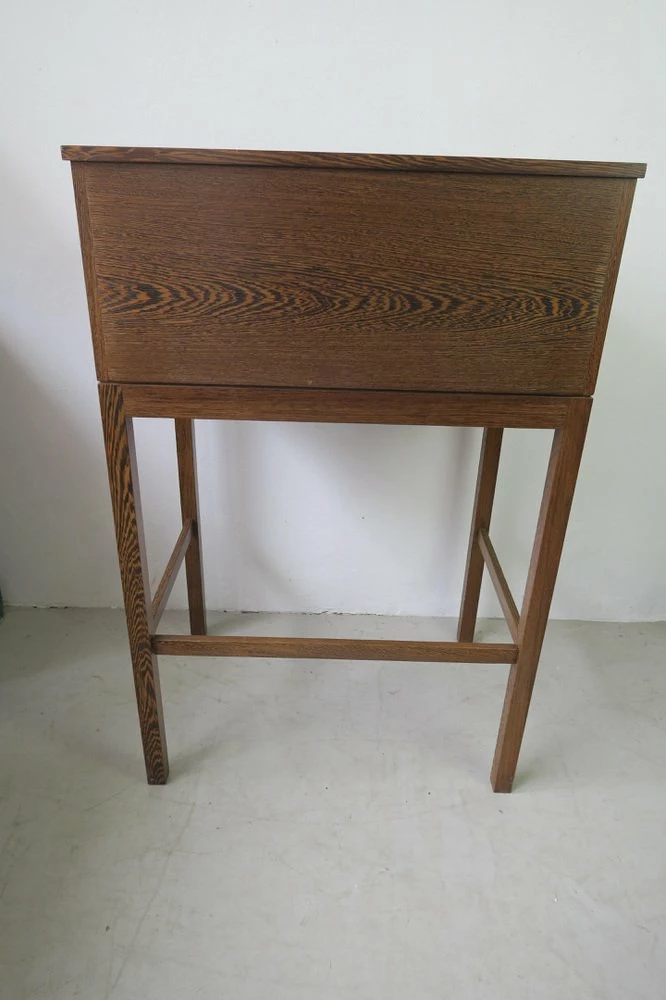 The writing surface can be folded up and offers further storage space. The associated stool is made of the same wood. Manufacturers and designers are unknown.