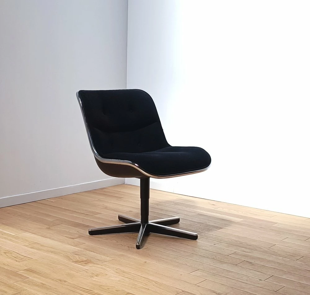 Metal structure and seat and padded back in black fabric.
