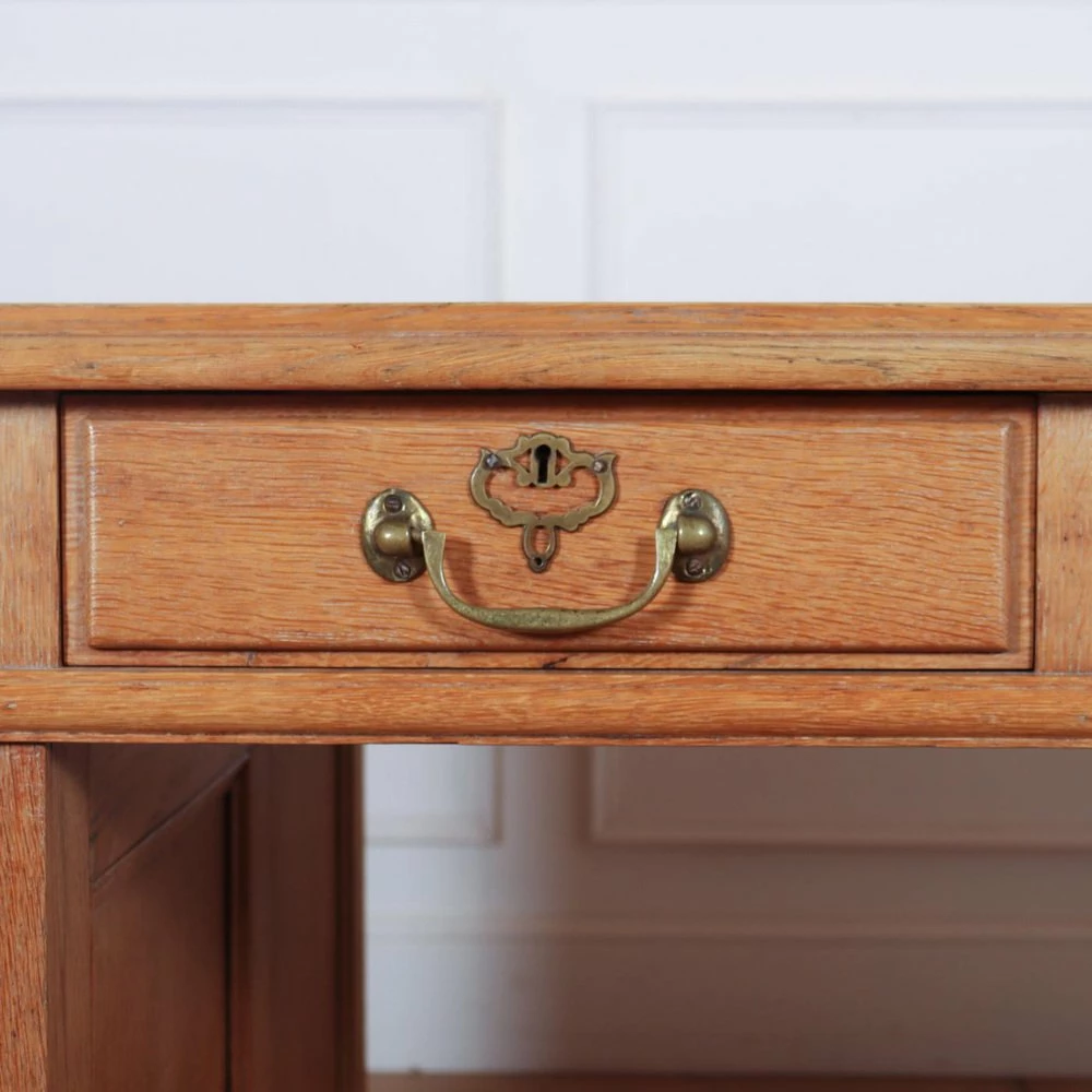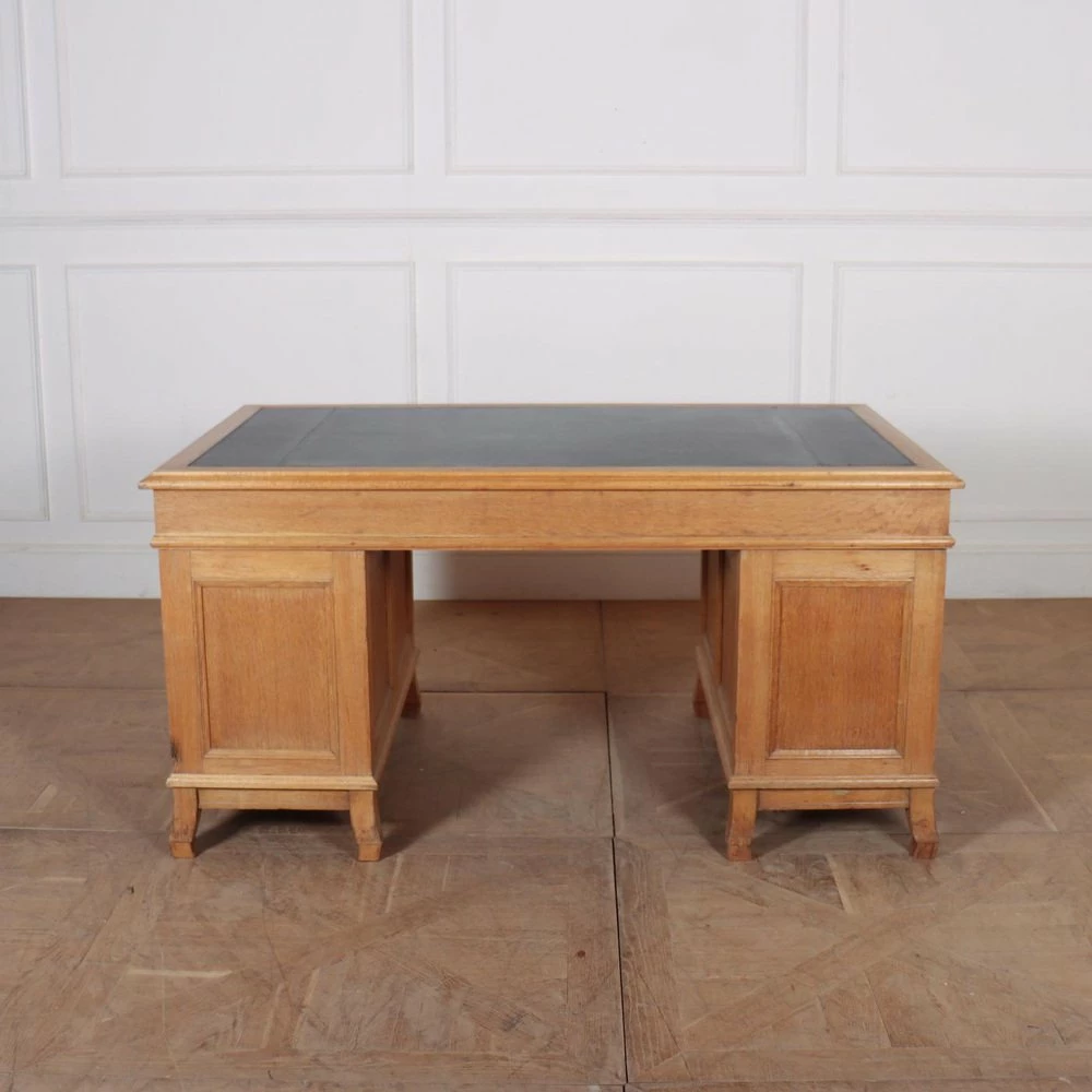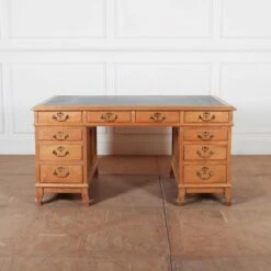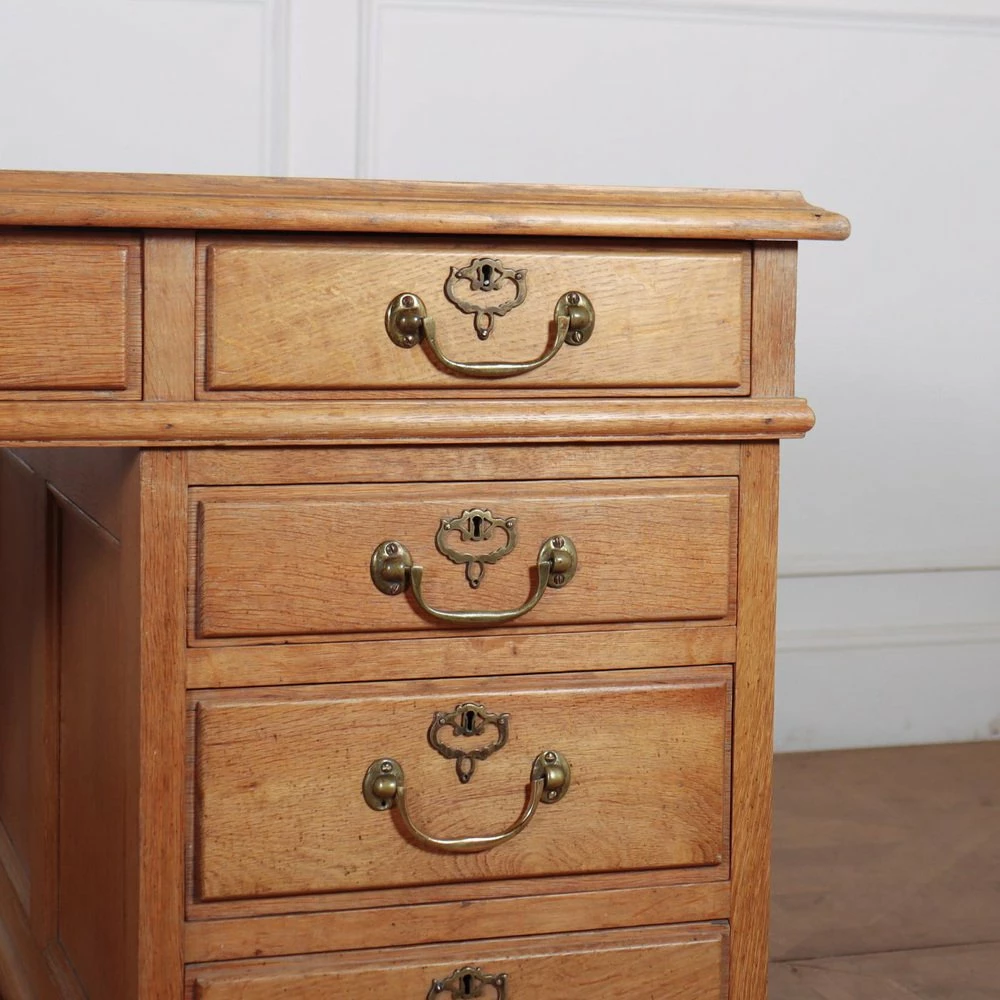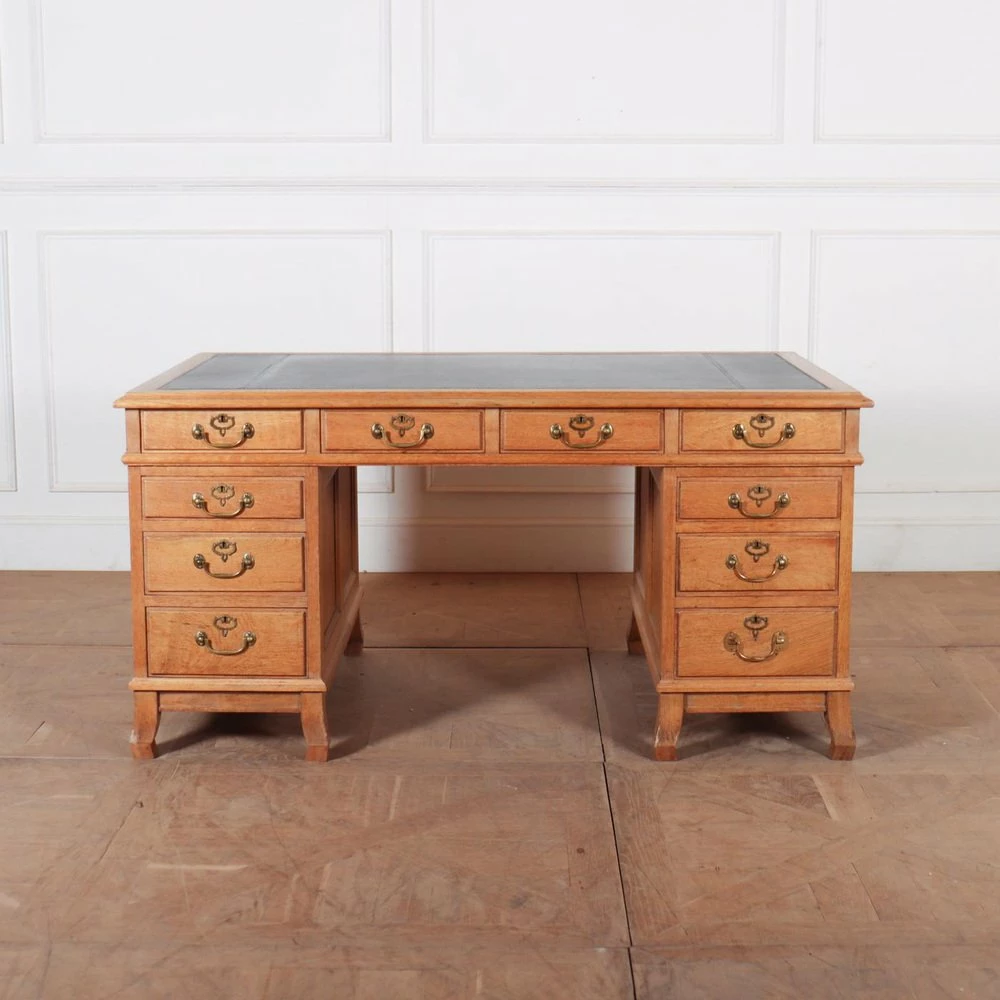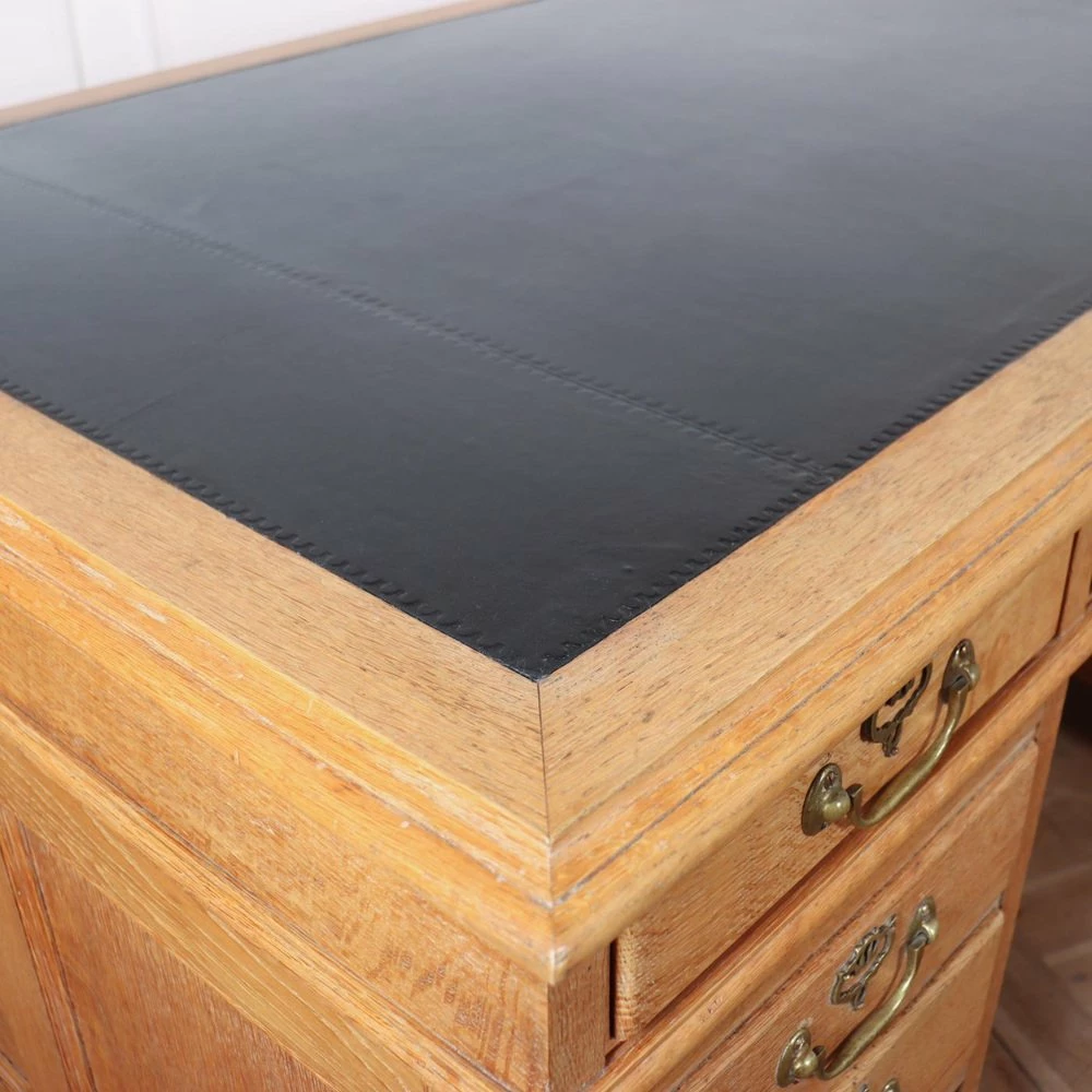 19th C English pale oak pedestal desk with leather insert. 1880. Knee hole dimensions: 27.5″w x 24.5″h.