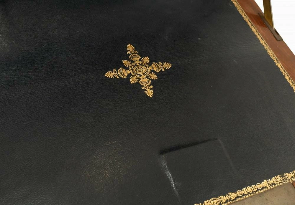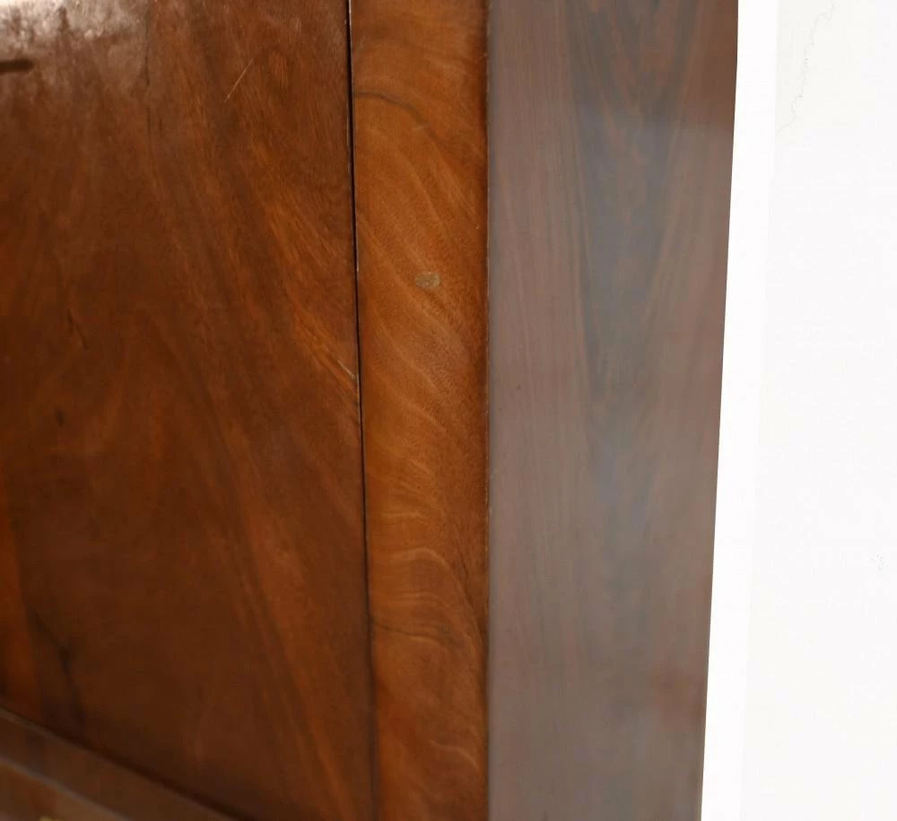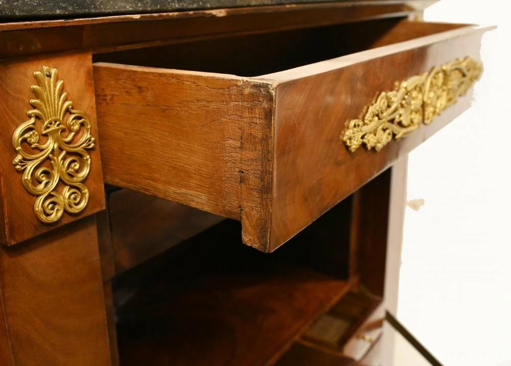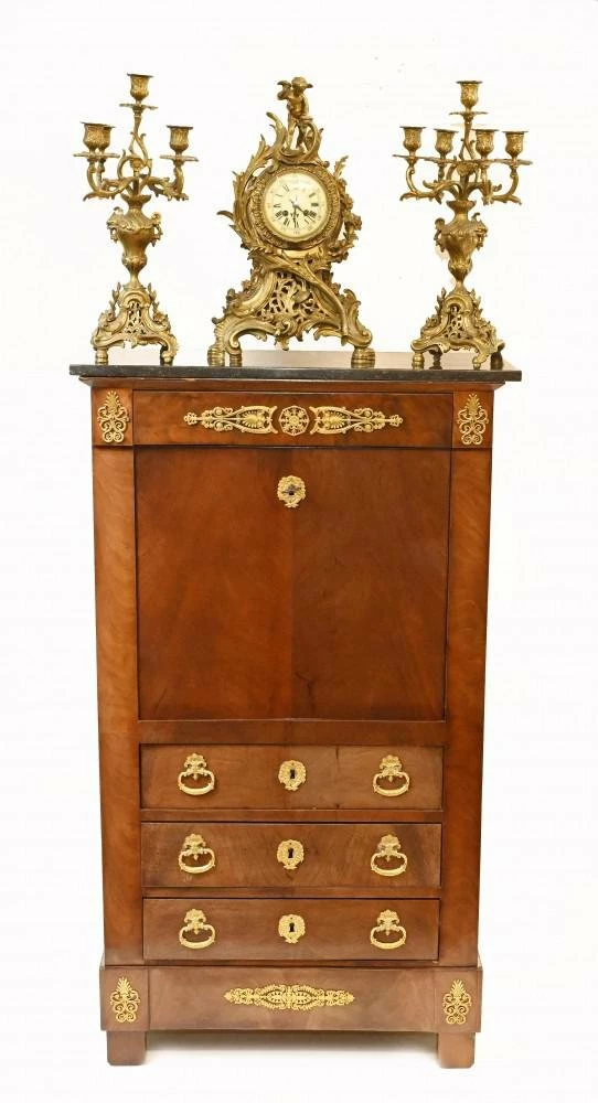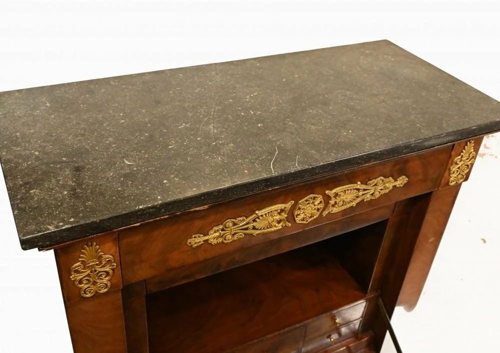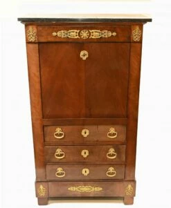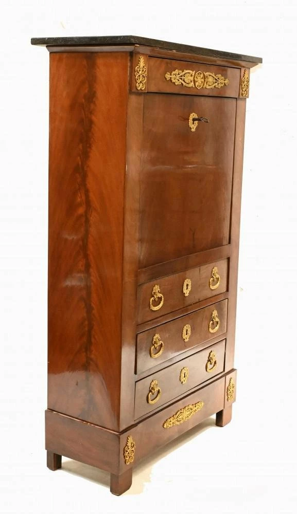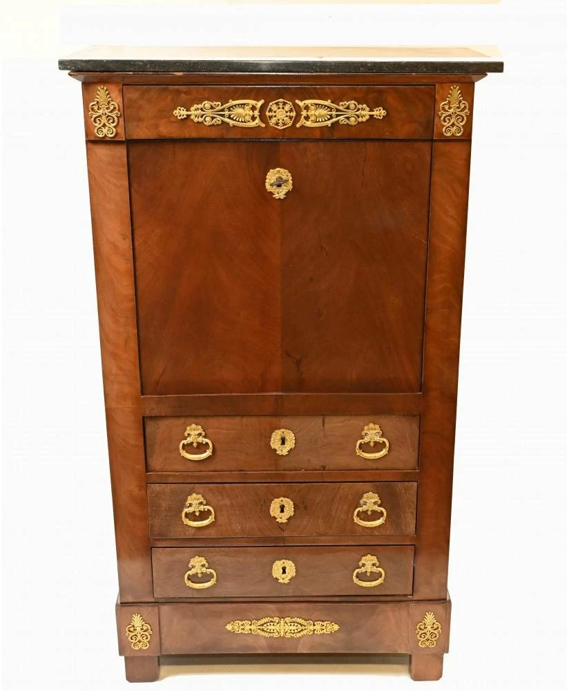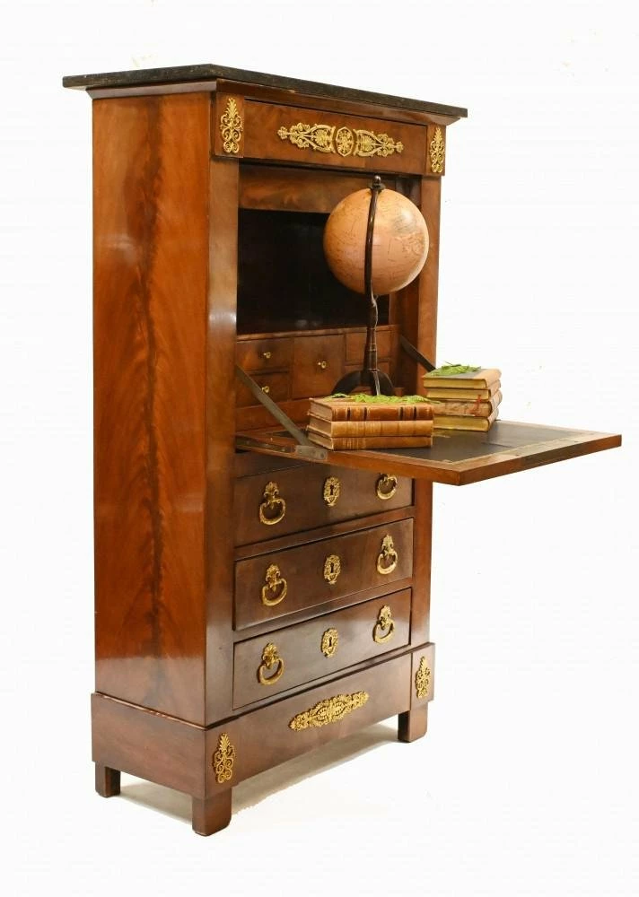 Classic French Empire escritoire or desk. Crafted from mahogany with ormolu fittings. Great space saving piece as both a desk and a chest of drawers. We date this to circa 1880. Bought from a dealer on March Biron at Paris antiques markets. Offered in great shape, ready for home use right away. Dimensions are in inches (CM) Width x Depth x Height 32 (81) x 14.5 (36) x 55 (139).