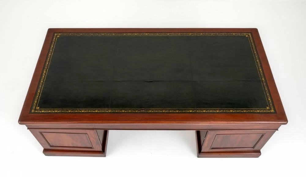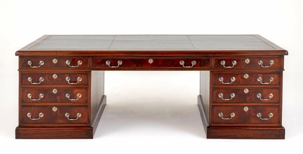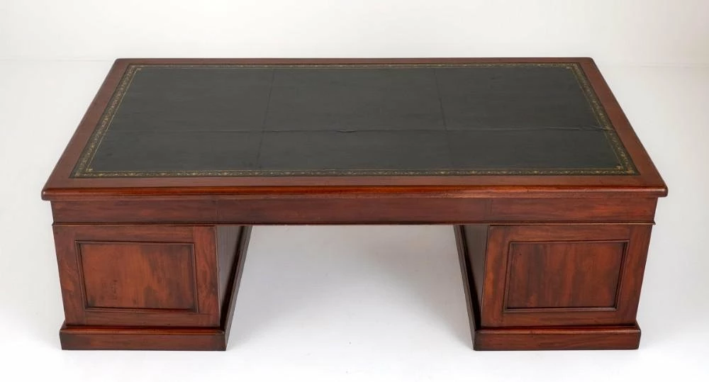 Monumental Georgian style mahogany partners desk. This impressive desk would grace any office. Standing upon a plinth base. Circa 1860. Having an arrangement of 9 graduated drawers which feature brass swan neck handles and brass escutcheon plates. The reverse of the desk having 2 panelled cupboards. The top of the desk having a leather writing surface with hand applied giltm and blind tooling. The desk comes in 3 Sections. Size: Height 30” (76cm) x Width 90” (229cm) x Depth 48” (122cm).
