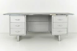 few signs of wear. Buy back from customer after 20 years of use. The shapely executive furniture was formerly restored in elegant silver with clear lacquer. The paintwork, since it has been burned in, is in very good condition. The tabletop covered with linoleum shows some signs of wear, some of which are stronger. The two decades of careful private use have done it more good than harm, as a careful age patina has developed, which can only be achieved through lived time. No structural damage, no impairment of function.
