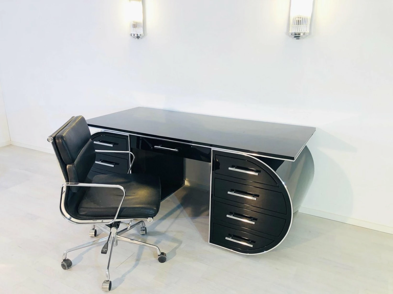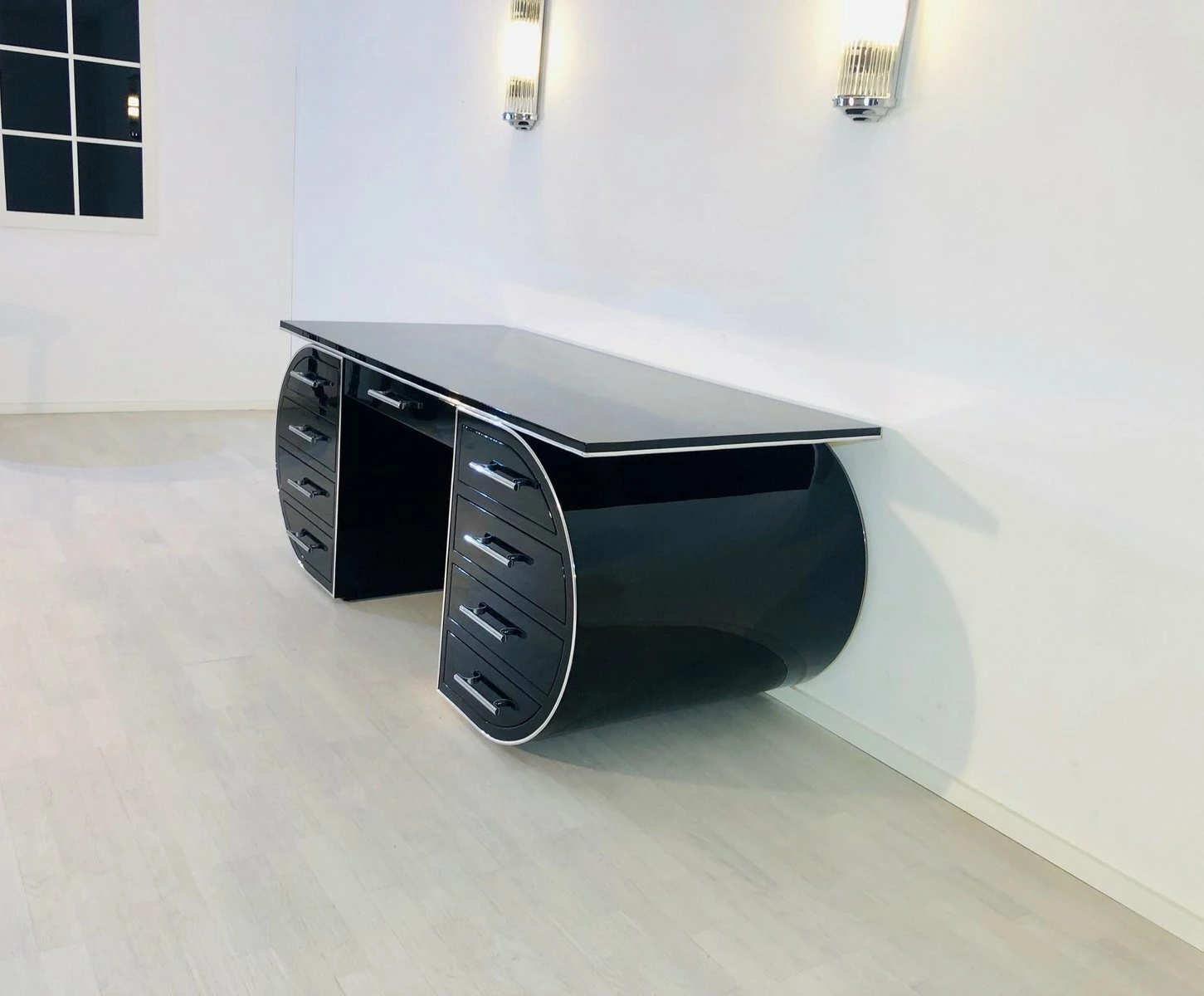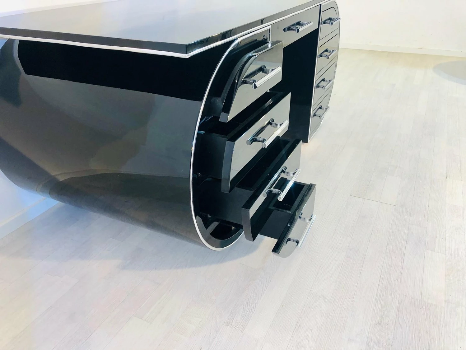 High gloss black design desk with a hand-polished piano lacquer finish and fine chrome bar refinements. Features a distinctive, rounded design with a free-floating table top and stunning chromed handles. You can find storage space in nine drawers total which feature a matt black, clean interior. The drawers also follow the curve of the desk. The back is also finished with our signature black lacquer, so it can be placed freely in any living room or office. Handmade item from our German manufactory. Offering does not include the chair, feel free to reach out for seating options. Feel free to reach out with any suggestions or design needs. Dimensions 77 × 180 × 82 cm
