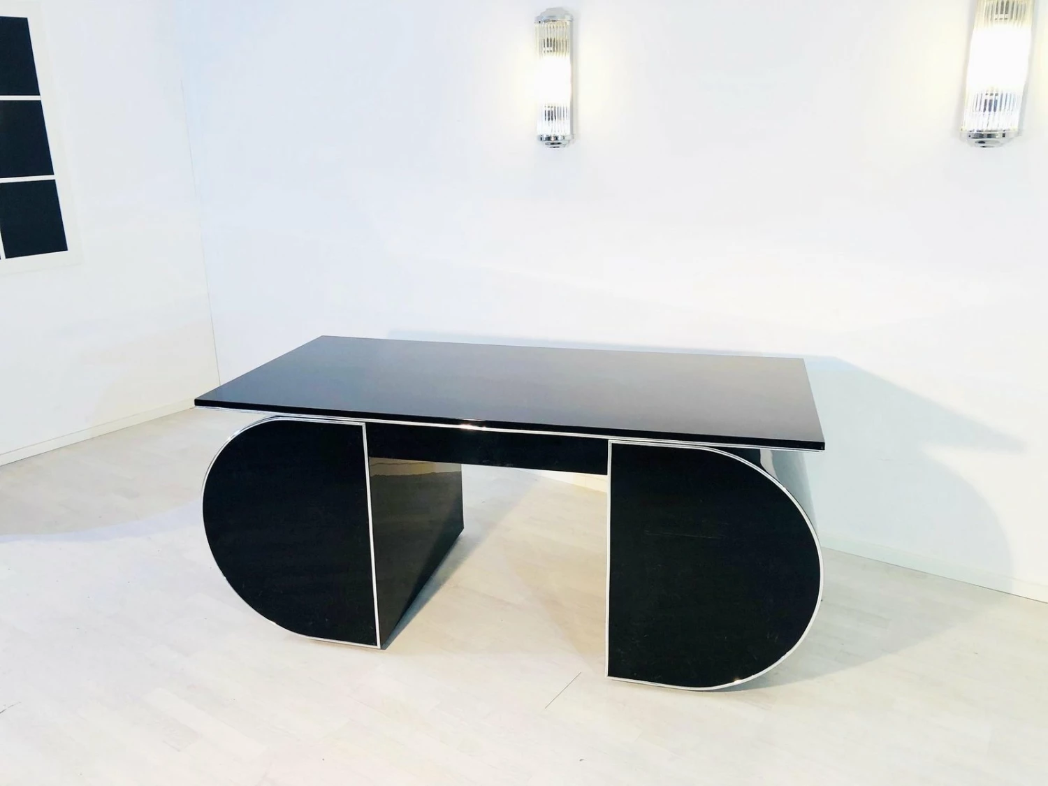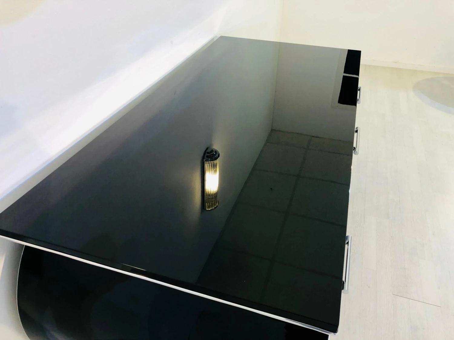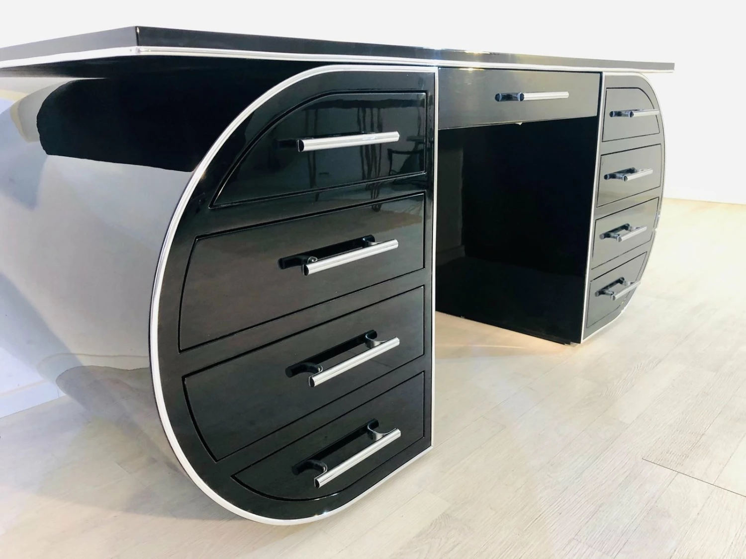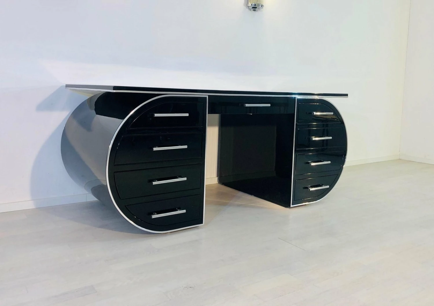 High gloss black design desk with a hand-polished piano lacquer finish and fine chrome bar refinements. Features a distinctive, rounded design with a free-floating table top and stunning chromed handles. You can find storage space in nine drawers total which feature a matt black, clean interior. The drawers also follow the curve of the desk. The back is also finished with our signature black lacquer, so it can be placed freely in any living room or office. Handmade item from our German manufactory. Offering does not include the chair, feel free to reach out for seating options. Feel free to reach out with any suggestions or design needs. Dimensions 77 × 180 × 82 cm