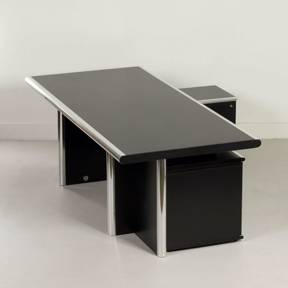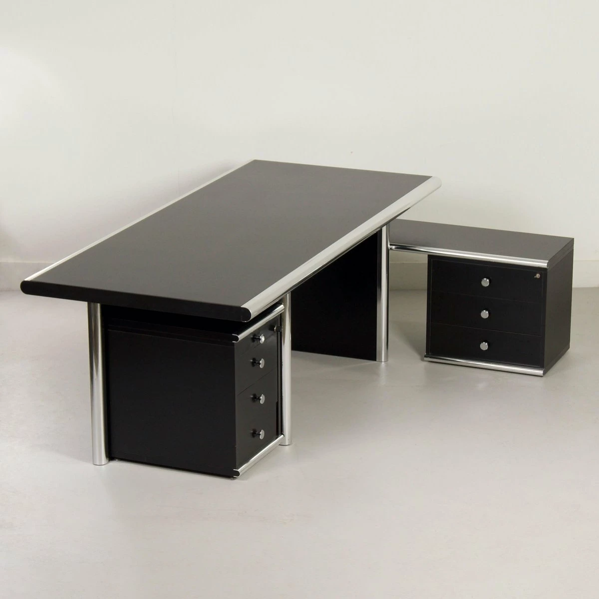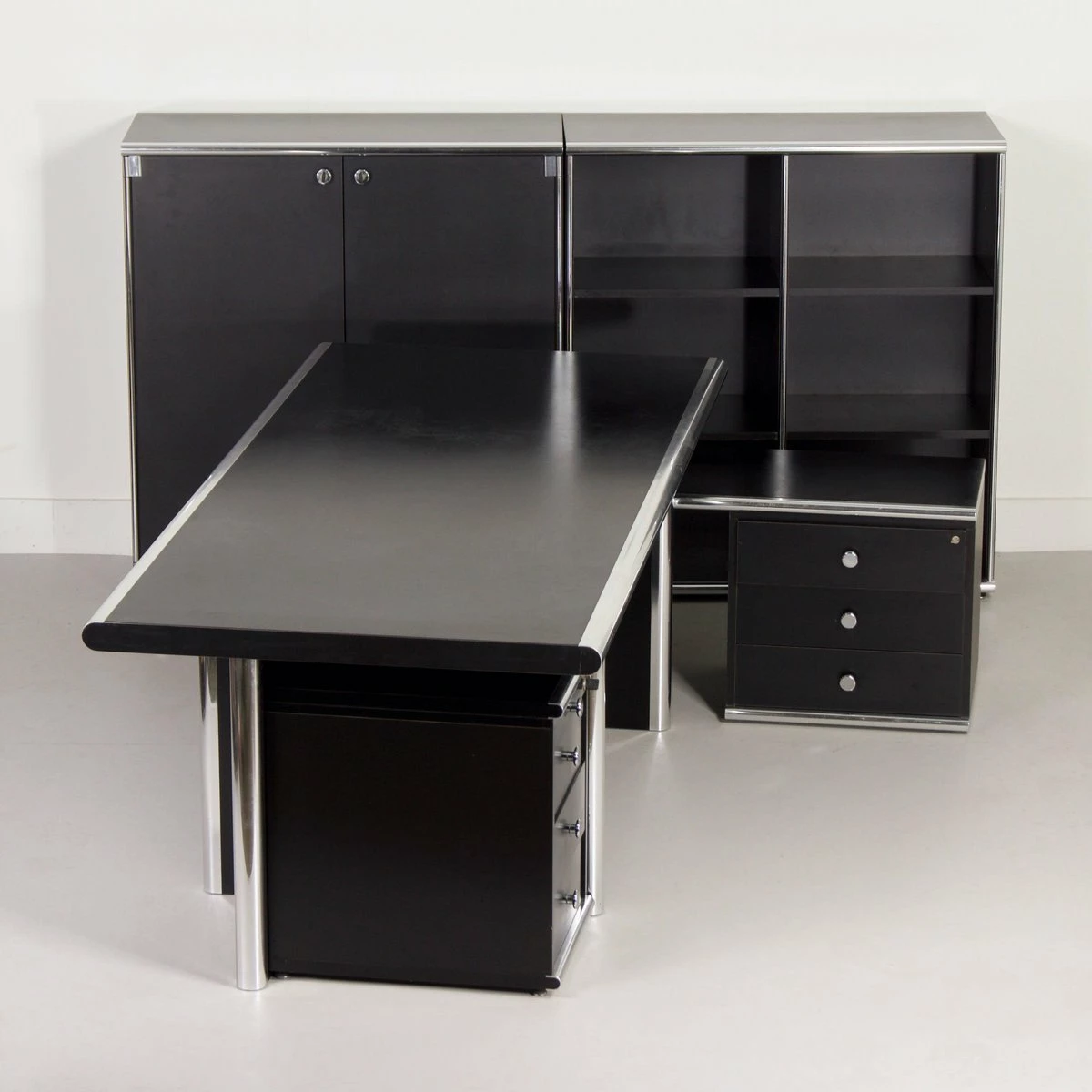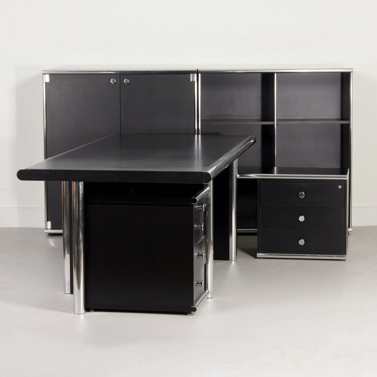 Exclusive 5-piece executive desk ‘Big’ designed by Guido Faleschini & A. Rascaroli for i4 Mariani, Italy in ca. 1970s and manufactured in the 2000s. This prestigious set is large and impressive, black on black with chrome details. It consists of a large desk with 2 separate desk pedestals (drawer units), one of which has a shelf (turning it into an extendable sideboard, see photos). Furthermore, two bookcases/storage cabinets, optionally connectable, one of which has 2 lockable doors. This set is designed for boardrooms. The condition is still very good and original with minimal traces of use; small scratches. Material: wood with black laminated surfaces and chromed metal. Colour: black & chrome Dimensions: Desk h x w x d = 75 x 220 x 100 cm, drawer unit h x w x d = 61 x 42, 5 x 58 cm, drawer unit with top h x w x d = 54 x 127 x 43 cm, cupboard with doors: h x w x d = 118 x 108 x 44 cm, open cupboard: h x w x d = 118 x 108 x 44 cm. Source: special Domus Architecture, design and art – uffici Offices 1979 and Domus 599 October 1979. With keys (marked i4) The desk pedestals are movable, and the desk can be assembled in pieces for easy movement.