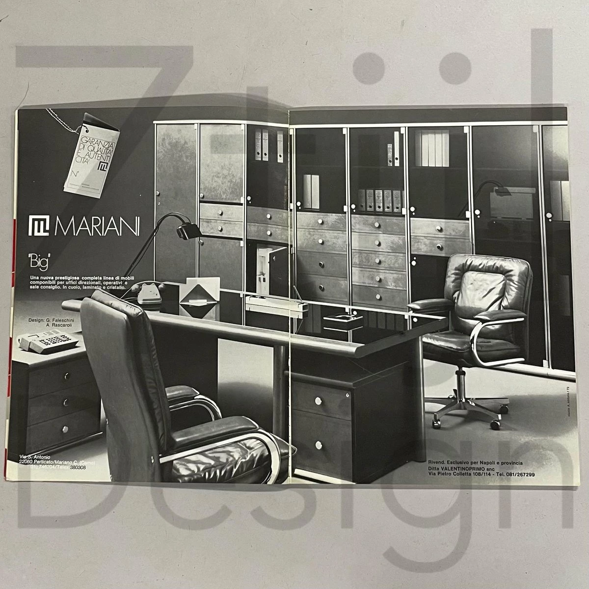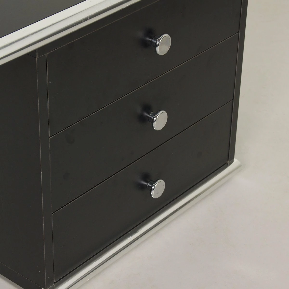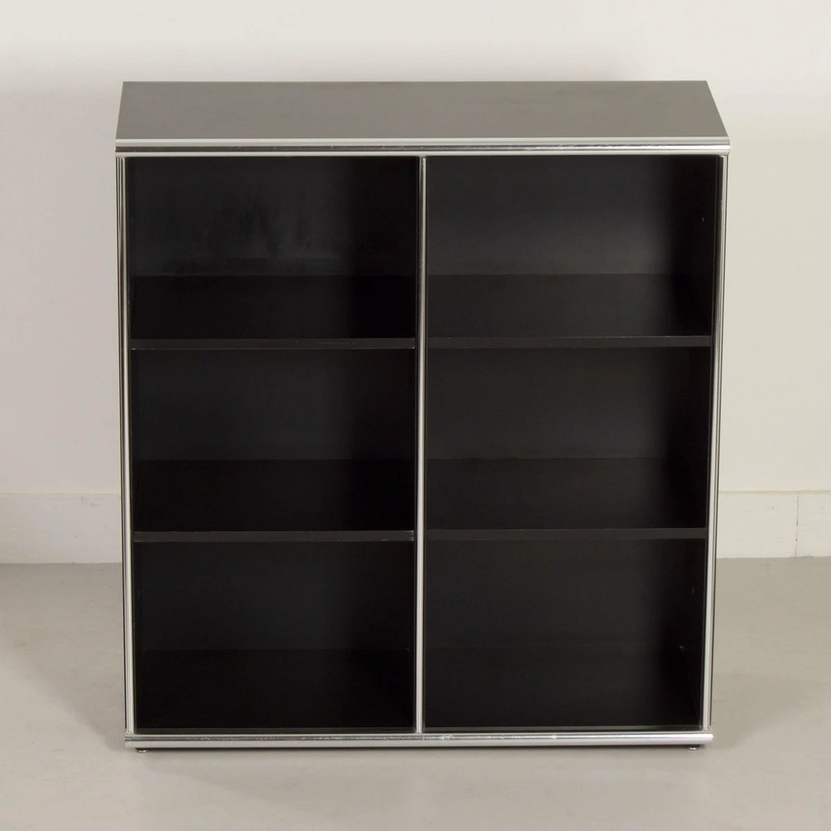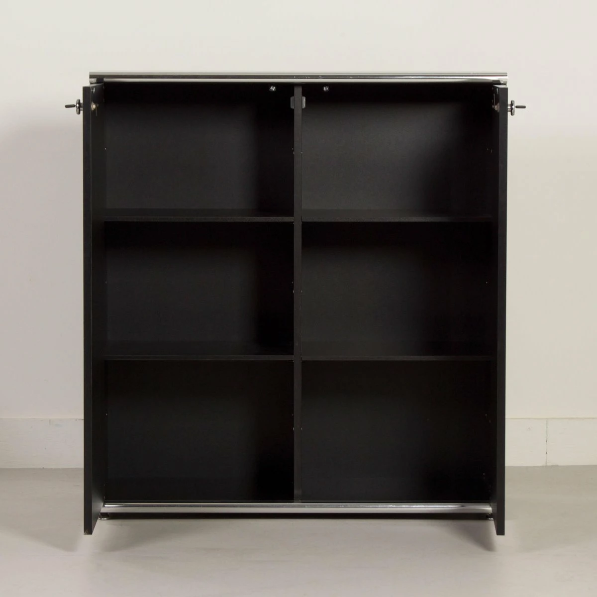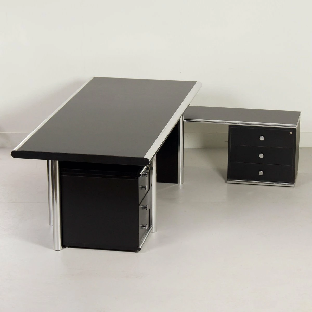 Exclusive 5-piece executive desk ‘Big’ designed by Guido Faleschini & A. Rascaroli for i4 Mariani, Italy in ca. 1970s and manufactured in the 2000s. This prestigious set is large and impressive, black on black with chrome details. It consists of a large desk with 2 separate desk pedestals (drawer units), one of which has a shelf (turning it into an extendable sideboard, see photos). Furthermore, two bookcases/storage cabinets, optionally connectable, one of which has 2 lockable doors. This set is designed for boardrooms. The condition is still very good and original with minimal traces of use; small scratches. Material: wood with black laminated surfaces and chromed metal. Colour: black & chrome Dimensions: Desk h x w x d = 75 x 220 x 100 cm, drawer unit h x w x d = 61 x 42, 5 x 58 cm, drawer unit with top h x w x d = 54 x 127 x 43 cm, cupboard with doors: h x w x d = 118 x 108 x 44 cm, open cupboard: h x w x d = 118 x 108 x 44 cm. Source: special Domus Architecture, design and art – uffici Offices 1979 and Domus 599 October 1979. With keys (marked i4) The desk pedestals are movable, and the desk can be assembled in pieces for easy movement.