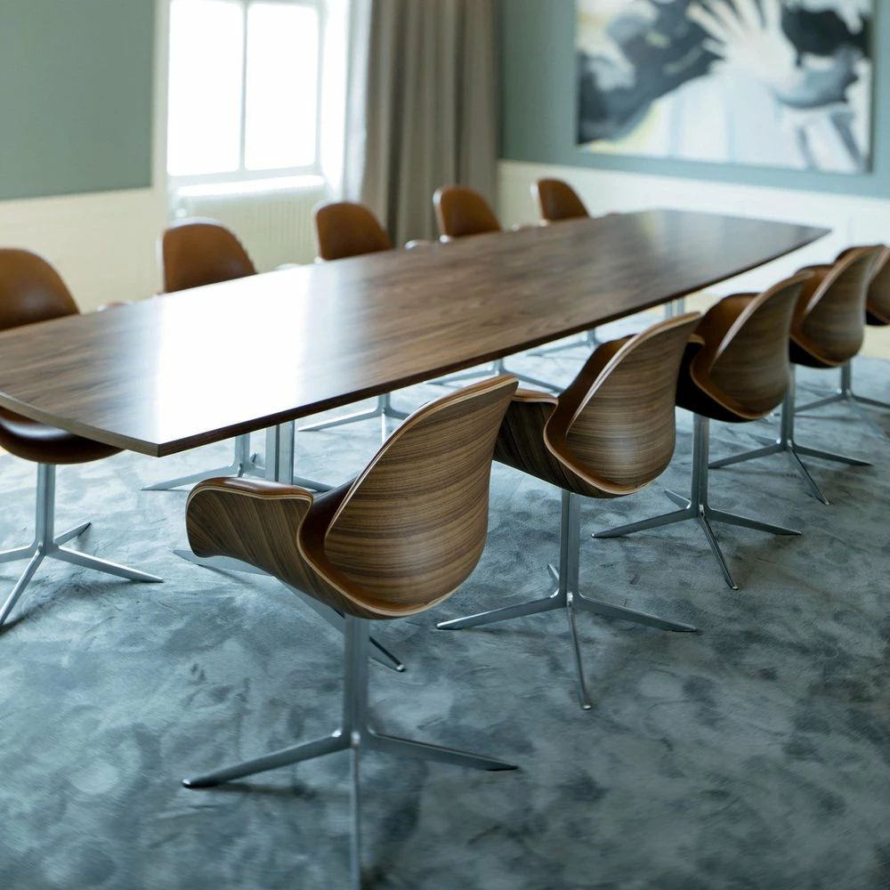 The Council chair was designed in 2011 by Kasper Salto and Thomas Sigsgaard for the Trusteeship Council Chamber at the U.N. Headquarters in New York. The chair is well-thought out, shaped specifically with the human body in mind and made in from-pressed patented 3D veneer. Since the chair was designed for the ‘secretaries table’ in the Trusteeship Council Chamber it is crafted to ensure comfort throughout a long day. Furthermore, the chair nicely complements good architecture, well-designed interiors and is thus ideal for the executive offices, VIP conference facilities, hotels and restaurants as well as private use for dining and working. The chair is available in oak or walnut and is carefully upholstered in fabric or leather on a base of molded foam. The chair can also be ordered fully upholstered for a uniform expression. The elegant 4-star swivel base of the chair is cast aluminum with a polished finish. Year: 2011 Model and materials: KT 8013 Seat and back: 3D veneer, oak or walnut with upholstery inside. Legs: Cast or polished aluminum incl. swivel. Upholstery: Fabric or leather. Dimensions: W 66 cm x D 60cm xH 85 cm Seat height 47 cm. Seat and back: 3D veneer w/ upholstery inside Legs: Cast, polished aluminium incl. swivel Upholstery: Fabric, leather