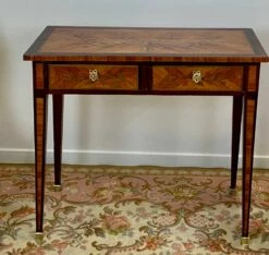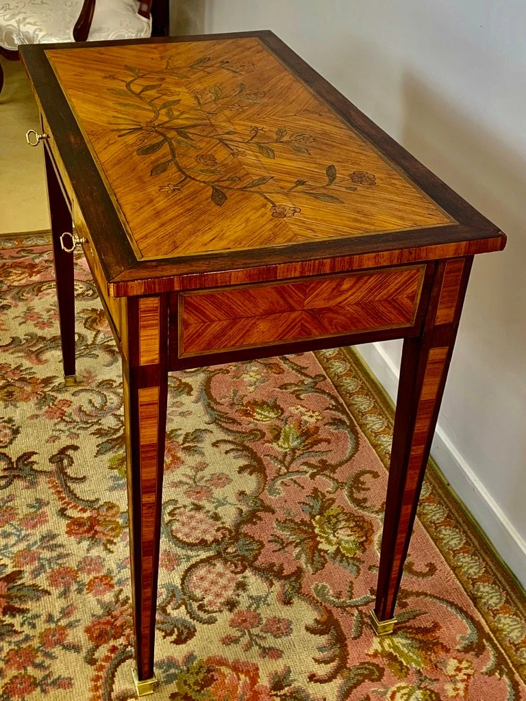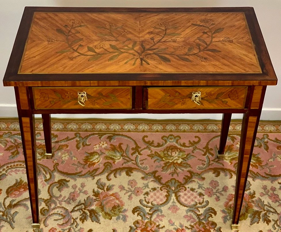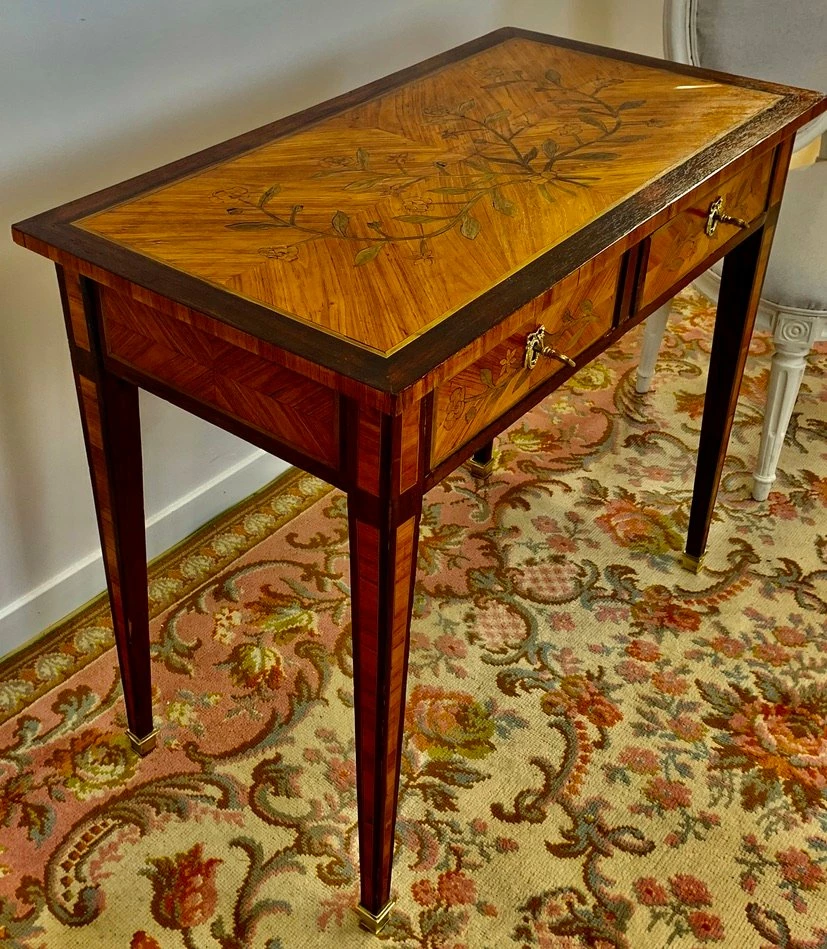 Writing table in rosewood and amaranth; marquetry of foliage and flowers, opening with two drawers in the belt and resting on tapered legs. High quality woodwork. Perfect condition.