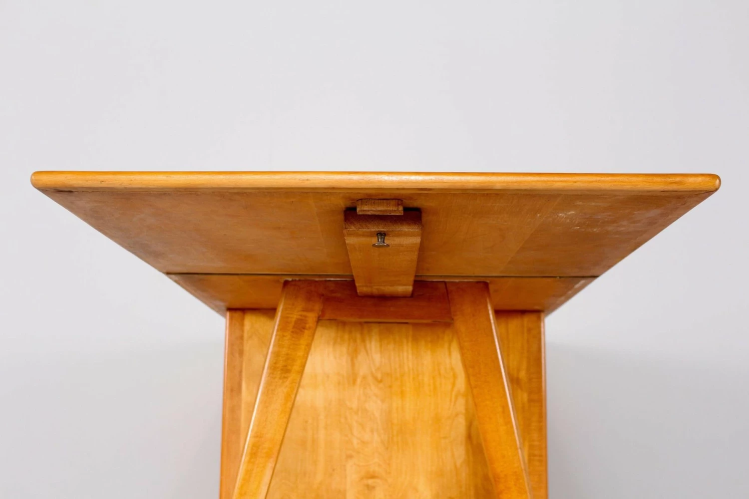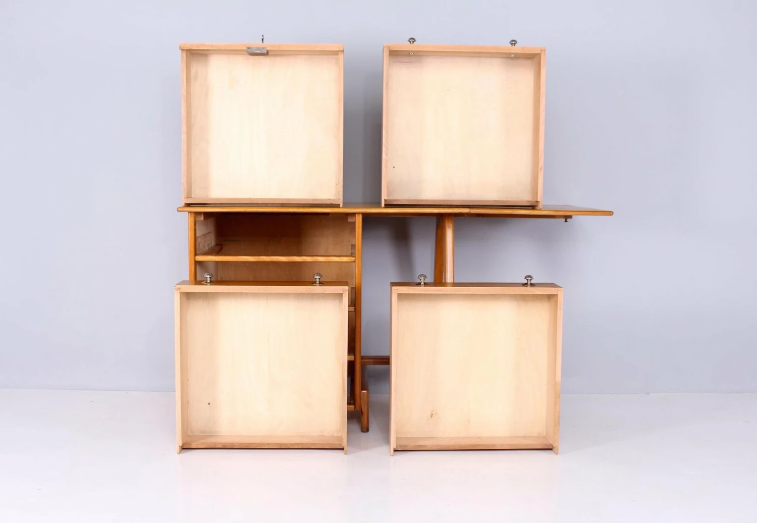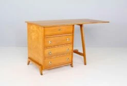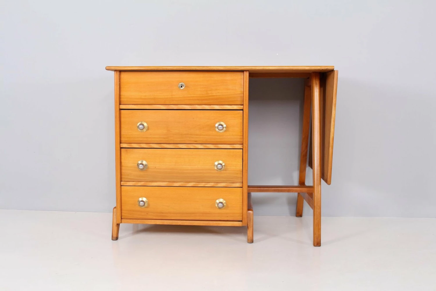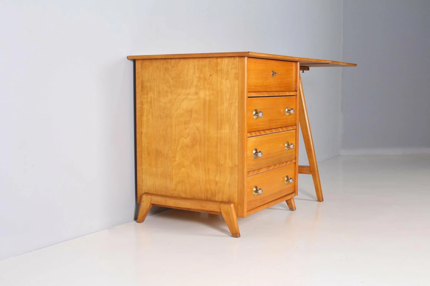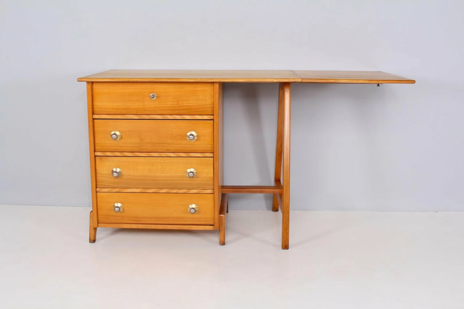 Maple stored work table with 4 drawers, chromed metal handles. Epoque 1950. Unusual format, refurbishment by our restaurateur. KEY PROVIDED, FUNCTIONAL LOCK. L total 150.5 cm (furniture 100.5 cm + flap 50 cm) x P 65 cm x H 80 cm. H Useful (under the flap) 78.5 cm. Drawers P 49C M / 50 cm x H 9.5 cm / 13.5 cm.