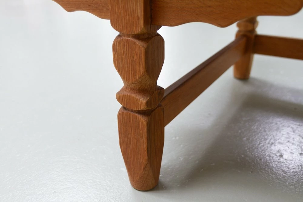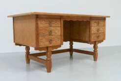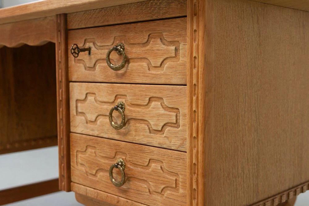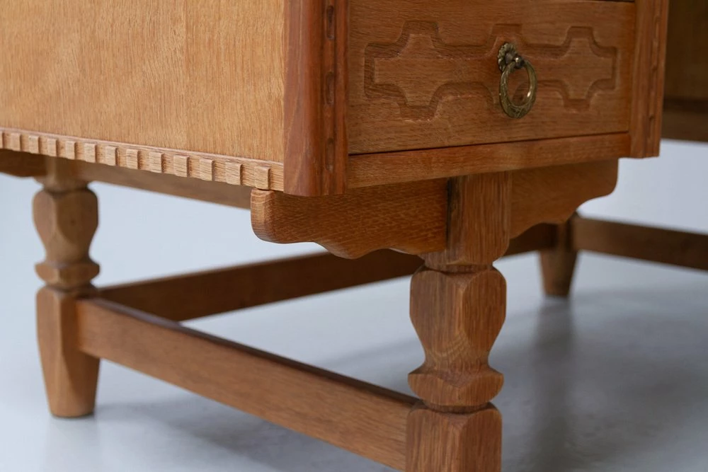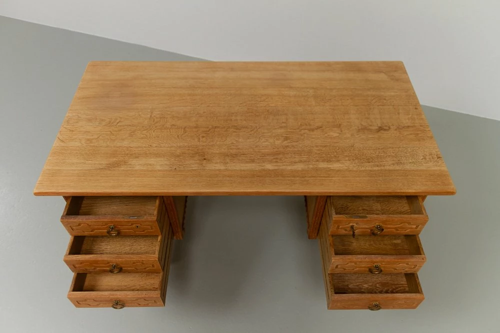Stylish and elegant writing desk in solid Nordic white oak most like designed by Danish architect Henning Kjærnulf. Scandinavian Mid-century modern design with baroque and brutalist details.