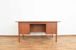 Double sided / freestanding teak desk made in Denmark in 1960’s. The furniture has been professionally and carefully restored by removing old coatings, staining and finishing with varnish. The desk is characterized by very high-quality workmanship using the highest-quality materials. The desk has a cabinet and three drawers, one of which is closed. The key is attached.