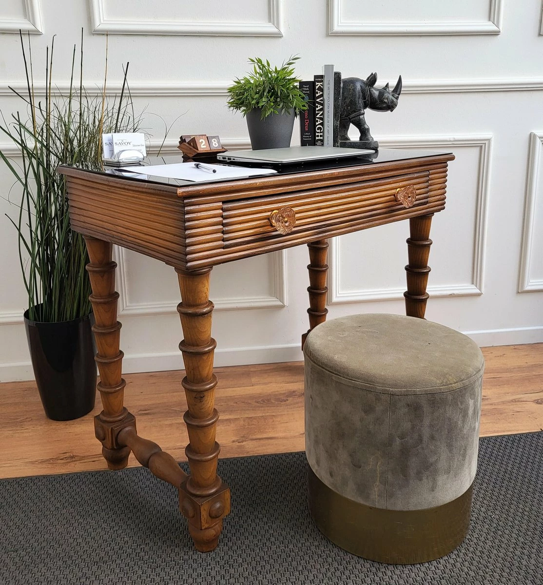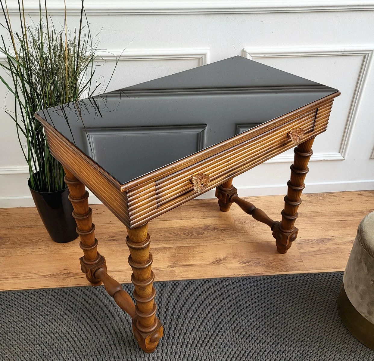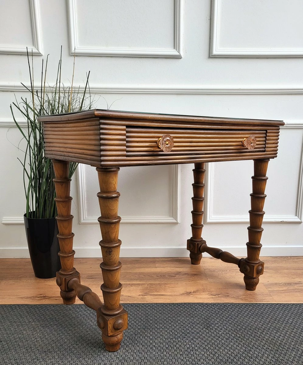 Very elegant Italian Art Deco style Mid-Century Modern small desk or writing table with 4 beautifully carved decorated legs and veneer wood with a central drawer. This beautiful piece is completed by the black glass top, the glass and brass drawer handles. Ideal in any room as a small stand alone corner desk as well as next to the wall.