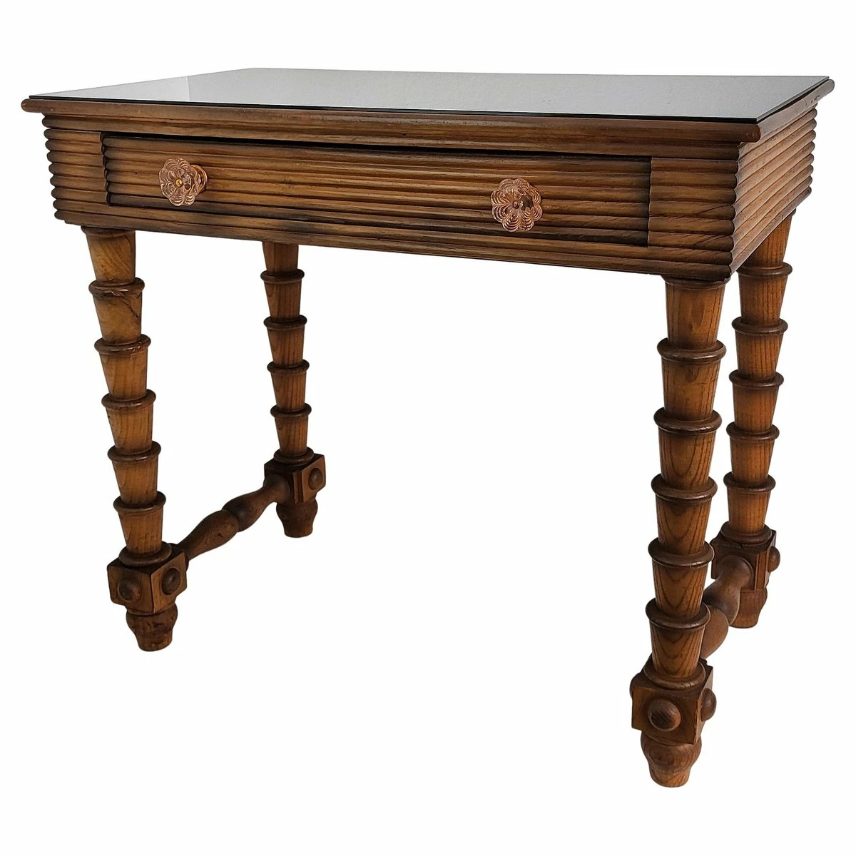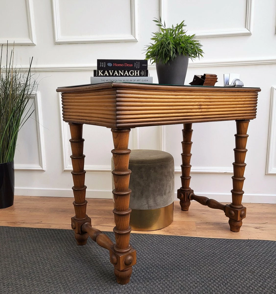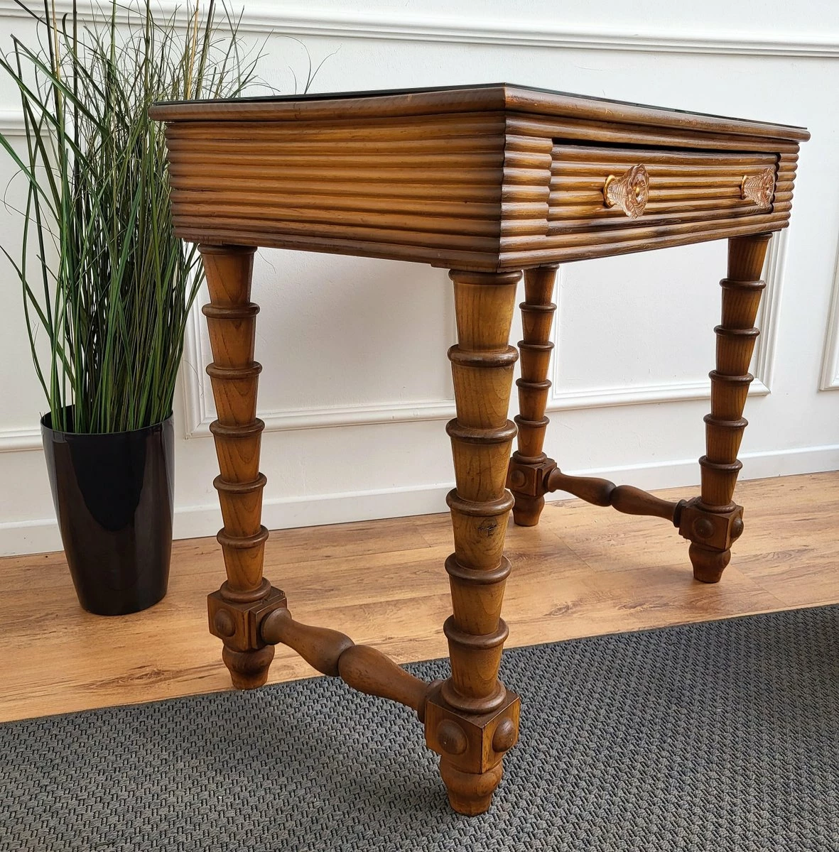 Very elegant Italian Art Deco style Mid-Century Modern small desk or writing table with 4 beautifully carved decorated legs and veneer wood with a central drawer. This beautiful piece is completed by the black glass top, the glass and brass drawer handles. Ideal in any room as a small stand alone corner desk as well as next to the wall.