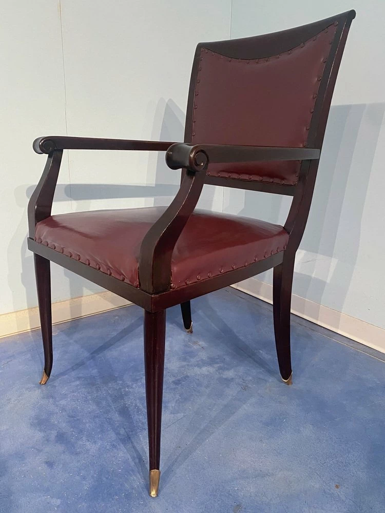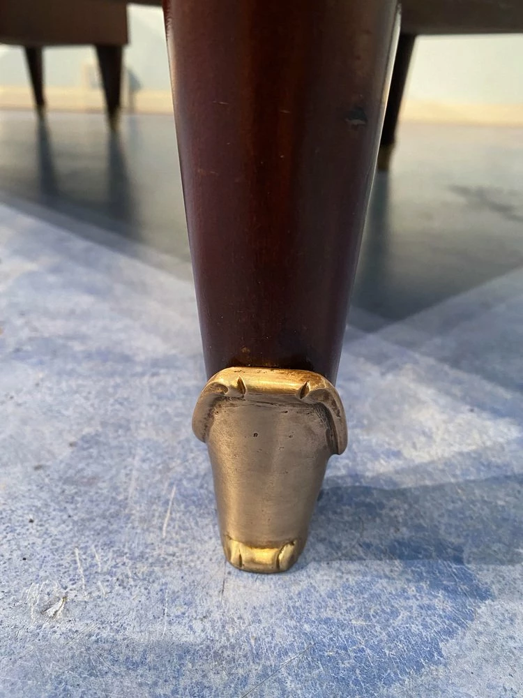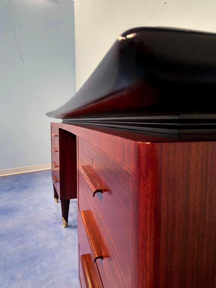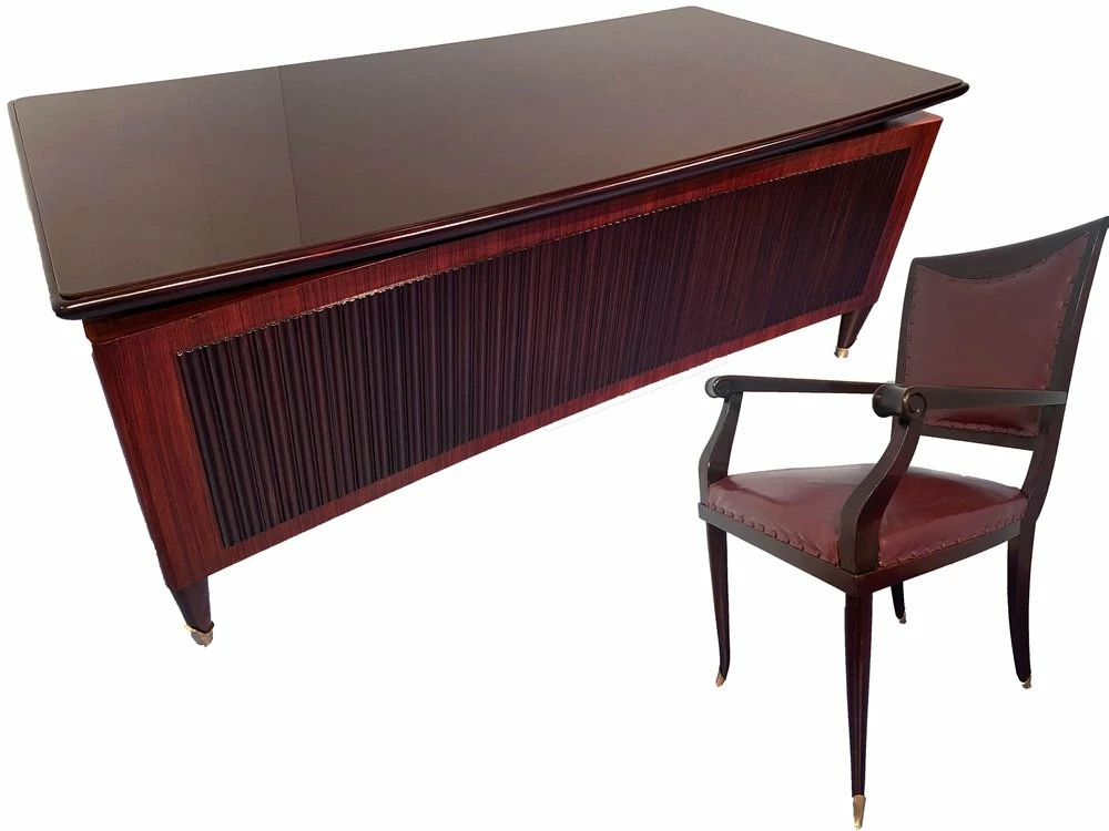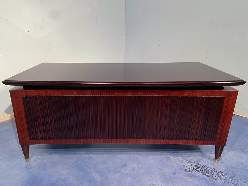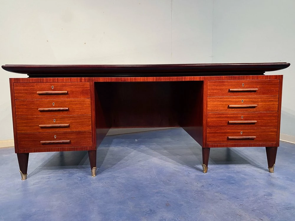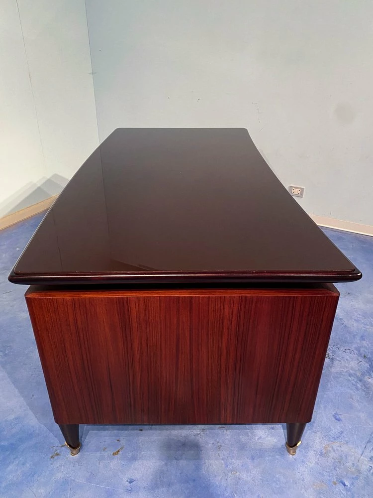 Excellent Italian Executive desk designed by Vittorio and Plinio Dassi in 1950. glass top, eight drawers, solid brass tipped feet, high executive quality. It features an exquisite design with an arched-shaped line on the front and back. The “grissinatura” motif that represents the front of the desk is exquisite and original, and we can see plenty of attention to detail. Very well-kept condition, completely restored, ready to use. The chair is also a beautiful example of elegance, with shaped legs with four final brass sabots, and good original conditions of the natural leather upholstery.