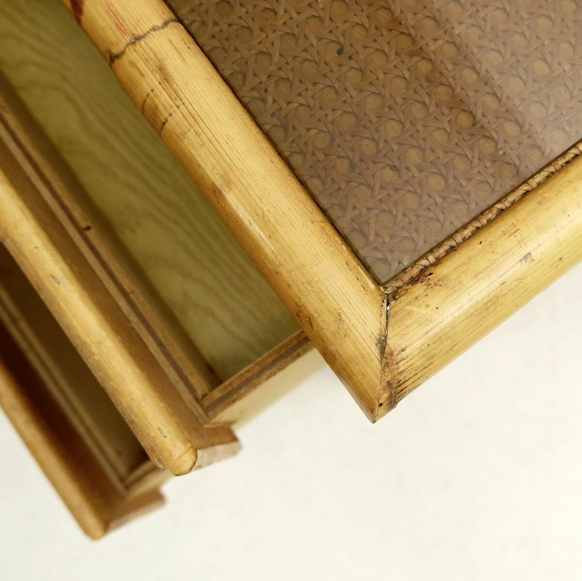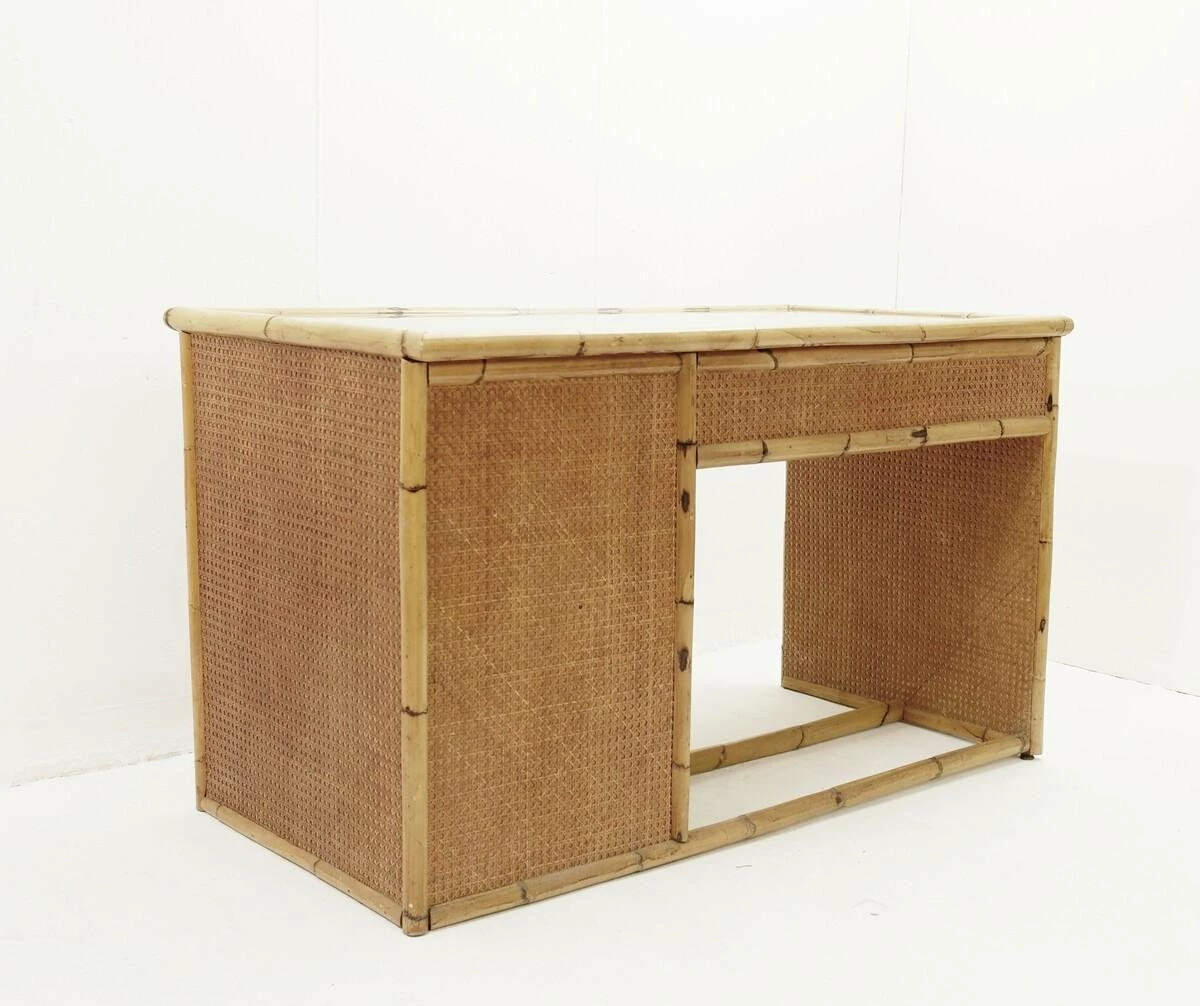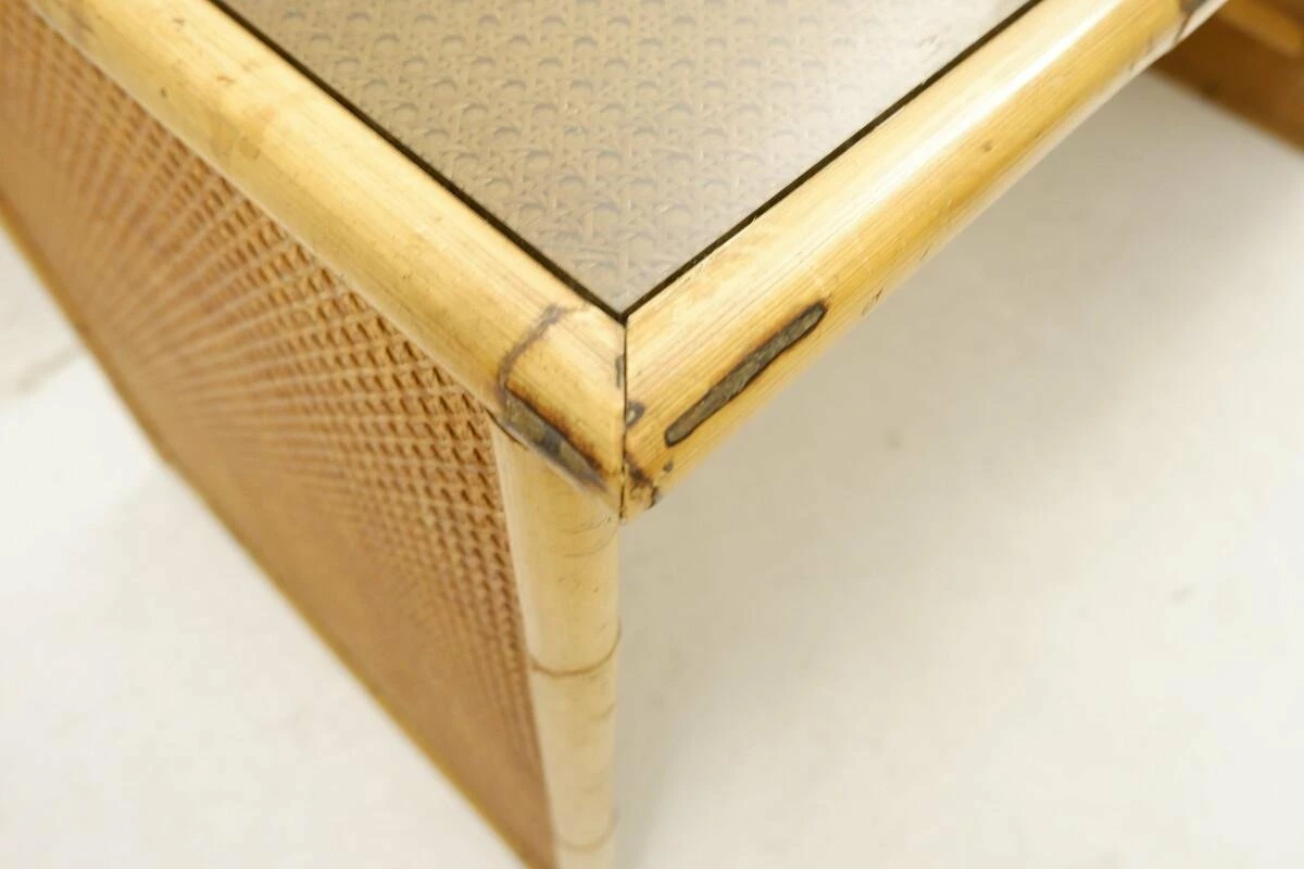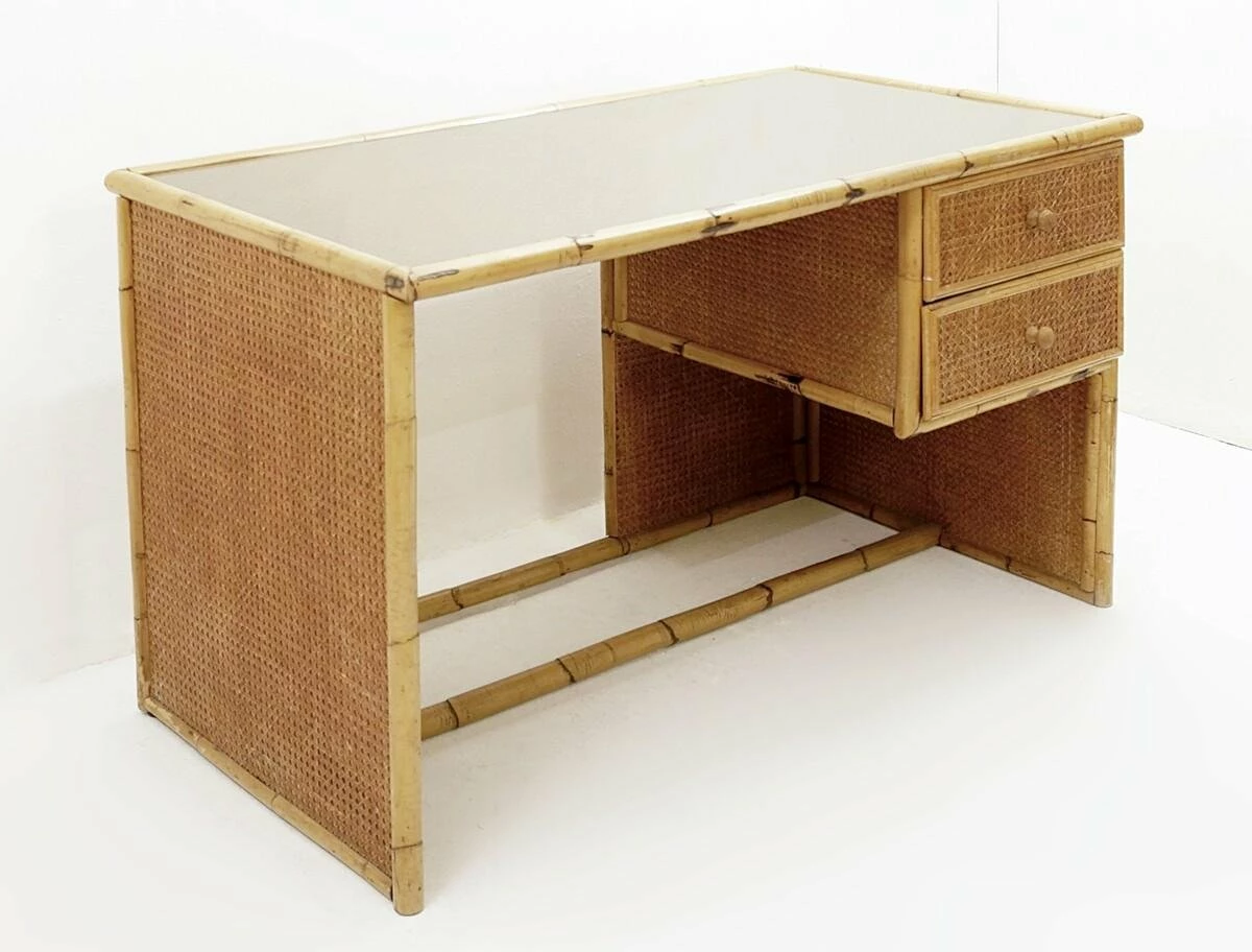Mid-century Italian glass, bamboo & wicker desk with drawers, 1980s. Wear consistent with age and use.