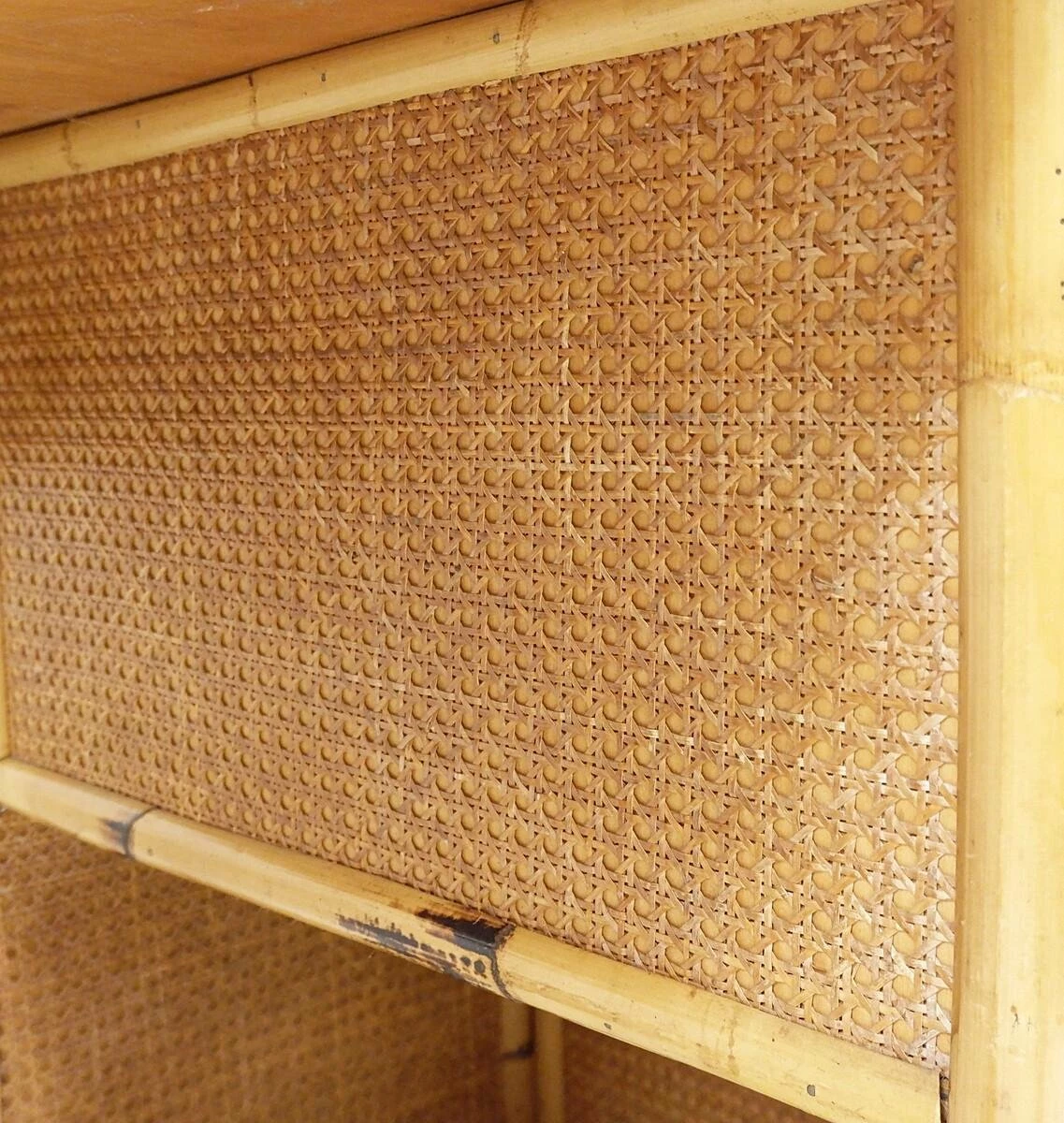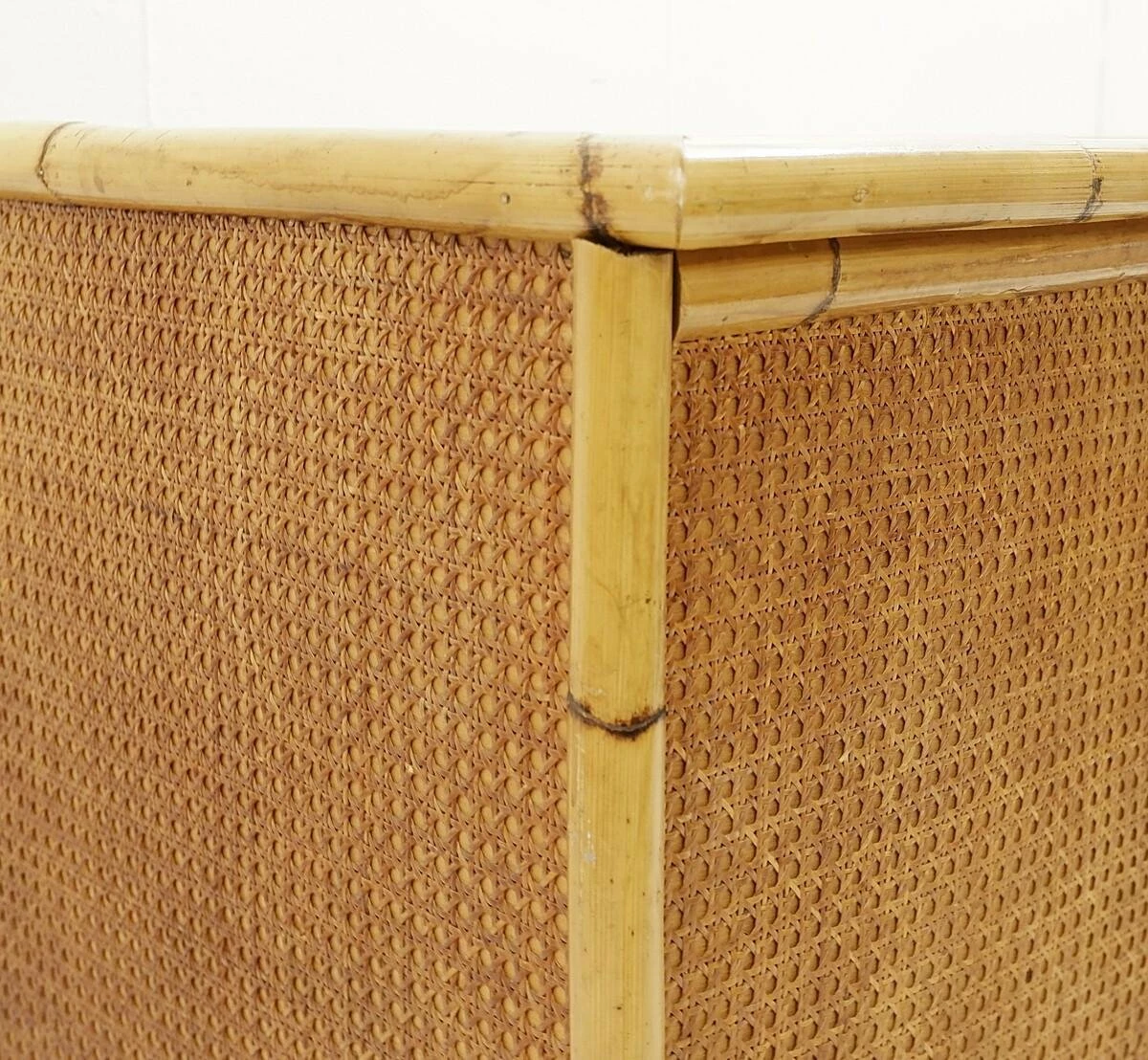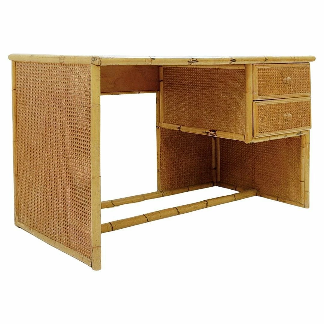 Mid-century Italian glass, bamboo & wicker desk with drawers, 1980s. Wear consistent with age and use.