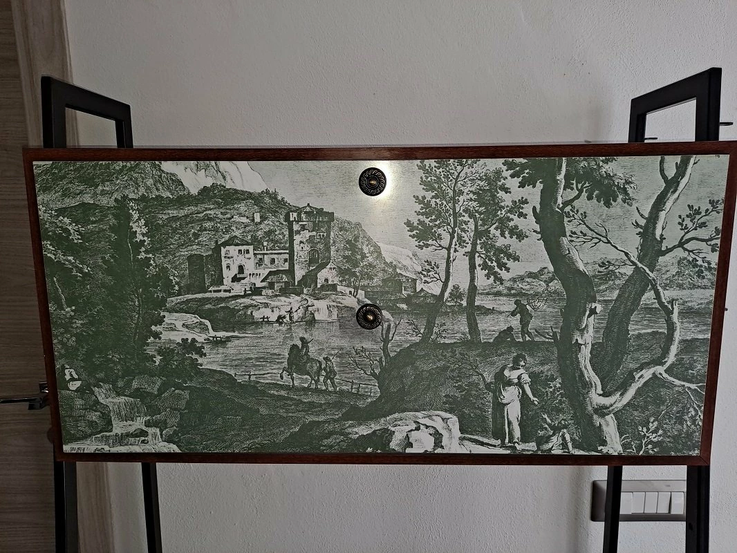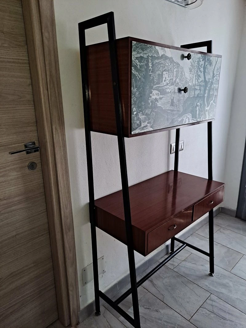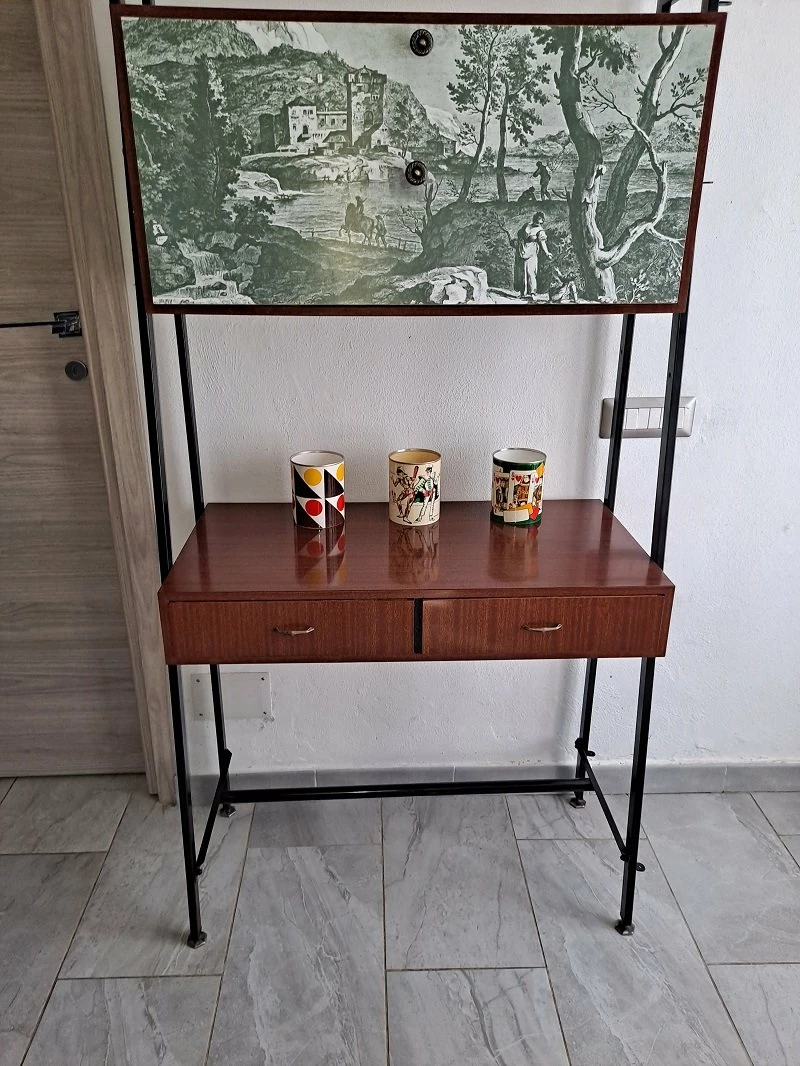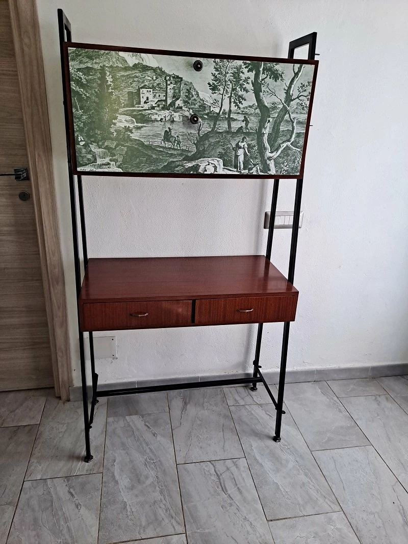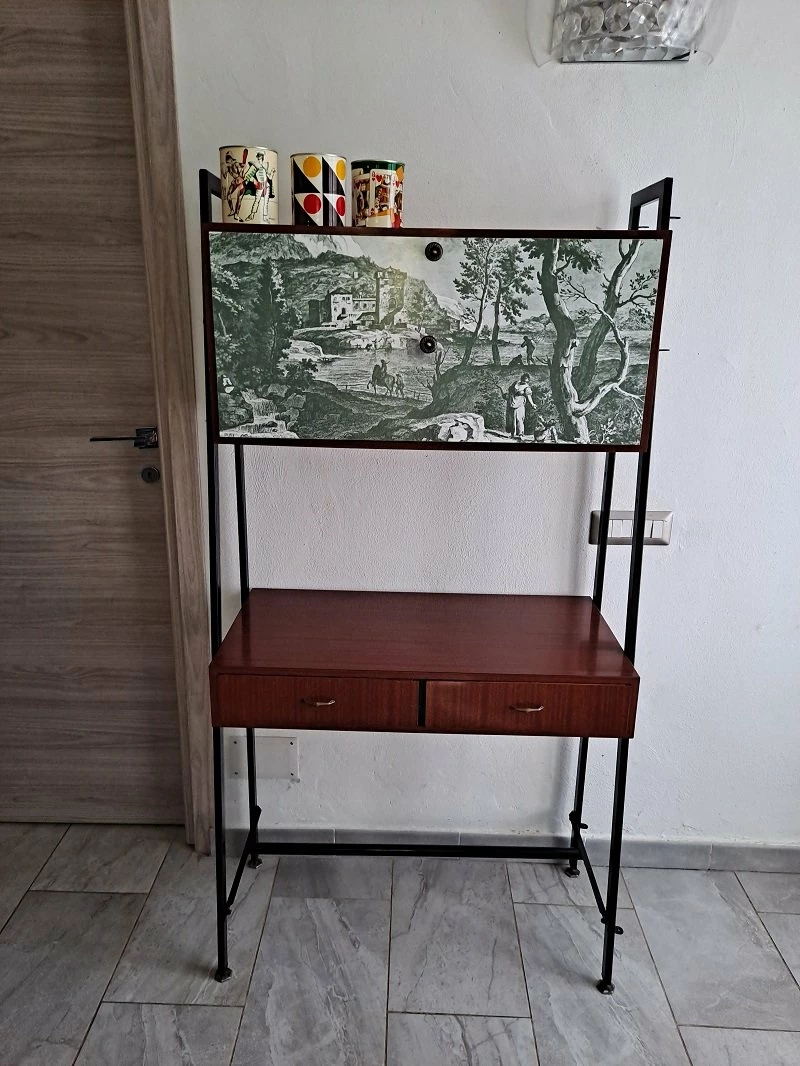Bookcase /library unit with structure in black painted iron, shelving unit with two drawers in laminate, to the upper part a pull down front door with lithographed scene. Produced in Italy early 1960s. Please note that the bookcase can be disassembled.