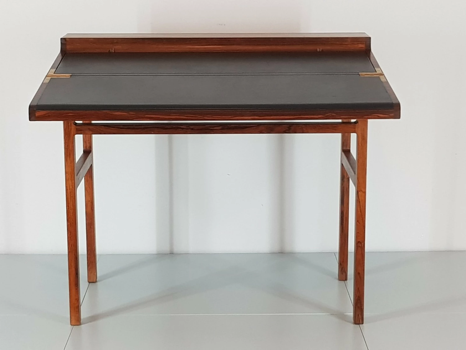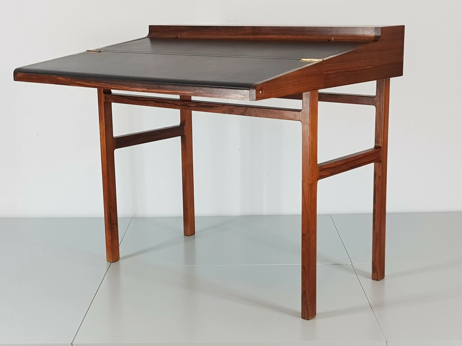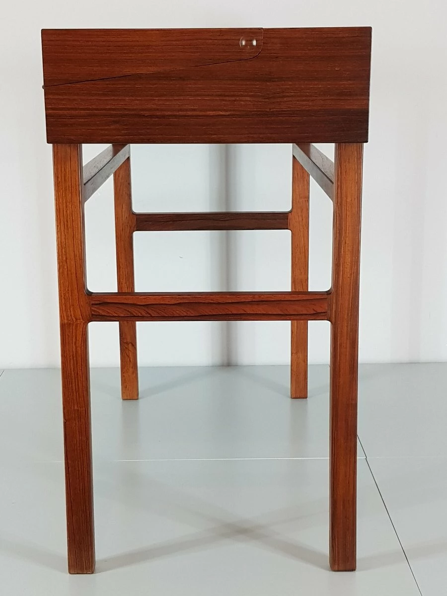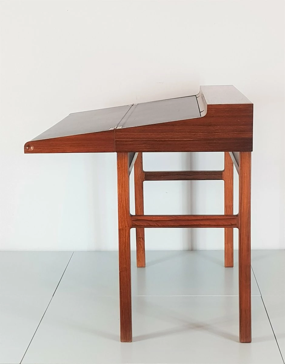First-class craftsmanship by Willy Beck finished the first somewhat rigid design of Ejner Larsen and Aksel Bender Madsen. Reminiscent of a shrine Rosewood ”crate” can be opened easily via the discreet recessed grips on the side. The oblique incision is lifted and opened. The box exposes a leather-finished, now gently curved writing surface, the upper half can be raised in turn. Here is the storage space for desk accessories.