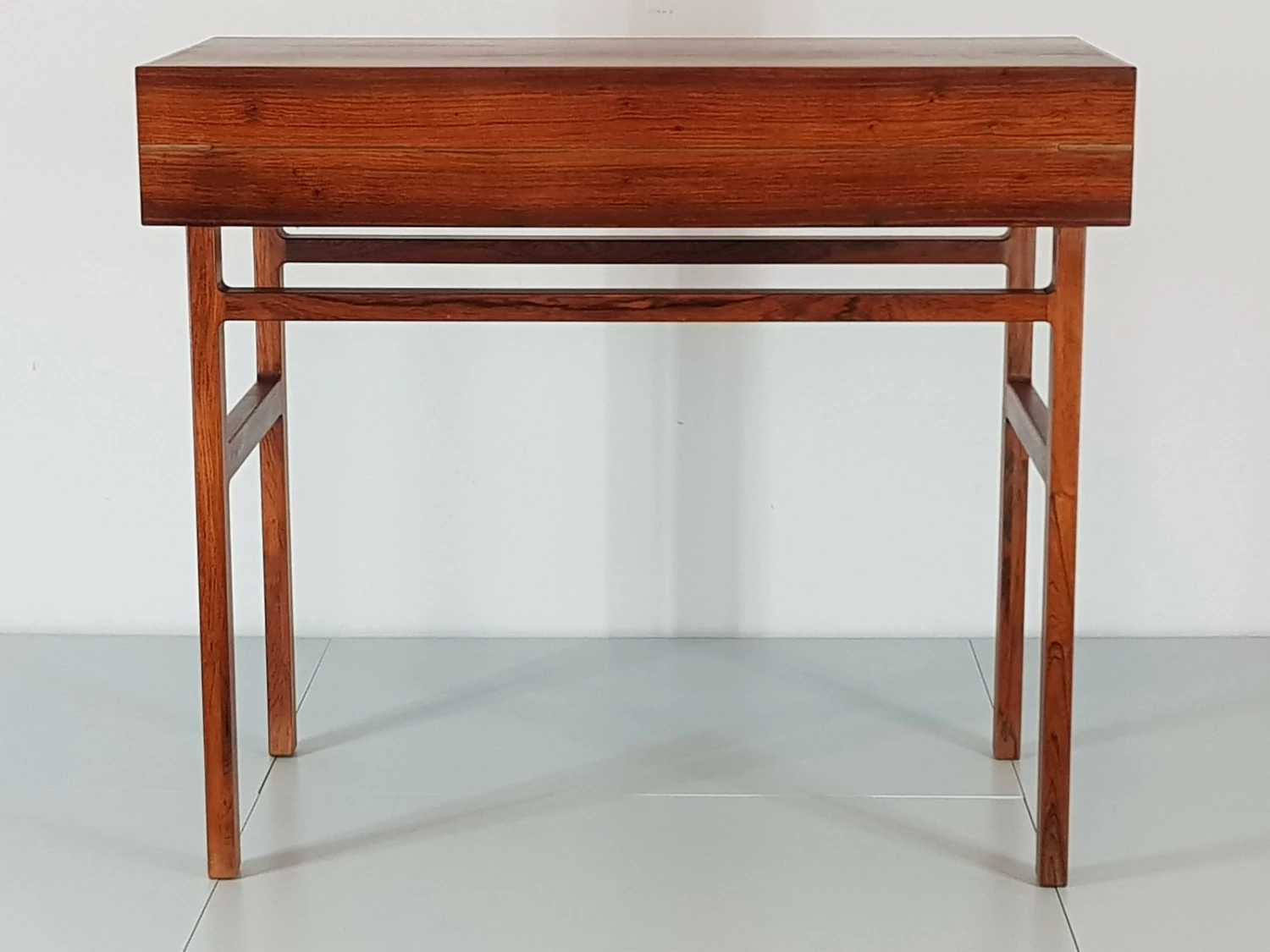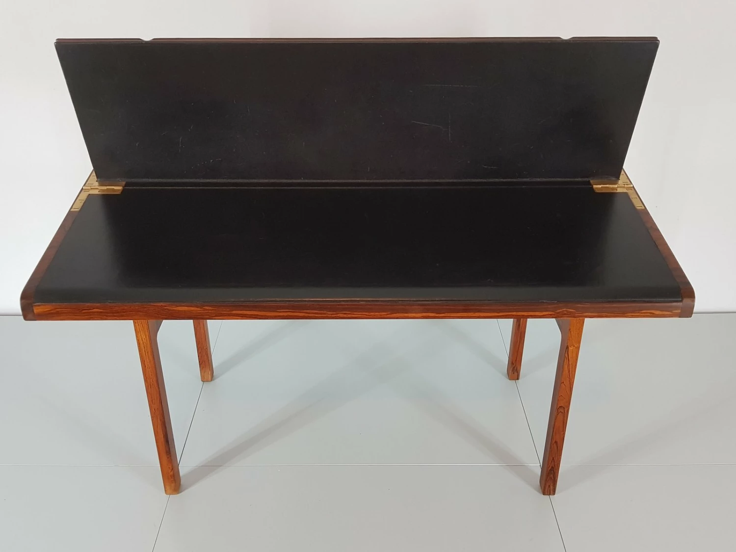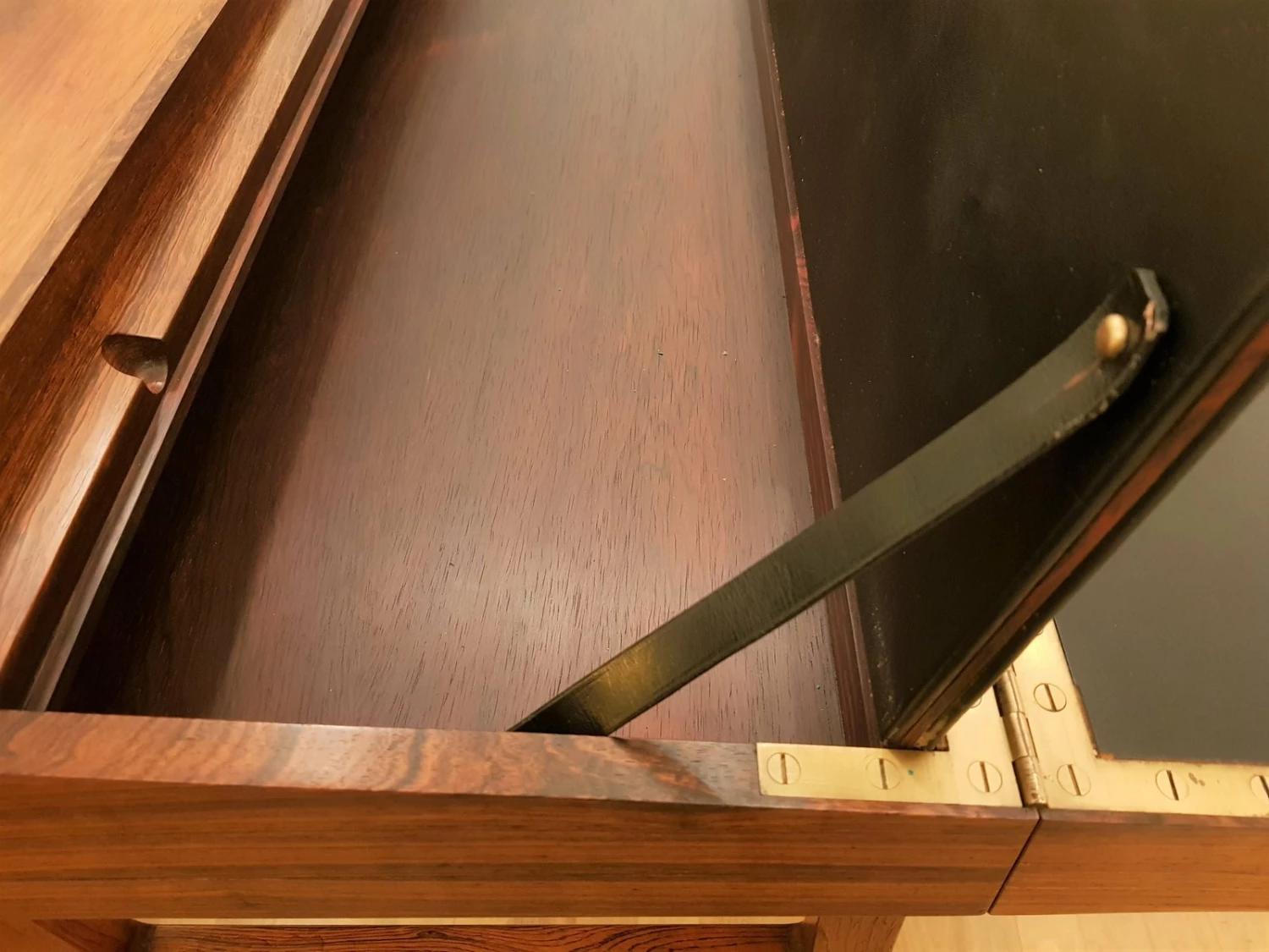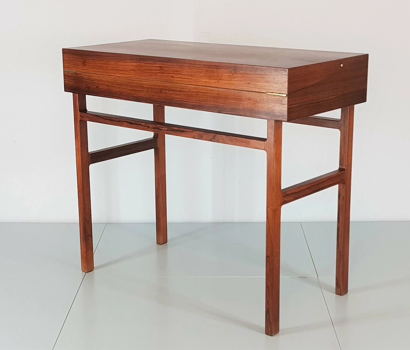First-class craftsmanship by Willy Beck finished the first somewhat rigid design of Ejner Larsen and Aksel Bender Madsen. Reminiscent of a shrine Rosewood ”crate” can be opened easily via the discreet recessed grips on the side. The oblique incision is lifted and opened. The box exposes a leather-finished, now gently curved writing surface, the upper half can be raised in turn. Here is the storage space for desk accessories.