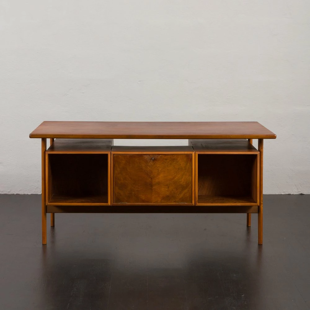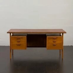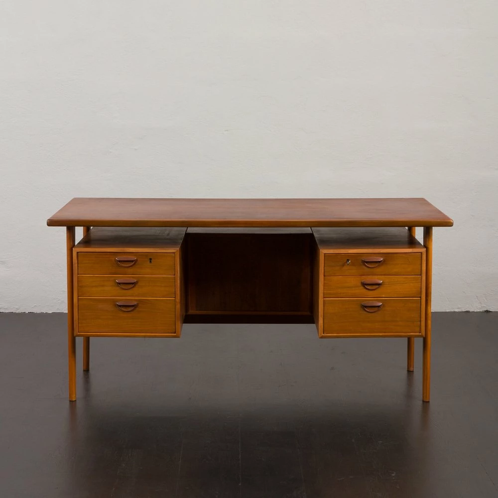 This freestanding desk model FM 60 features a floating top, six drawers in the front and three cabinets at the reverse, one lockable with the original key included, and two sides open spaces. The carved drawer pulls in Kristiansen’s trademark eyelid design, slim legs and frame are made out of solid teak. It shows extremely beautiful and profound wood grain.