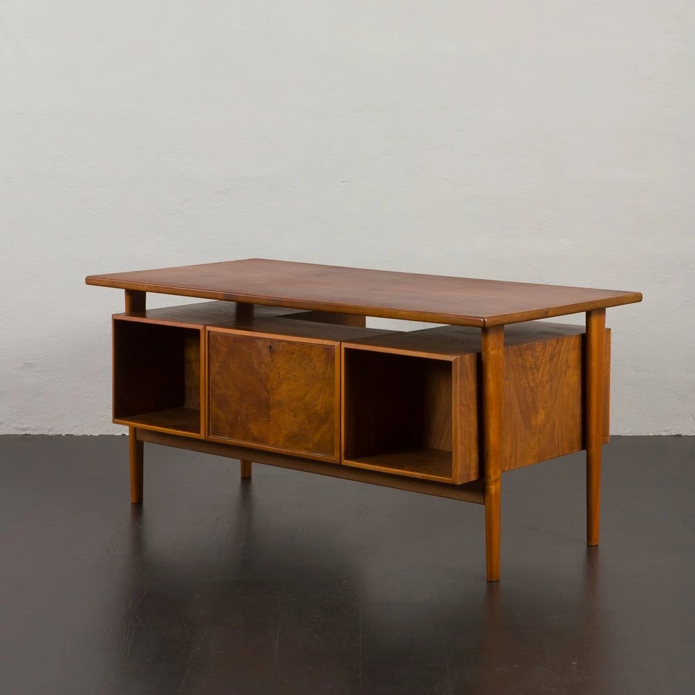 The elegant Kai Kristiansen executive desk in rare for Danish mid-century modern design, walnut wood and veneer, was manufactured by Feldballe’s Møbelfabrik in the 1960s.