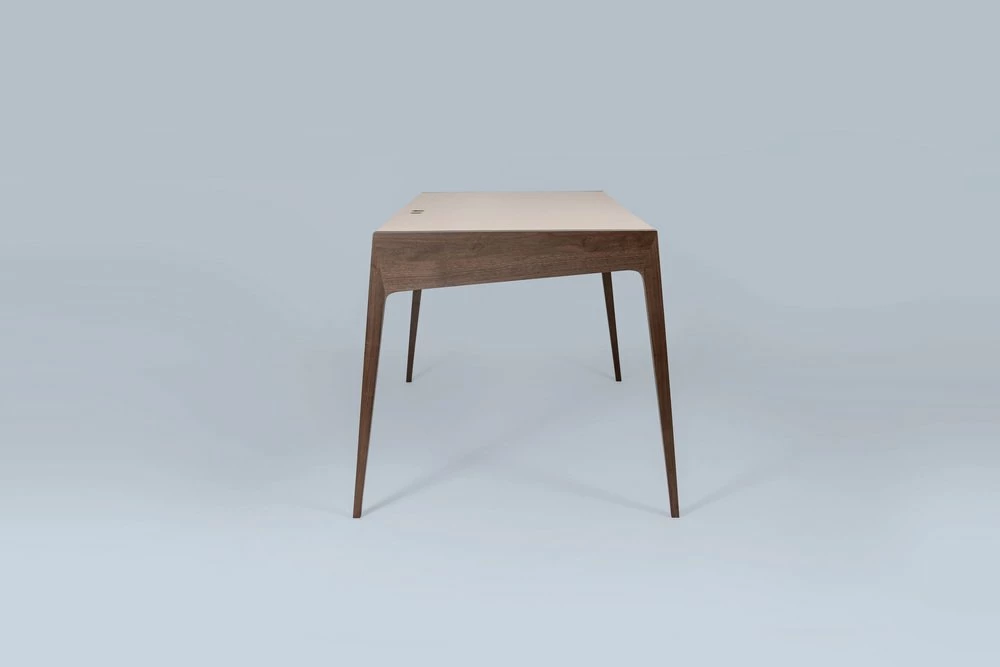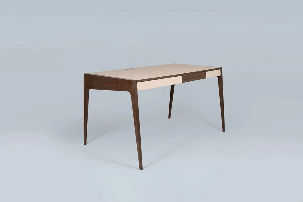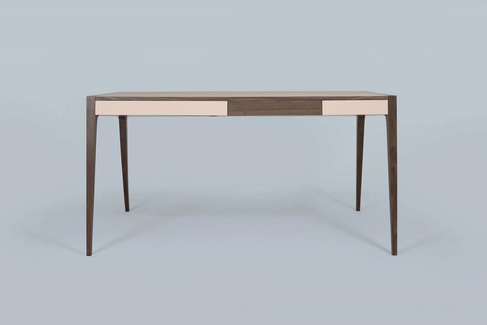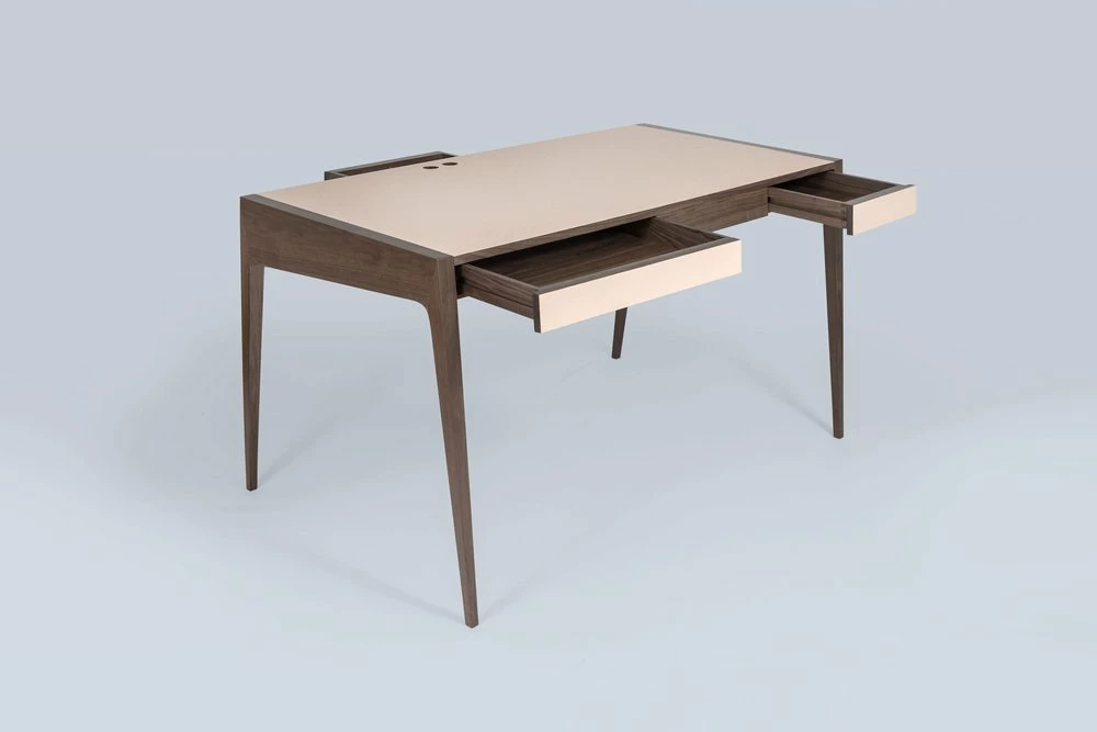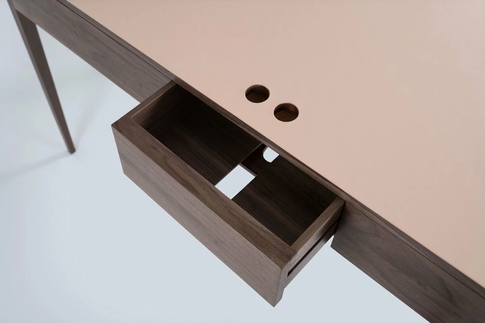 This O- desk is in Walnut wood, the top and the drawer covers are in Forbo Linoleum colour 4185 powder .