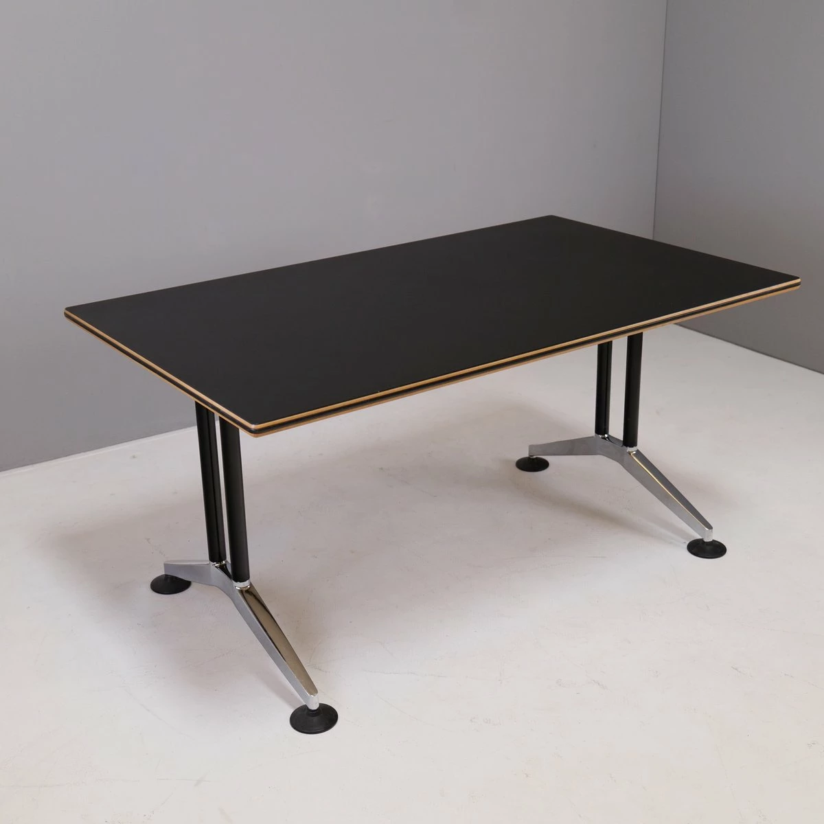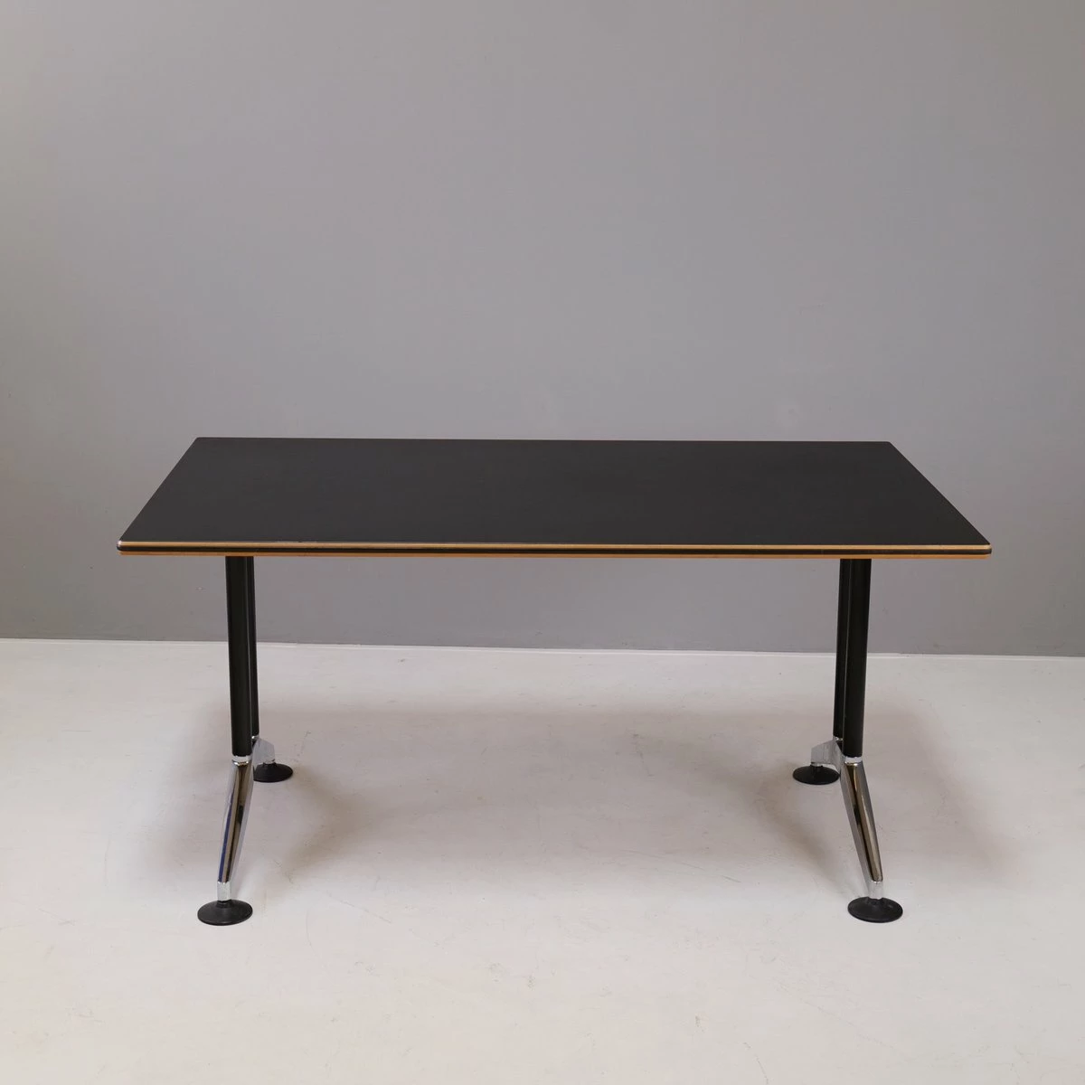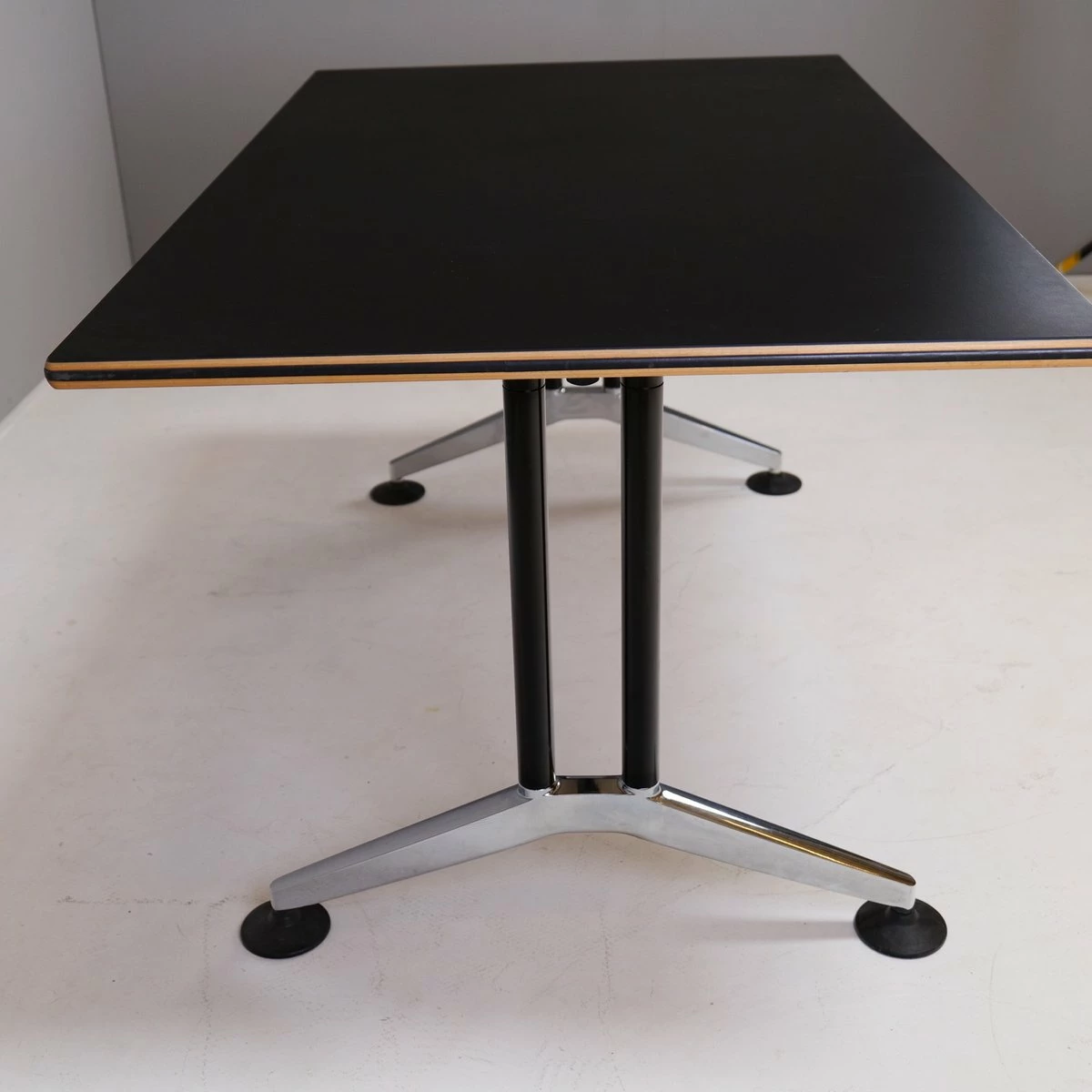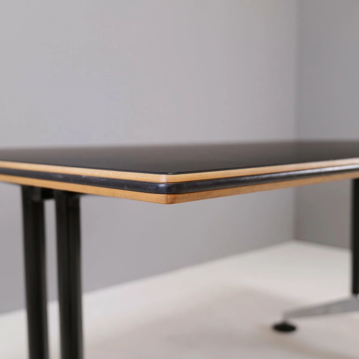 Sporing stick panel with an all-round plywood circuit and integrated, shock-elastic, black polypropylene profile. Surfaces: Layer according to Wilkhahn classic pattern card. Ribble made of beech layer, nature oiled.