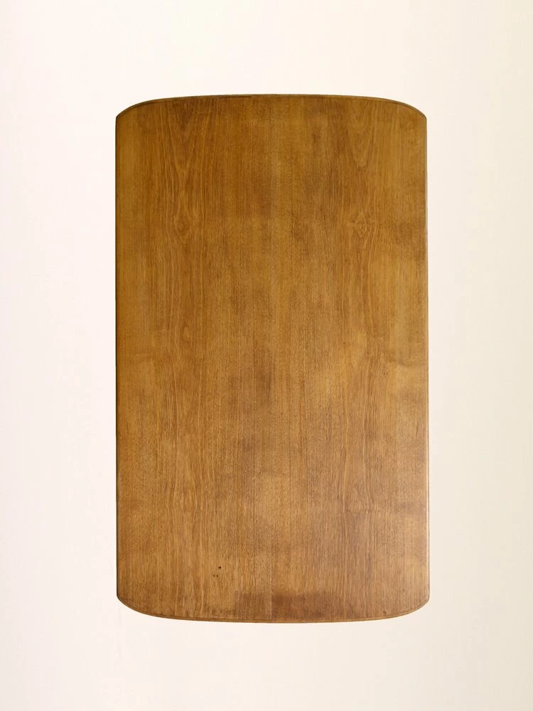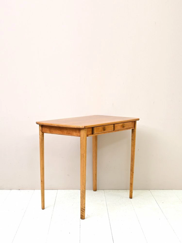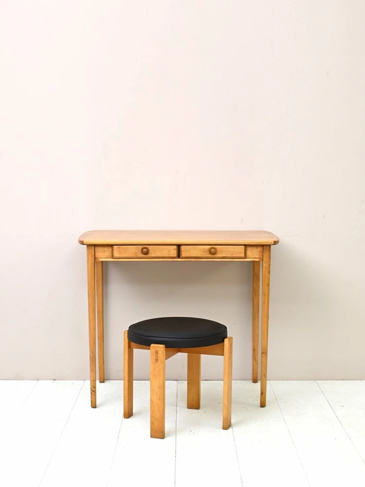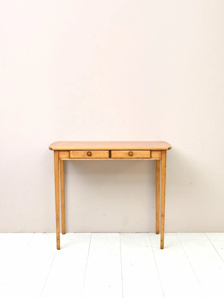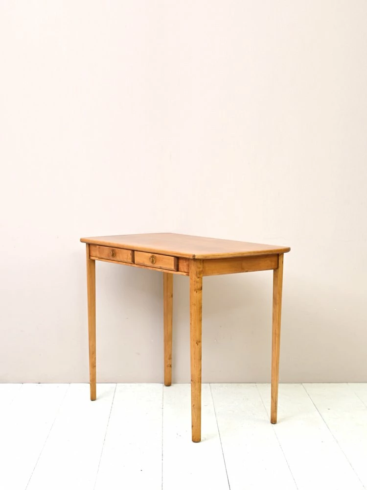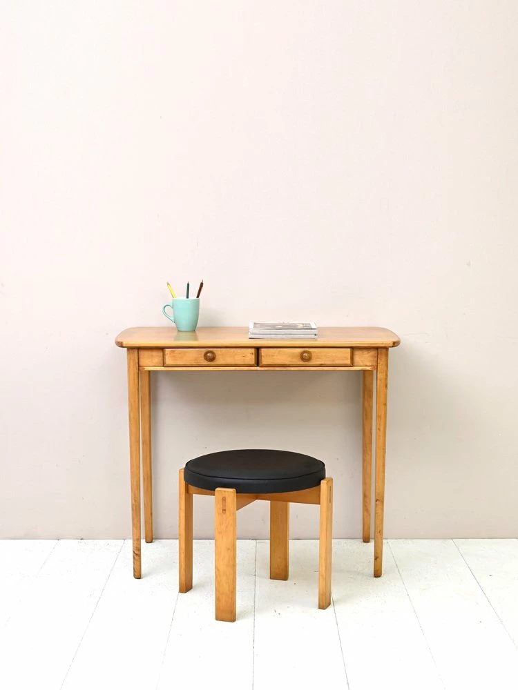 A desk with small size that stands out for the plane from the rounded sides and for the long rake legs.