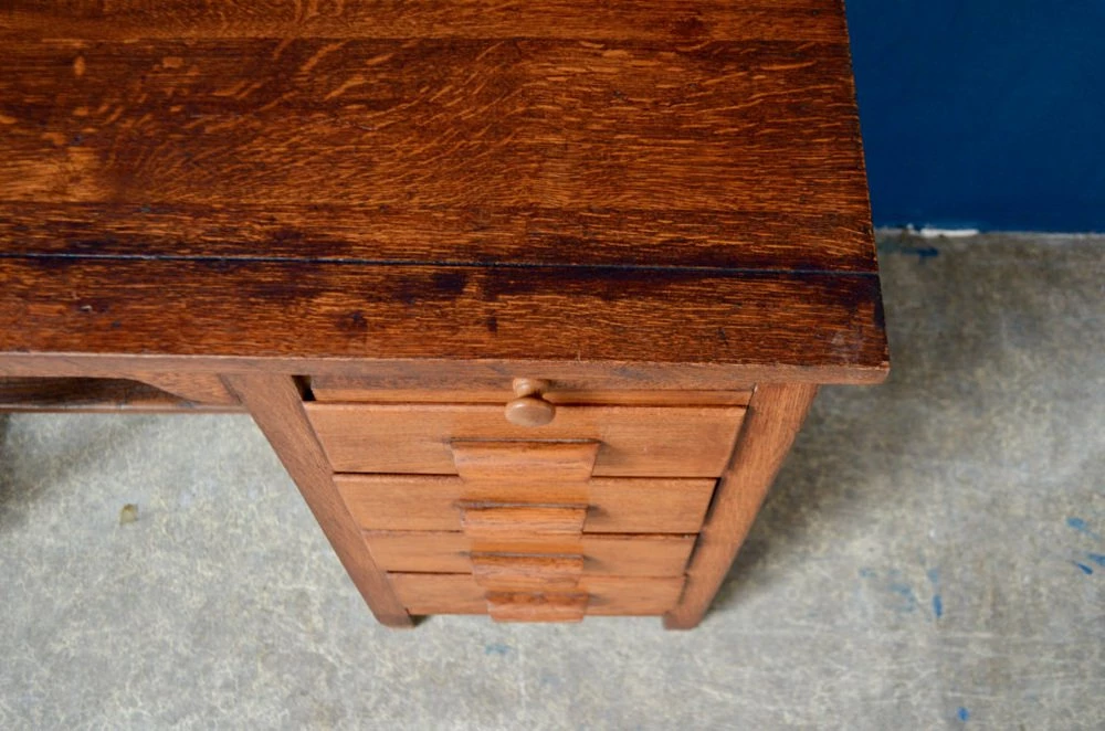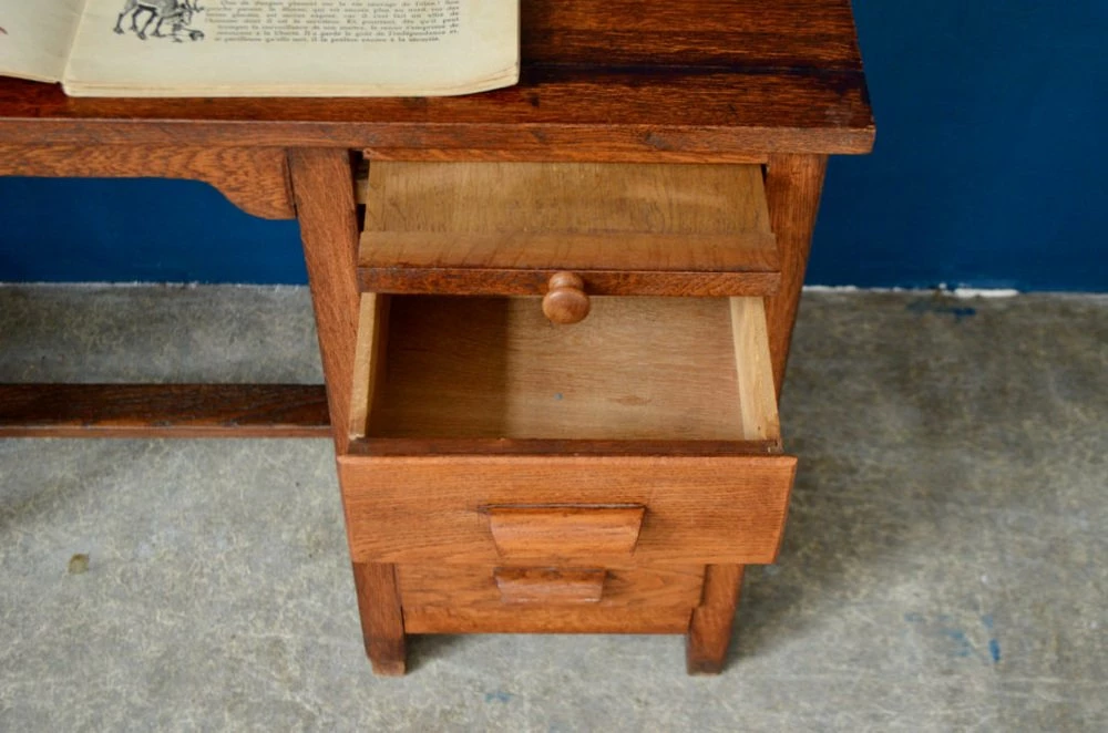 The office presents very practical, compact proportions. It is space -saving. The wood is dark and patinated. The office is functional. It has been used and shows traces of use, especially on the set.