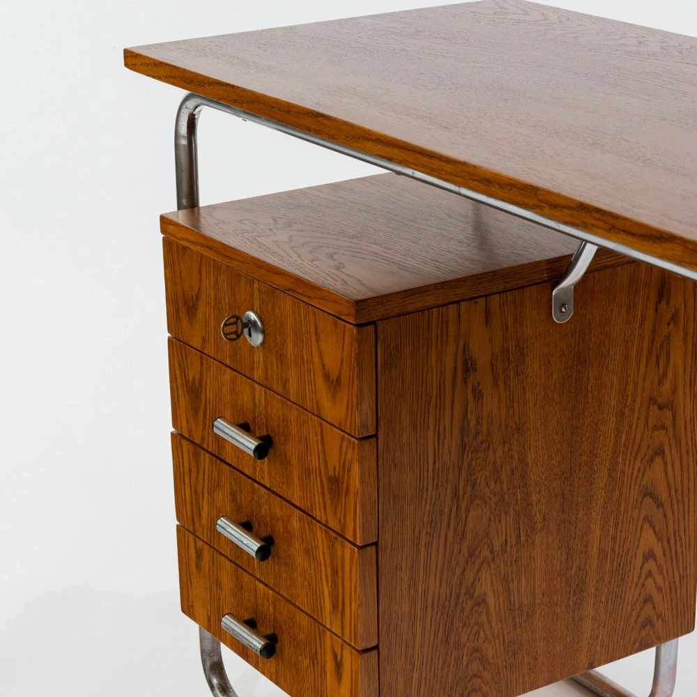 The container and the worktop are veneered made of carpenter plate. The surfaces are hand polished with shellac. The first drawer is closed. The frame was made from chrome -plated steel tube.