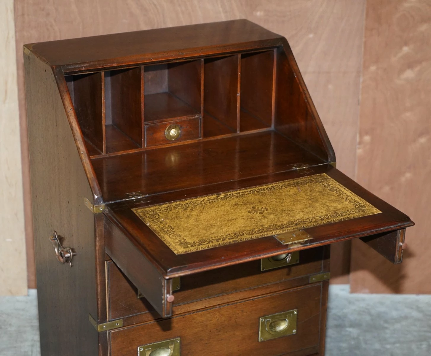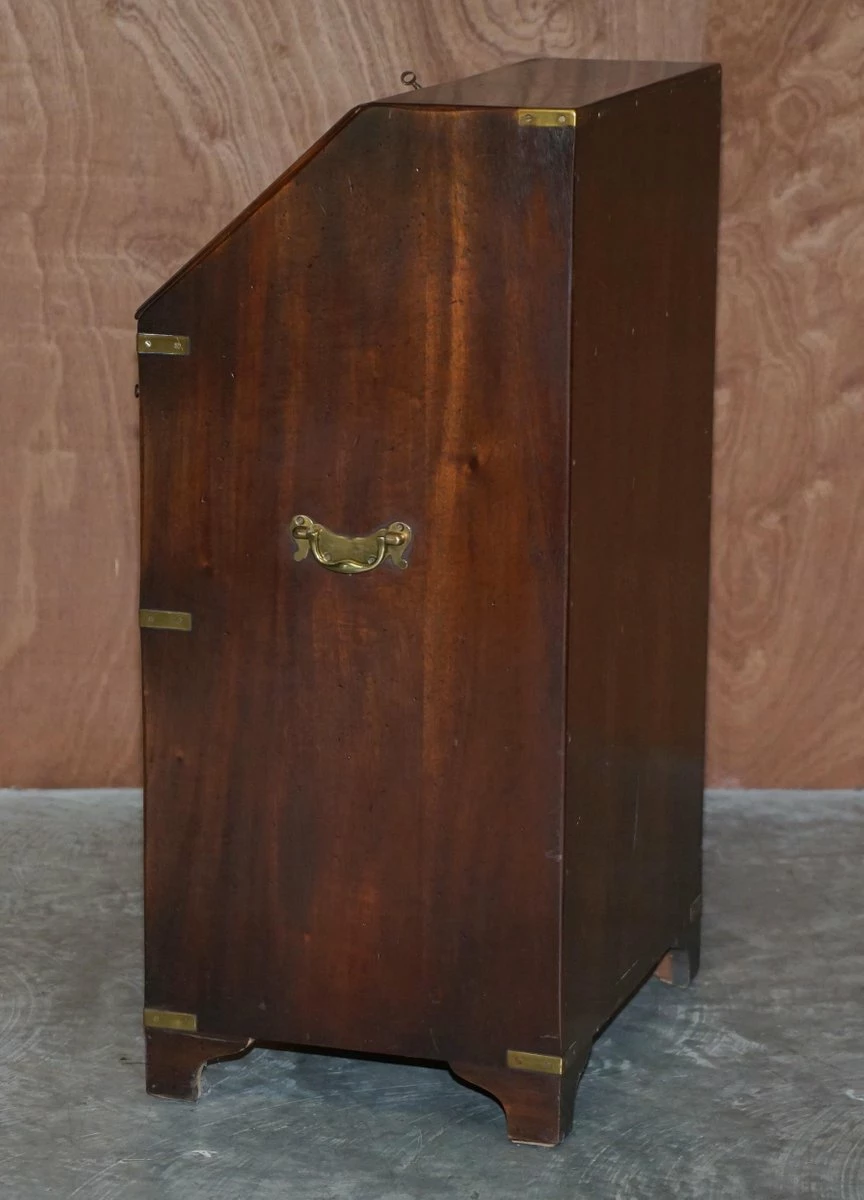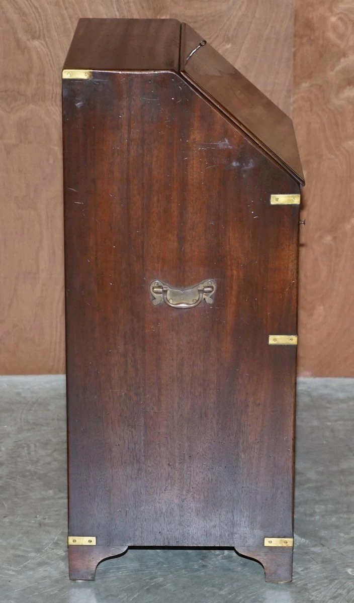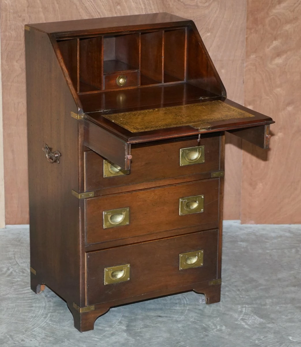 We are delighted to offer this lovely small R.E.H Kennedy made, Harrods London retailed military campaign bureau desk in mahogany with brass fittings A good looking and well made piece. This is ideally suited as a workstation for a compact area. It has a lovely drop flap front which doubles as a writing surface which has been upholstered in gold leaf tooled green leather This was made by Kennedy who specialise in military campaign furniture and retail through Harrods as mentioned. Kennedy were Harrods oldest concession, they retailed with them for over 87 years Condition wise, we have cleaned waxed and polished it from top to bottom, it will have normal age and use related patina marks, there are also some marks to the top Dimensions Height:- 94cm Width:- 53cm Depth:- 40.5cm Please note all measurements are taken at the widest point. Condition Please view the very detailed pictures as they form part of the description pertaining to the condition. Please note vintage period and original items such as leather seating will always have natural patina in the form of creasing and wear, we recommend annual waxing to ensure no moisture is lost, also hand dyed leather is not recommended to sit in direct sunlight for prolonged periods of time as it will dry out and fade.