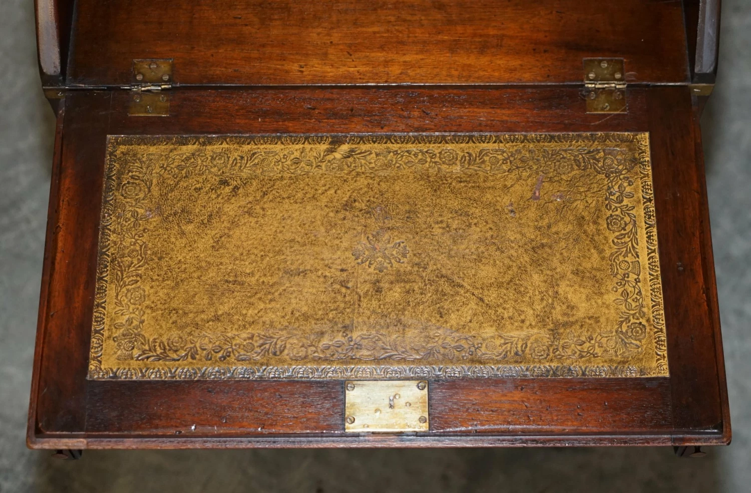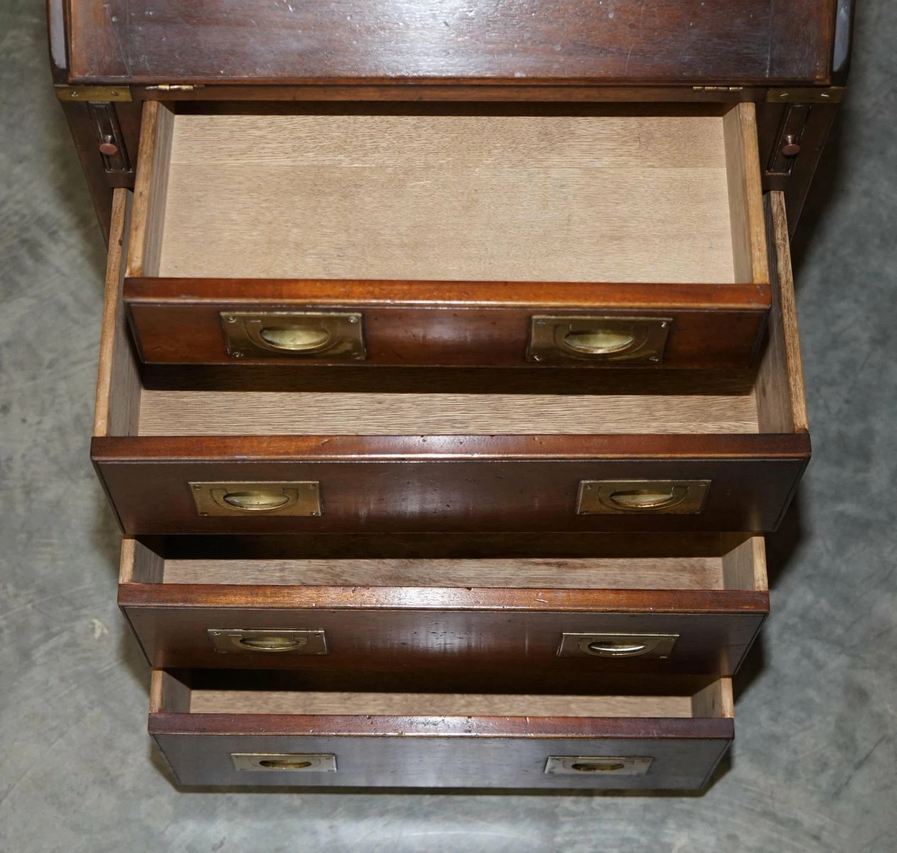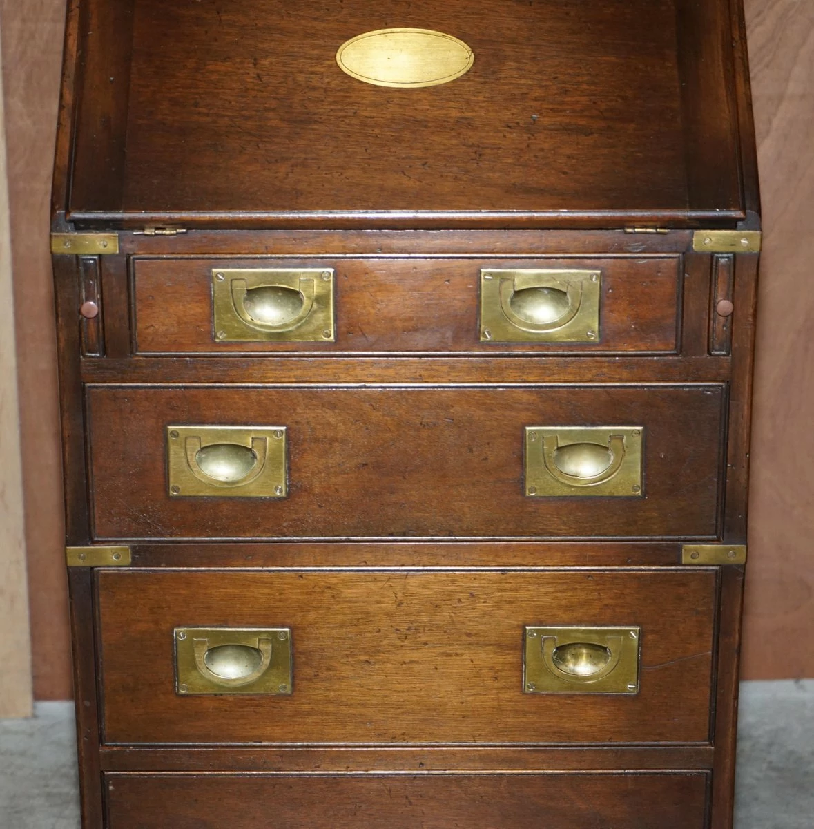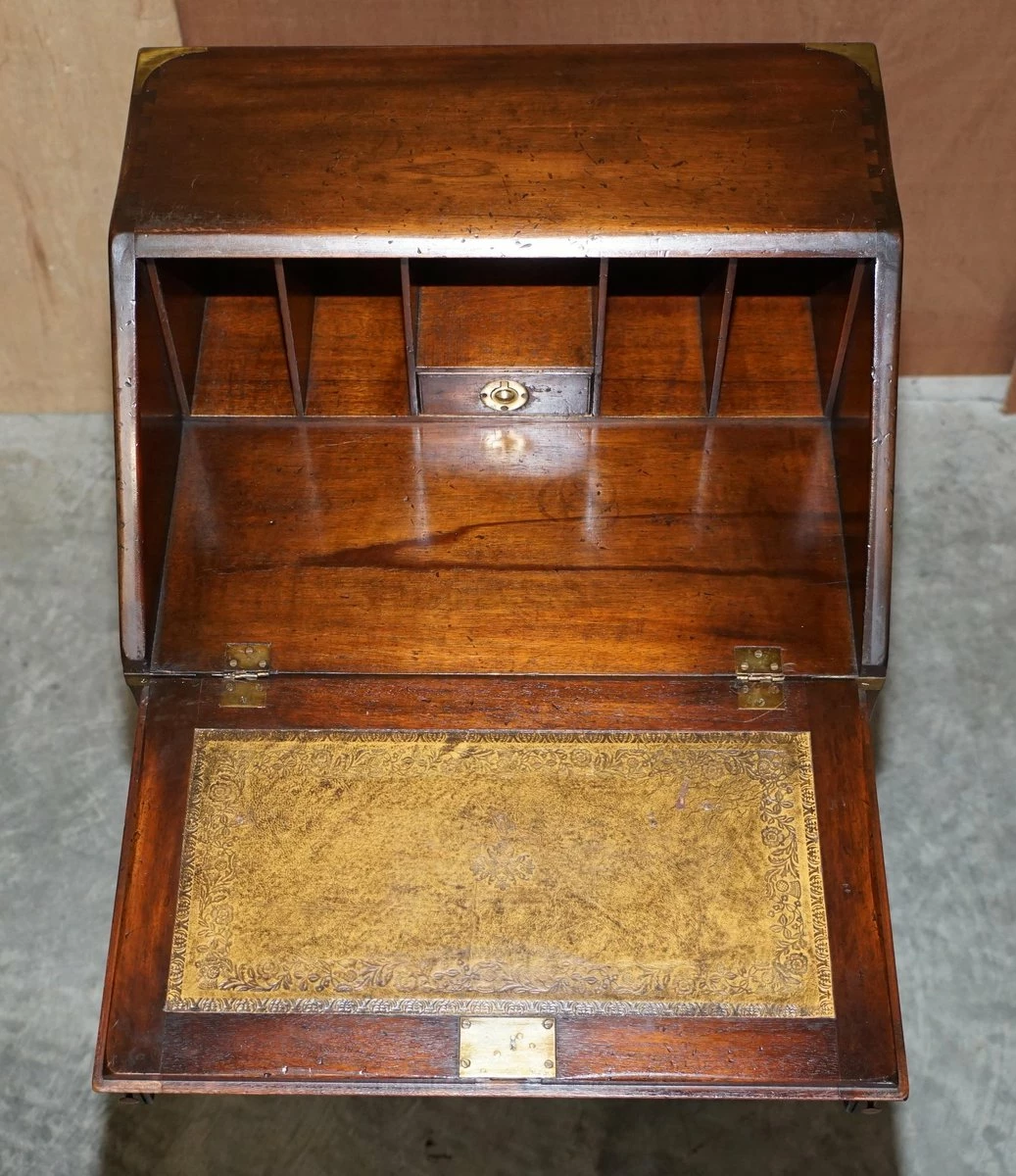 We are delighted to offer this lovely small R.E.H Kennedy made, Harrods London retailed military campaign bureau desk in mahogany with brass fittings A good looking and well made piece. This is ideally suited as a workstation for a compact area. It has a lovely drop flap front which doubles as a writing surface which has been upholstered in gold leaf tooled green leather This was made by Kennedy who specialise in military campaign furniture and retail through Harrods as mentioned. Kennedy were Harrods oldest concession, they retailed with them for over 87 years Condition wise, we have cleaned waxed and polished it from top to bottom, it will have normal age and use related patina marks, there are also some marks to the top Dimensions Height:- 94cm Width:- 53cm Depth:- 40.5cm Please note all measurements are taken at the widest point. Condition Please view the very detailed pictures as they form part of the description pertaining to the condition. Please note vintage period and original items such as leather seating will always have natural patina in the form of creasing and wear, we recommend annual waxing to ensure no moisture is lost, also hand dyed leather is not recommended to sit in direct sunlight for prolonged periods of time as it will dry out and fade.