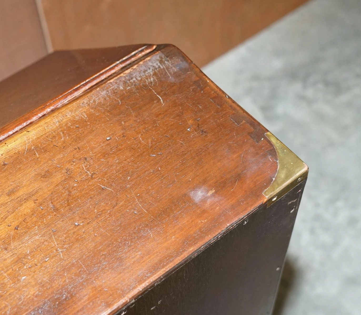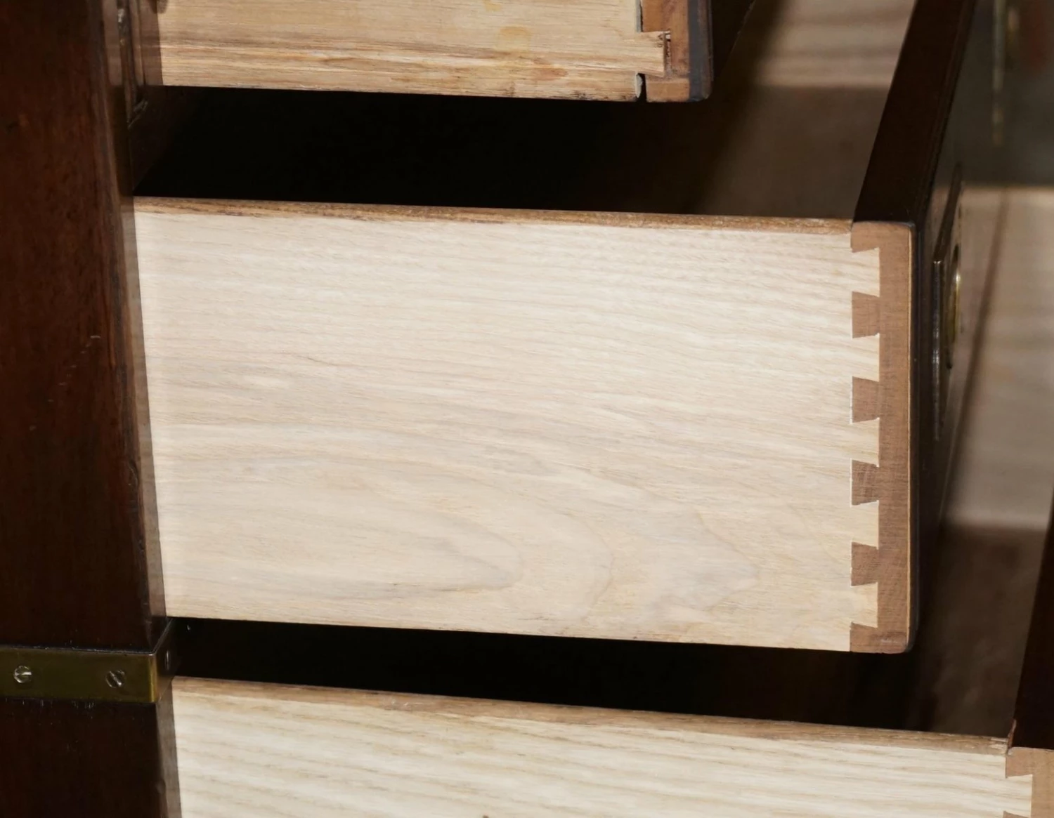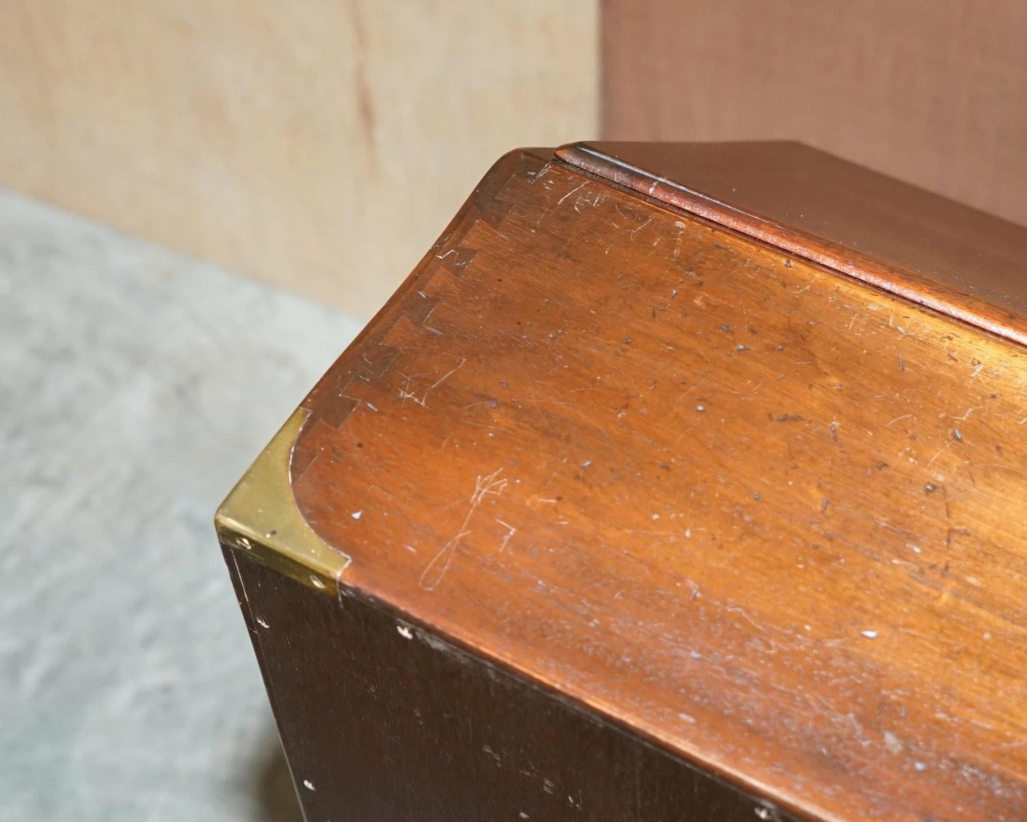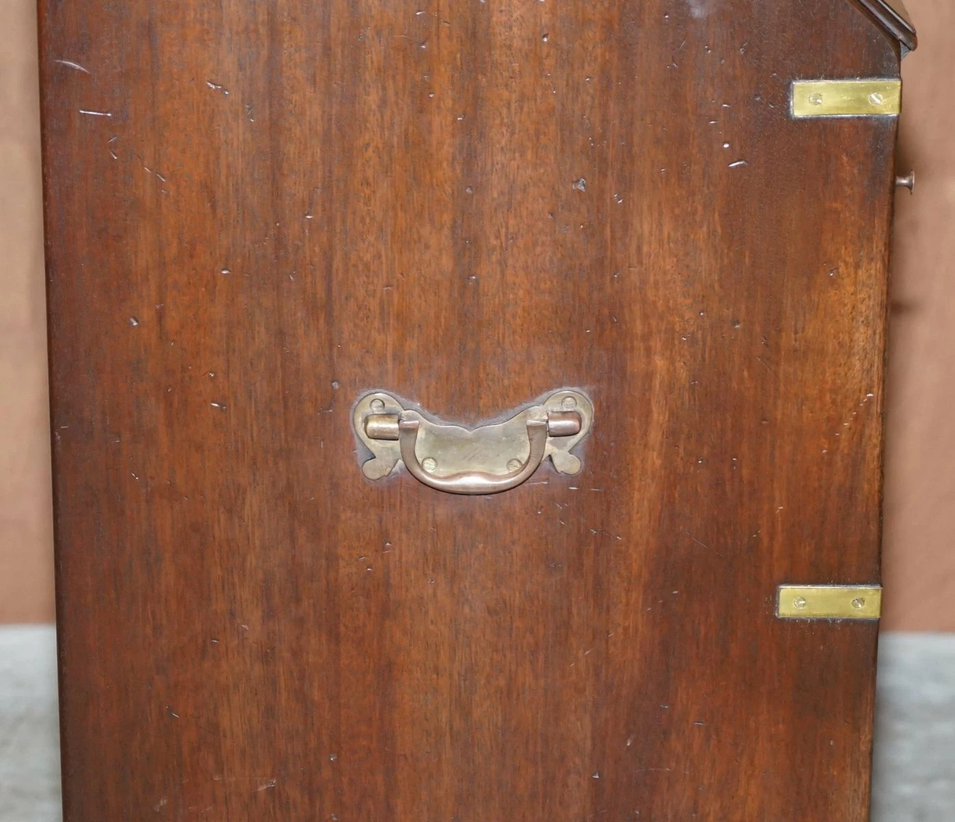 We are delighted to offer this lovely small R.E.H Kennedy made, Harrods London retailed military campaign bureau desk in mahogany with brass fittings A good looking and well made piece. This is ideally suited as a workstation for a compact area. It has a lovely drop flap front which doubles as a writing surface which has been upholstered in gold leaf tooled green leather This was made by Kennedy who specialise in military campaign furniture and retail through Harrods as mentioned. Kennedy were Harrods oldest concession, they retailed with them for over 87 years Condition wise, we have cleaned waxed and polished it from top to bottom, it will have normal age and use related patina marks, there are also some marks to the top Dimensions Height:- 94cm Width:- 53cm Depth:- 40.5cm Please note all measurements are taken at the widest point. Condition Please view the very detailed pictures as they form part of the description pertaining to the condition. Please note vintage period and original items such as leather seating will always have natural patina in the form of creasing and wear, we recommend annual waxing to ensure no moisture is lost, also hand dyed leather is not recommended to sit in direct sunlight for prolonged periods of time as it will dry out and fade.