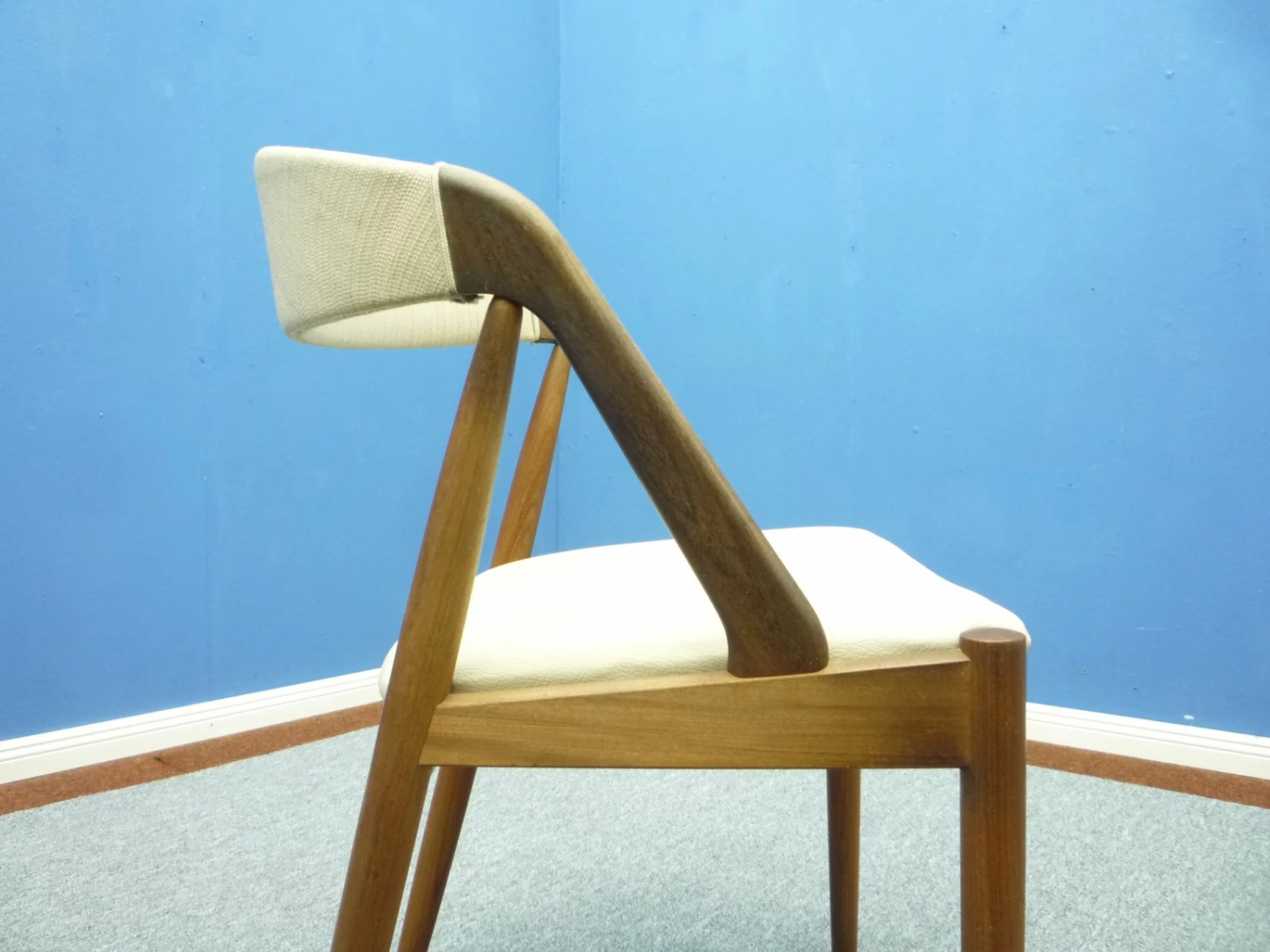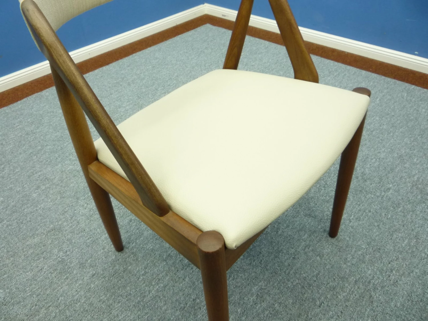 Frame solid teak. Seat has been reupholstered and newly covered with Skaileder.