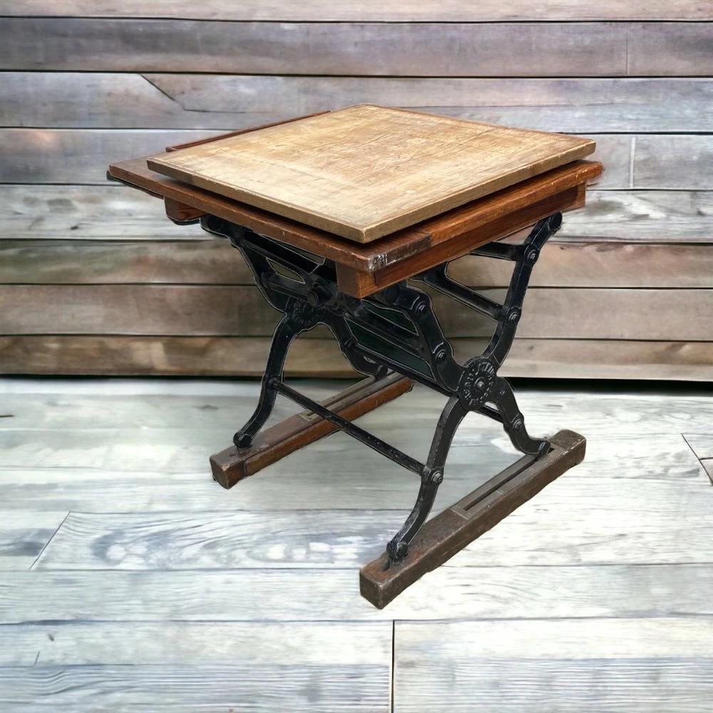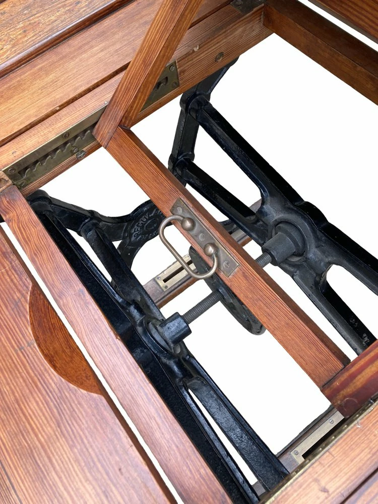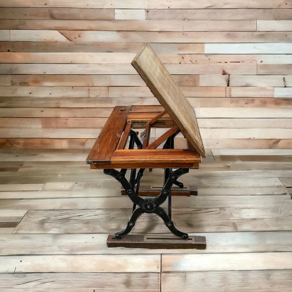 1940’S Vintage Architects, Draftsmans Desk. Solid Teak Top with heavy cast iron base set on wooden runners. Tilting desk top.