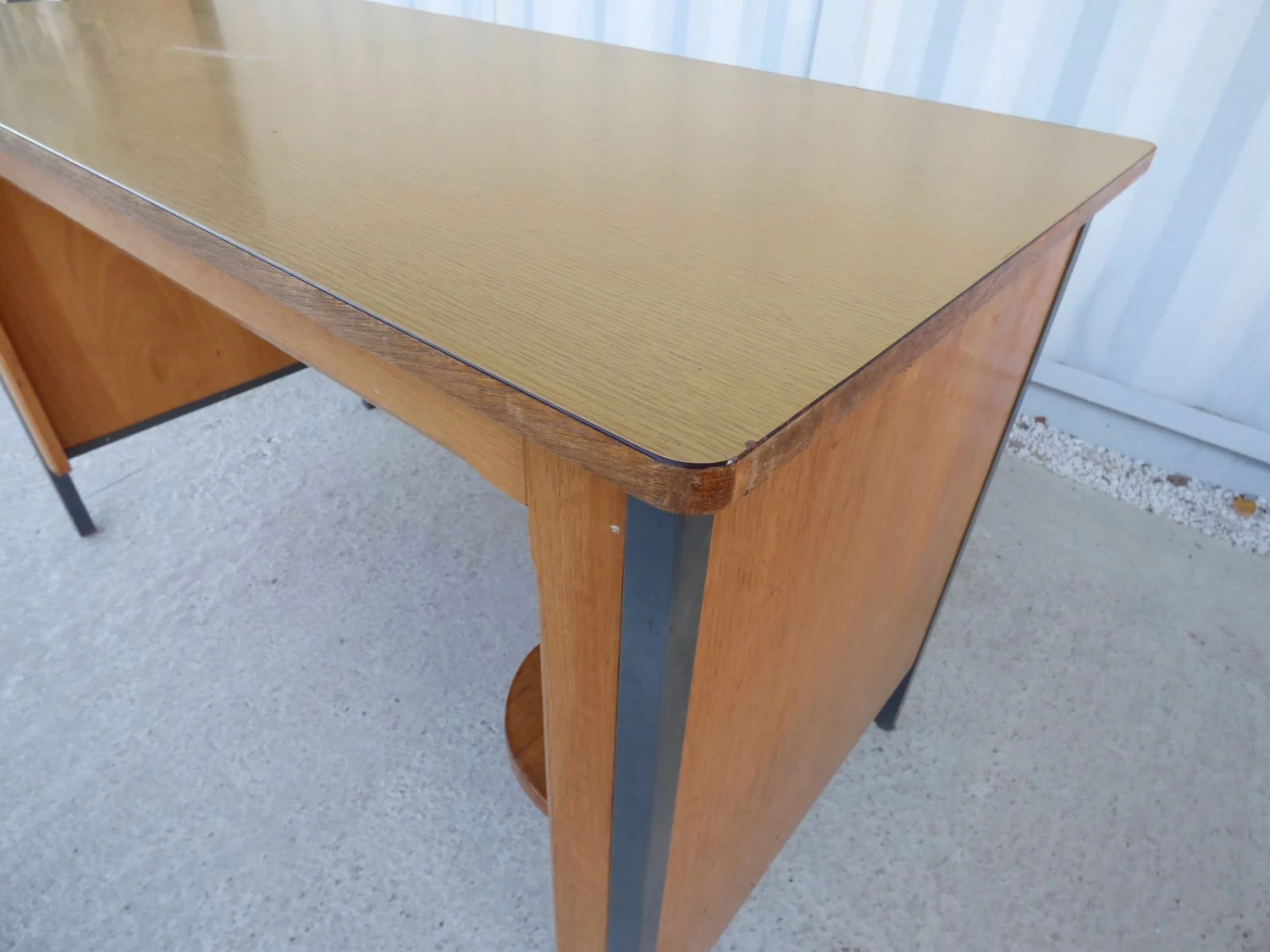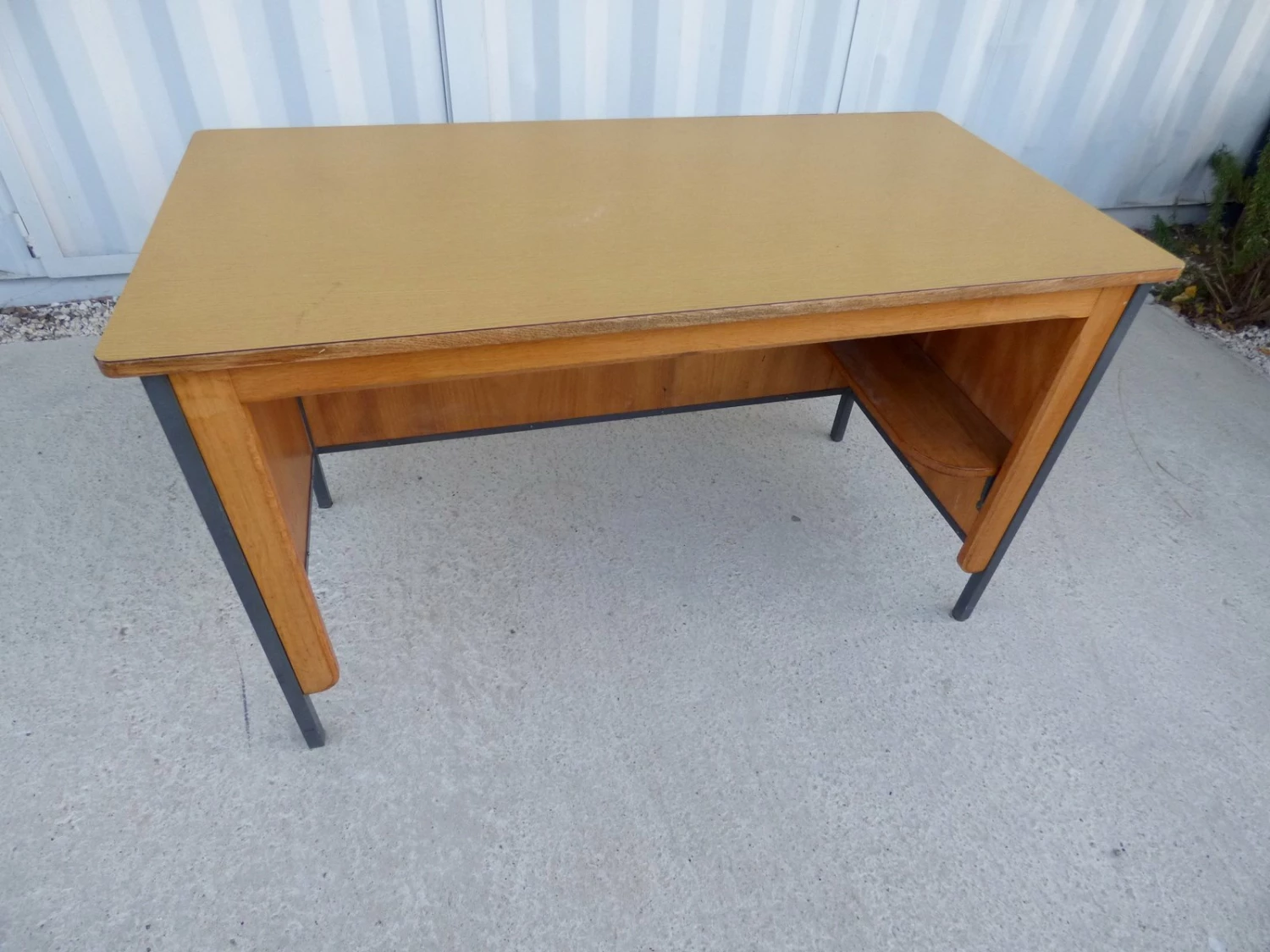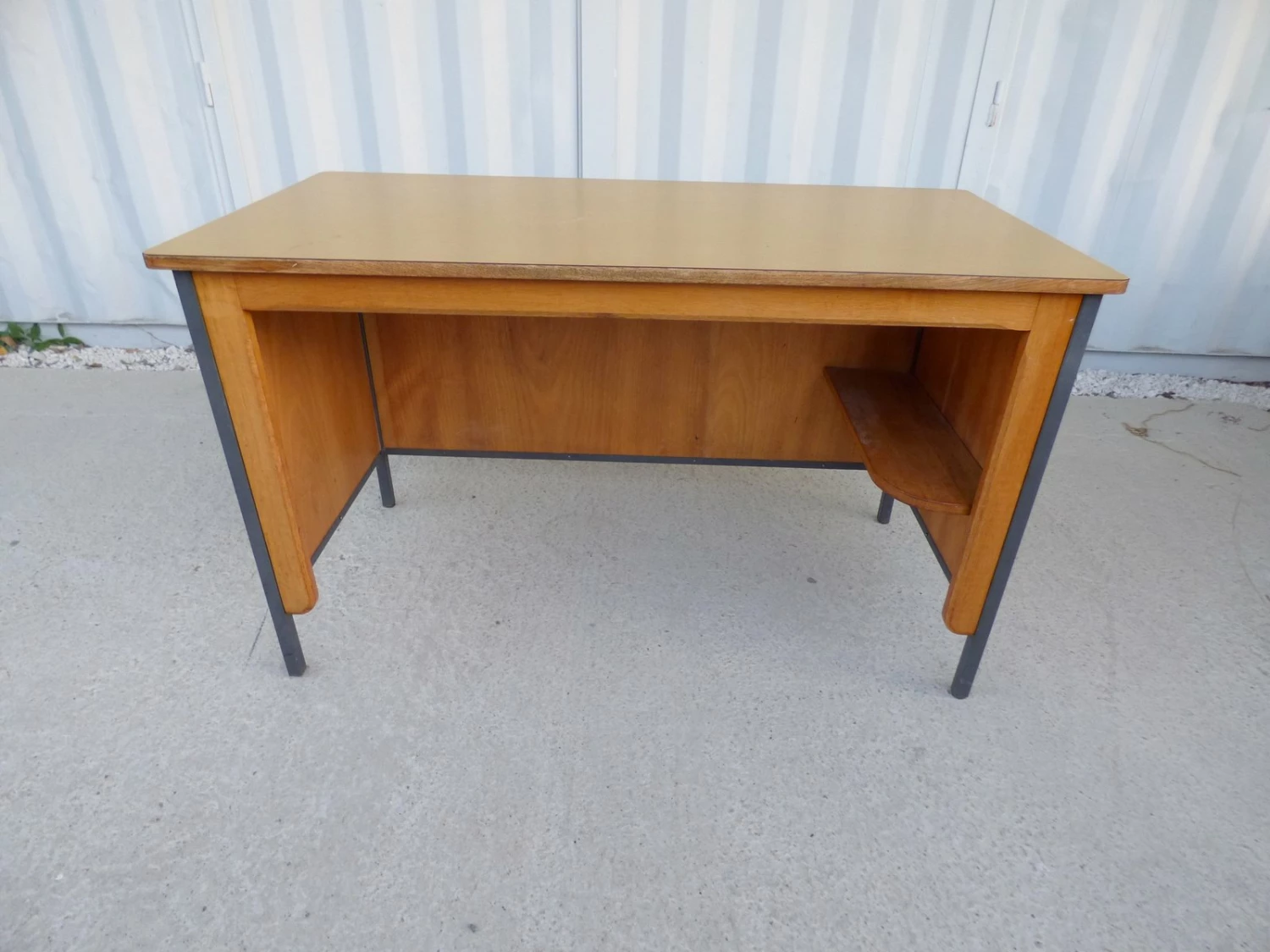 This vintage French office bureau is reminiscent of Jean Prouvé and features a melamine plywood top and interior storage shelf.