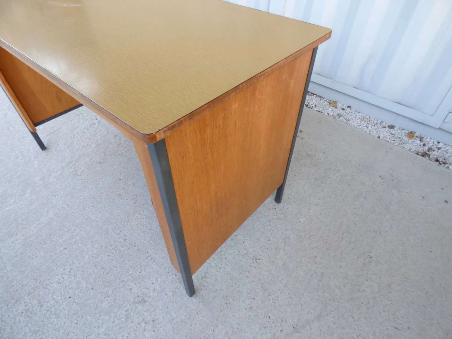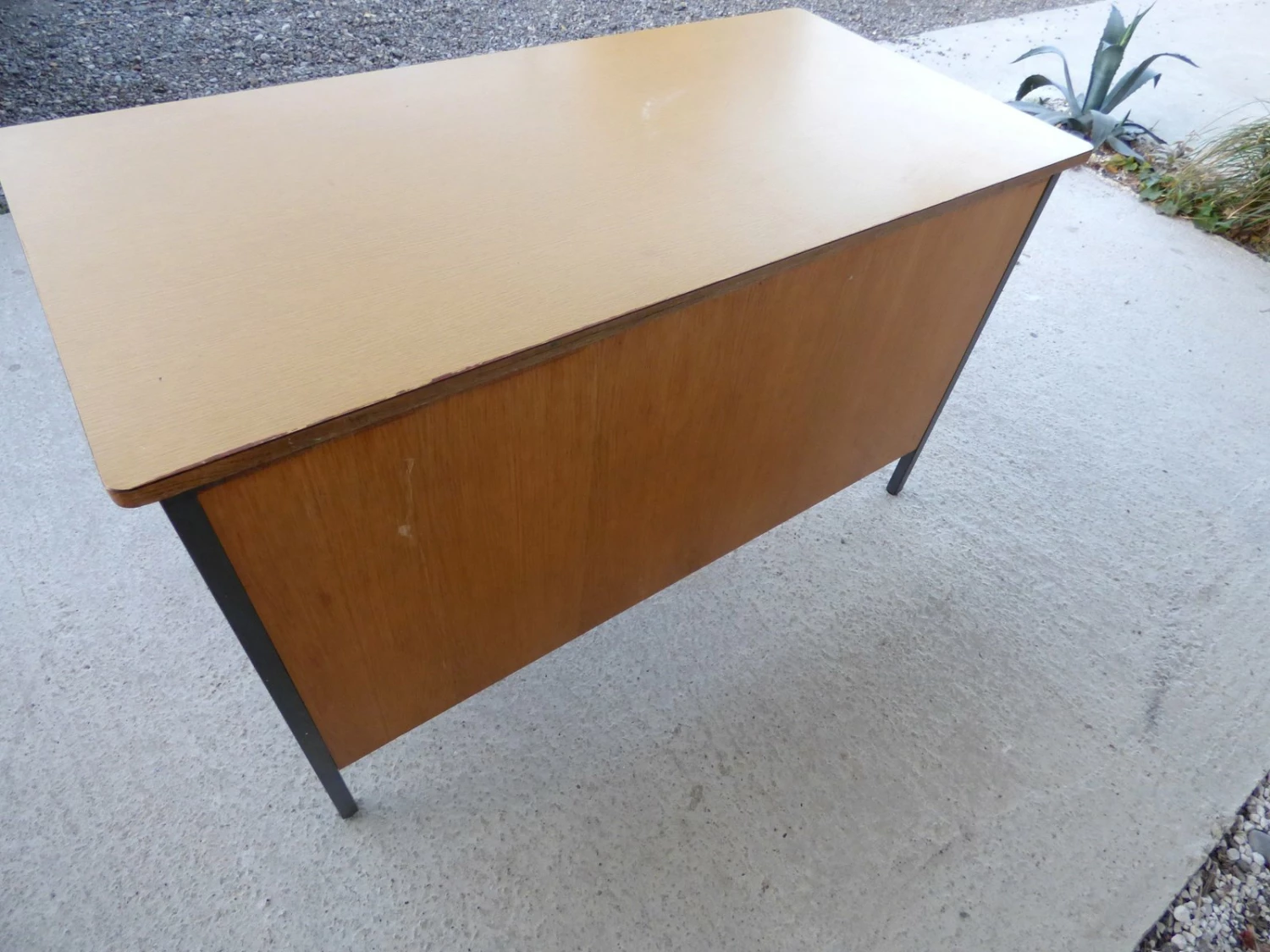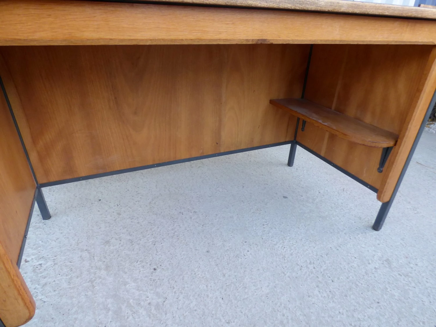 This vintage French office bureau is reminiscent of Jean Prouvé and features a melamine plywood top and interior storage shelf.