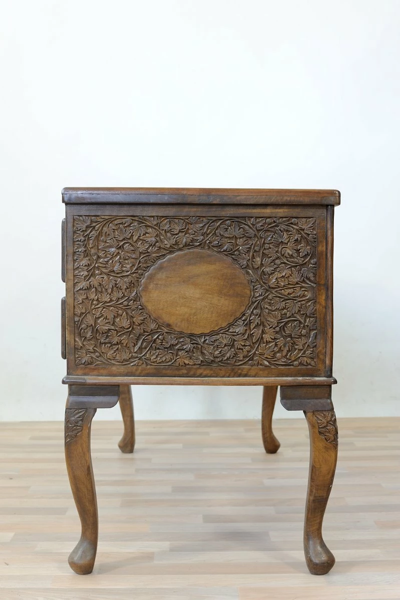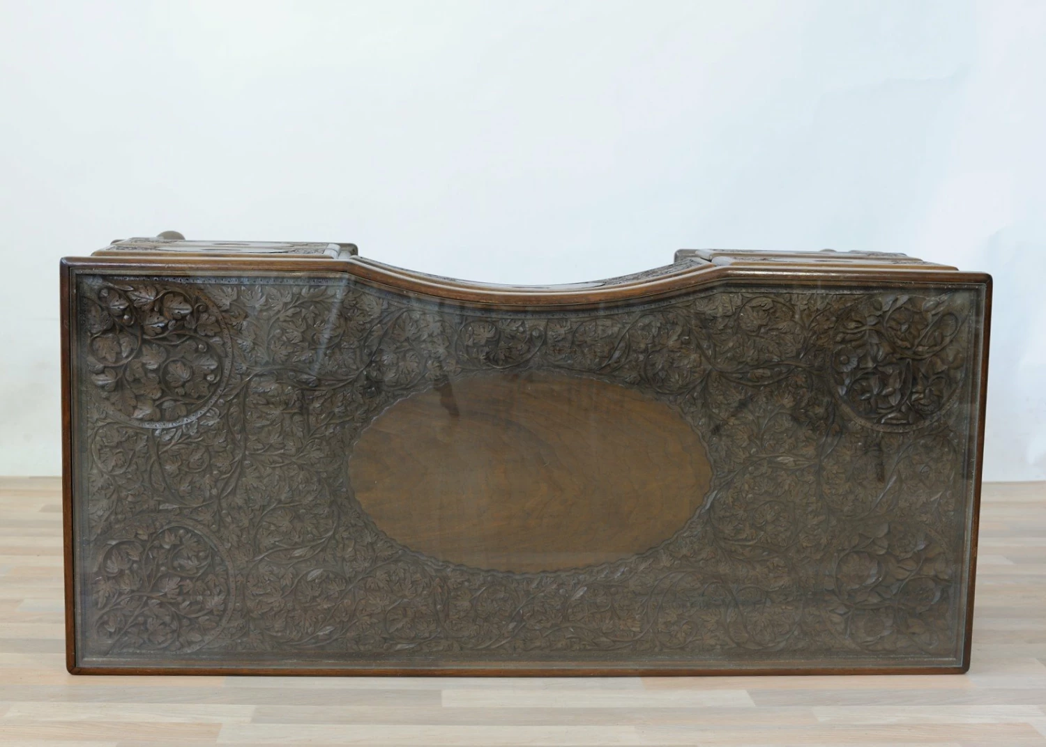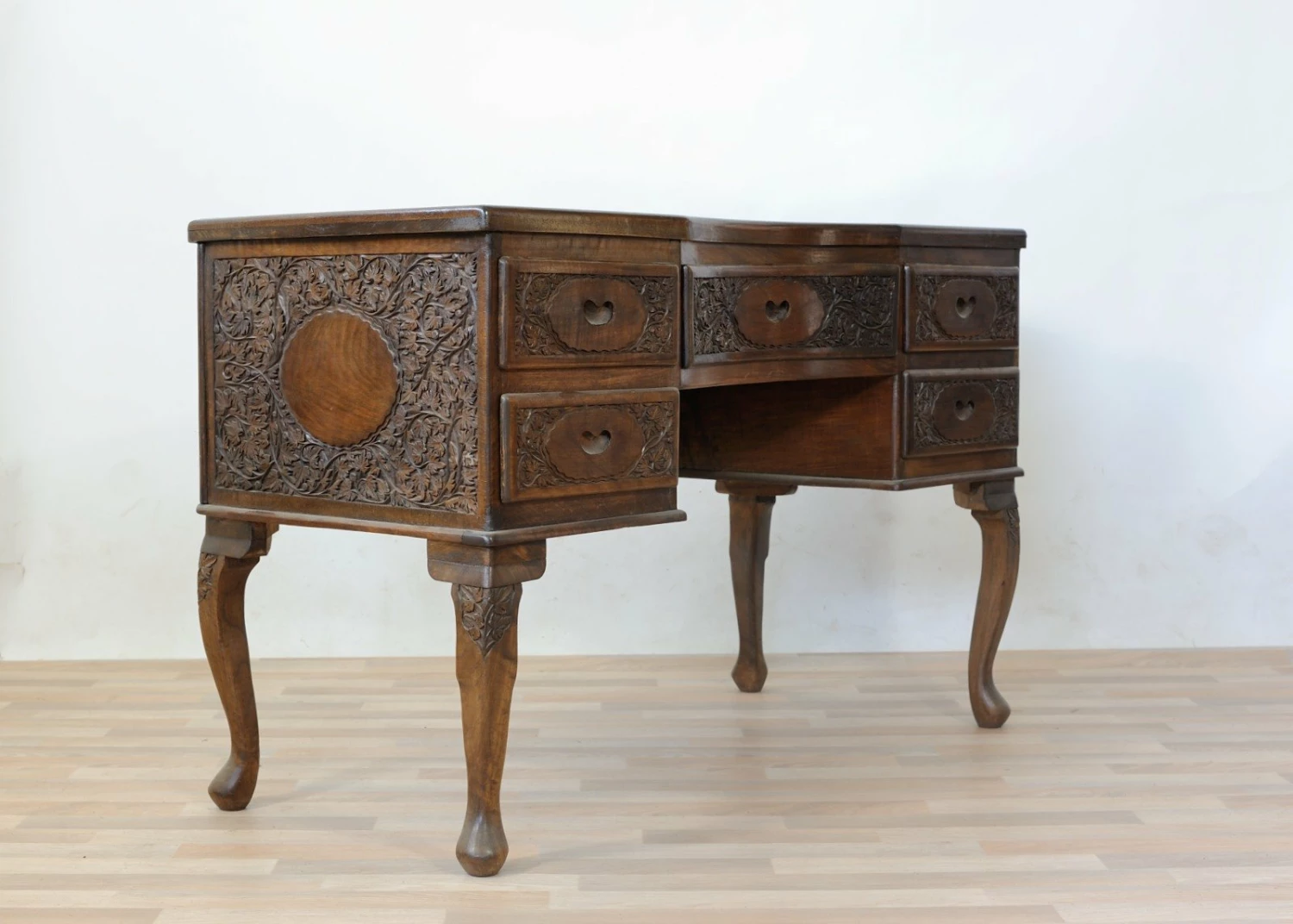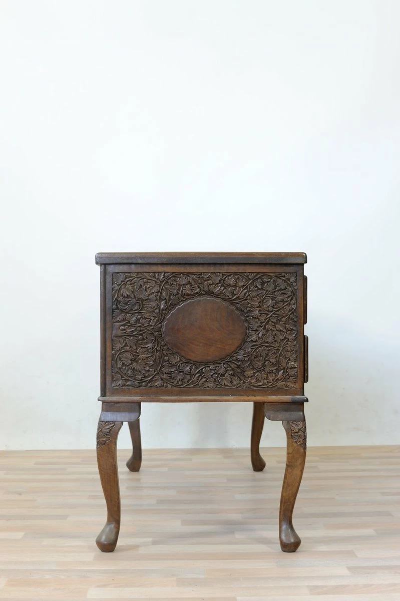 Desk from the center in spaces carved solid walnut on the sides, drawers and piano.Cinque drawers, one central and four drawers arranged on two lateral legs moves and carved files, solid walnut drawer liners, removable crystal plane.