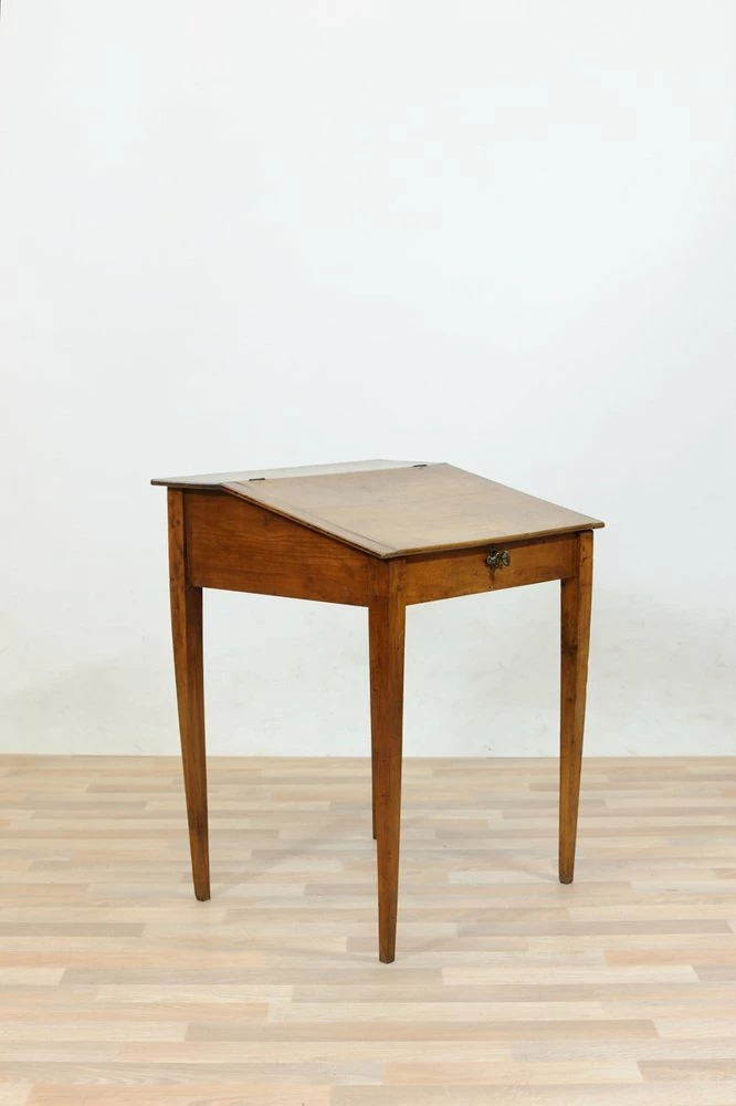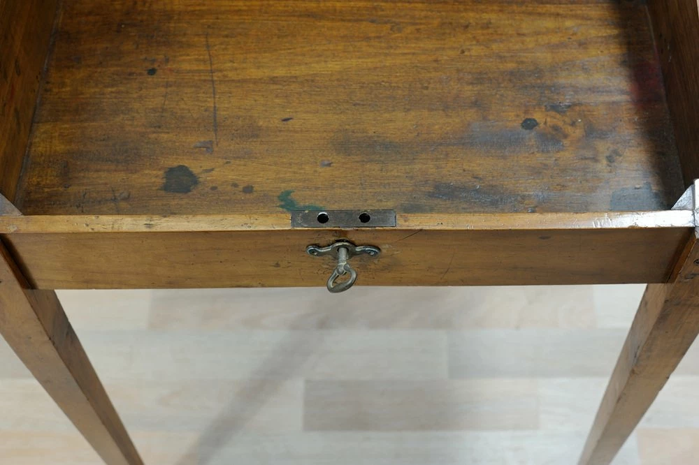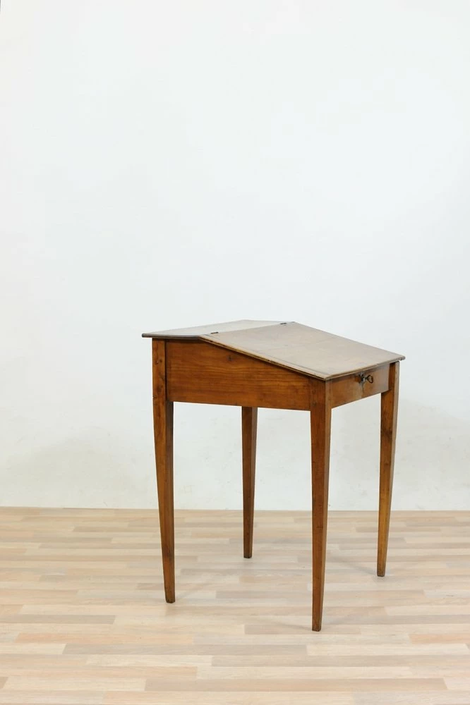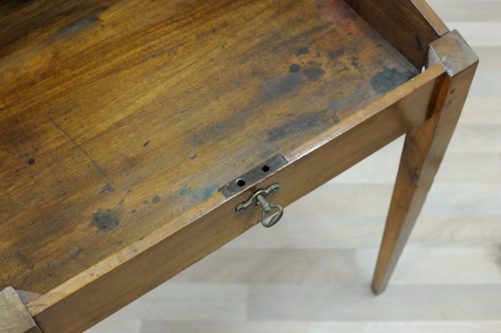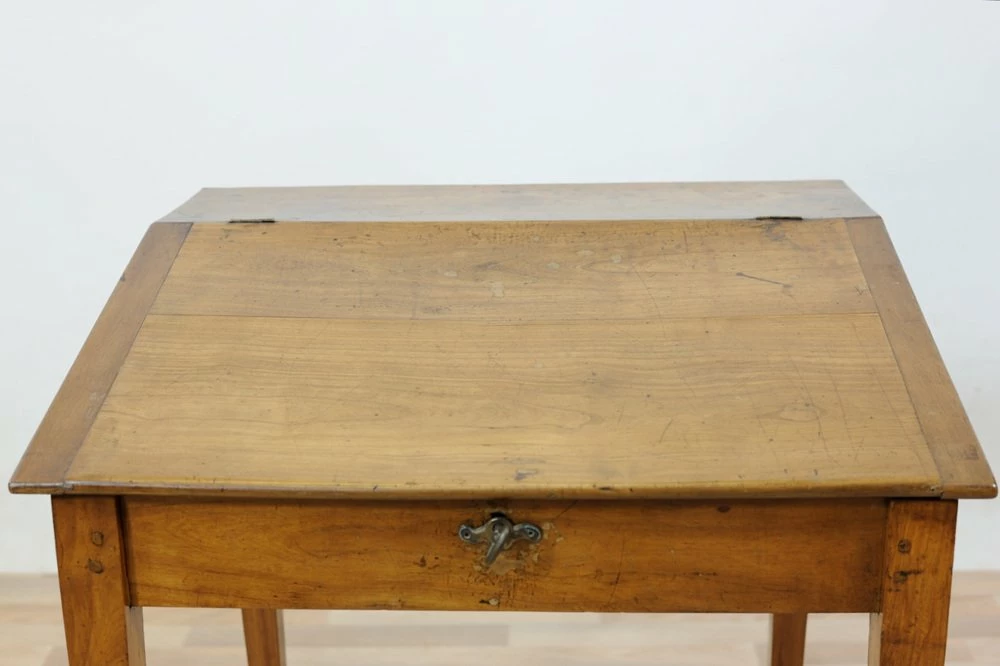 Cherry desk table of the late nineteenth century, stiletto legs. Inclined hinged hinged hinged hippy, locking and key lock, wooden nails in sight on the joints.