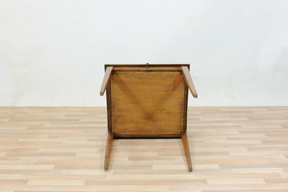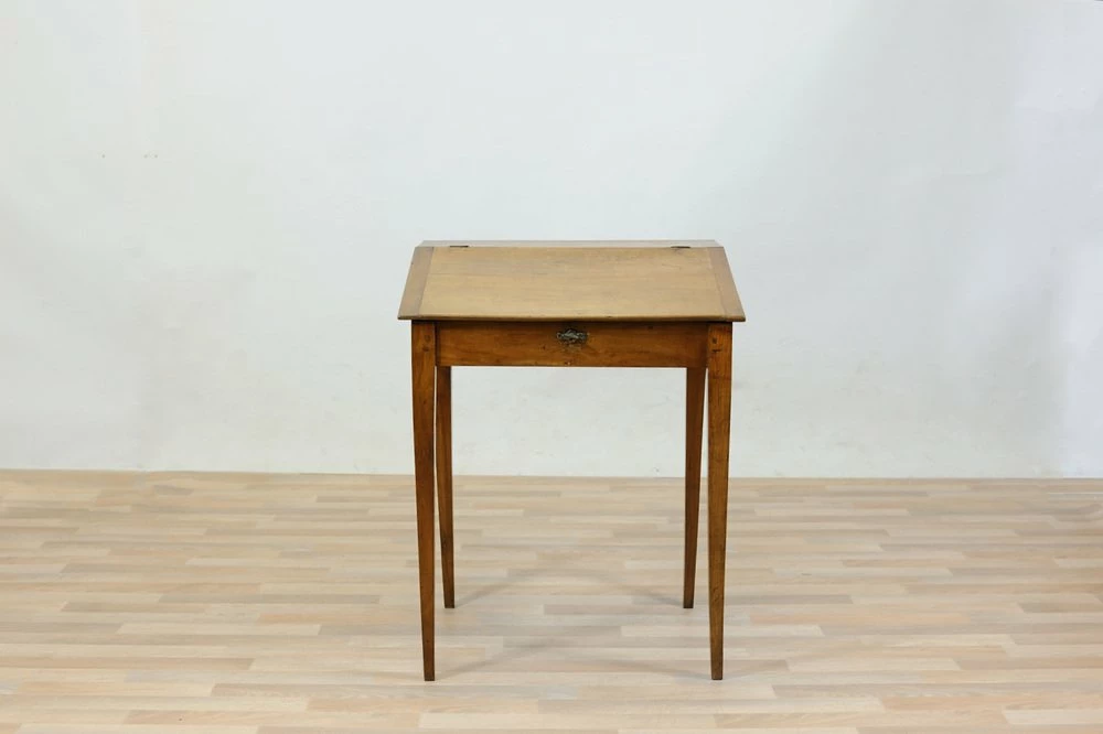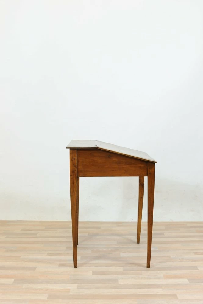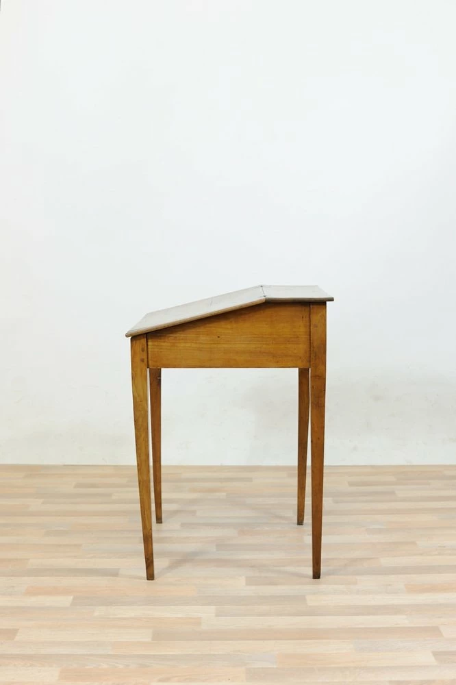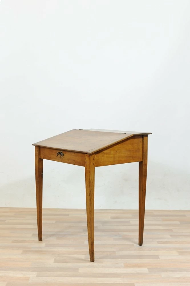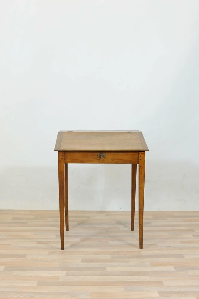 Cherry desk table of the late nineteenth century, stiletto legs. Inclined hinged hinged hinged hippy, locking and key lock, wooden nails in sight on the joints.
